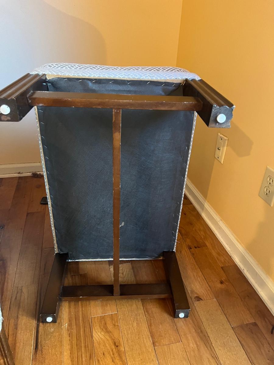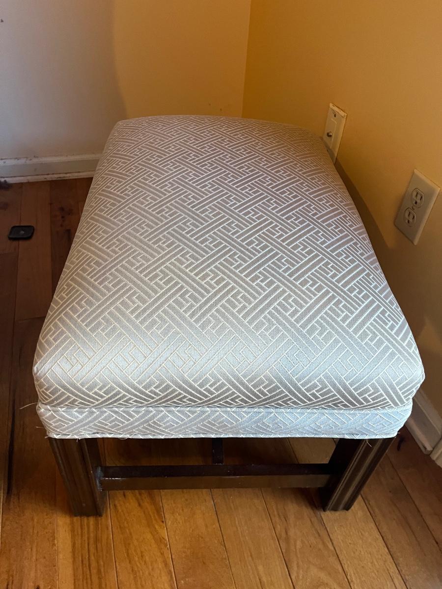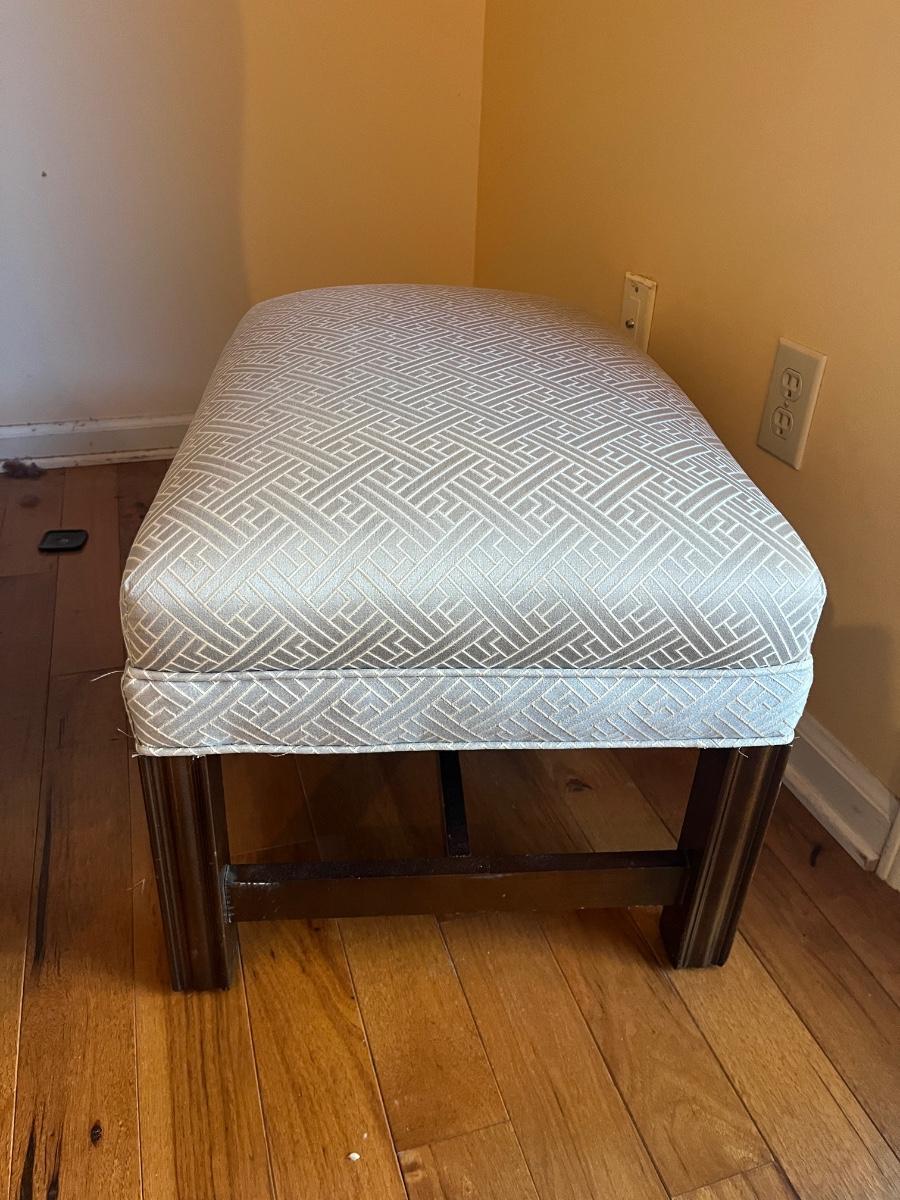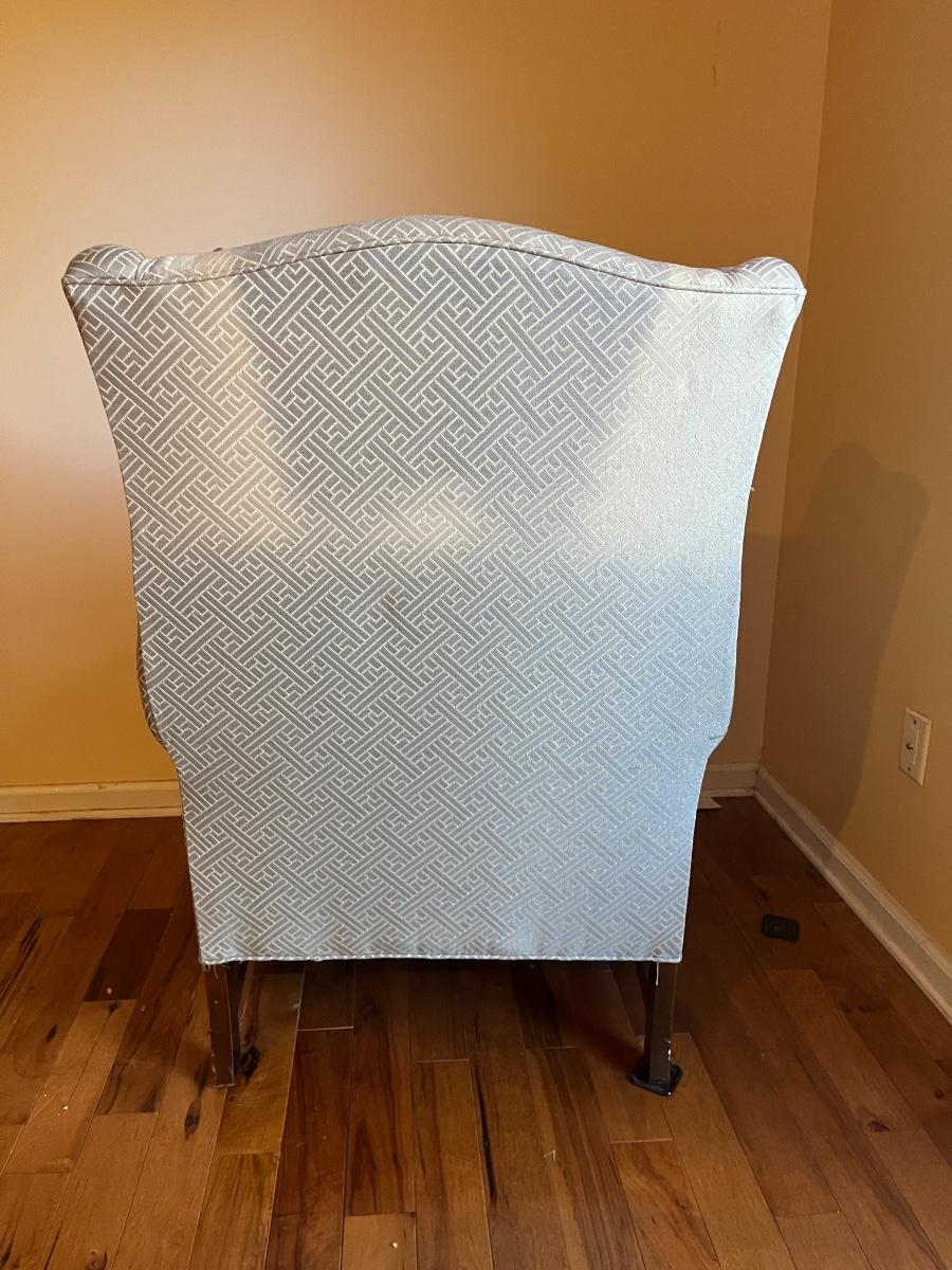 Lot includes an upholstered wingback chair with ottoman. Chair measures 31” x 32” x 43”H with a seat height of 18.5”. Chair has sun bleaching, see pictures; the original color is blue and has faded to more a blue/gray color.