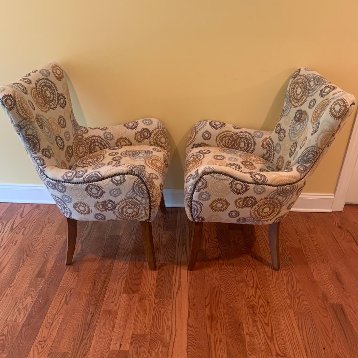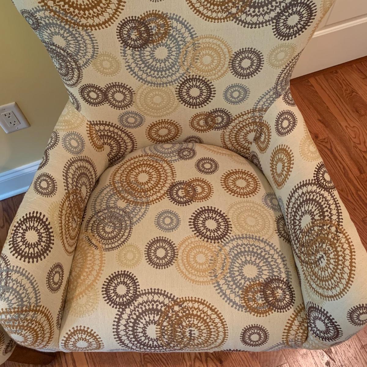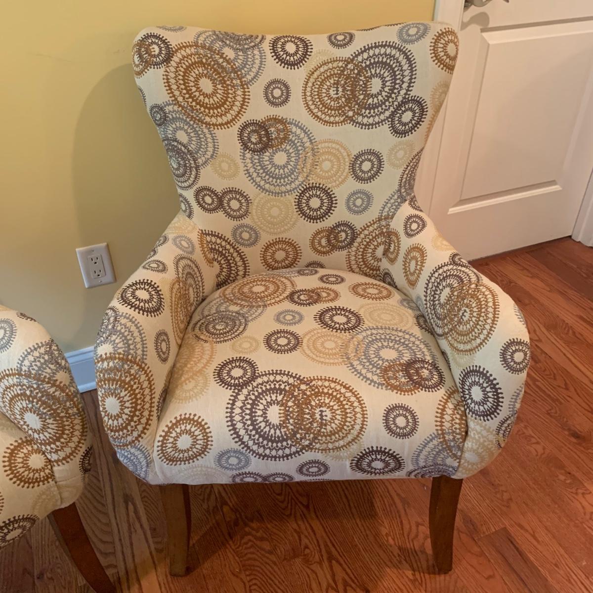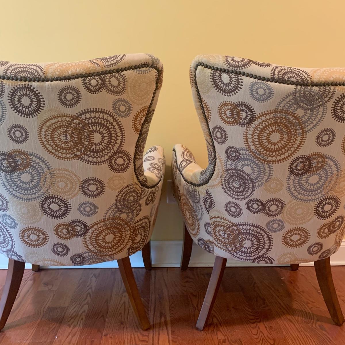 Two upholstered wingback chairs with tapered wooden legs, by Coaster Fine Furniture. Chairs measure, 27” x 25” x 37” with a seat height of 21”. Please note that a leg on one of the chairs will need to be tightened. Local pickup only.
