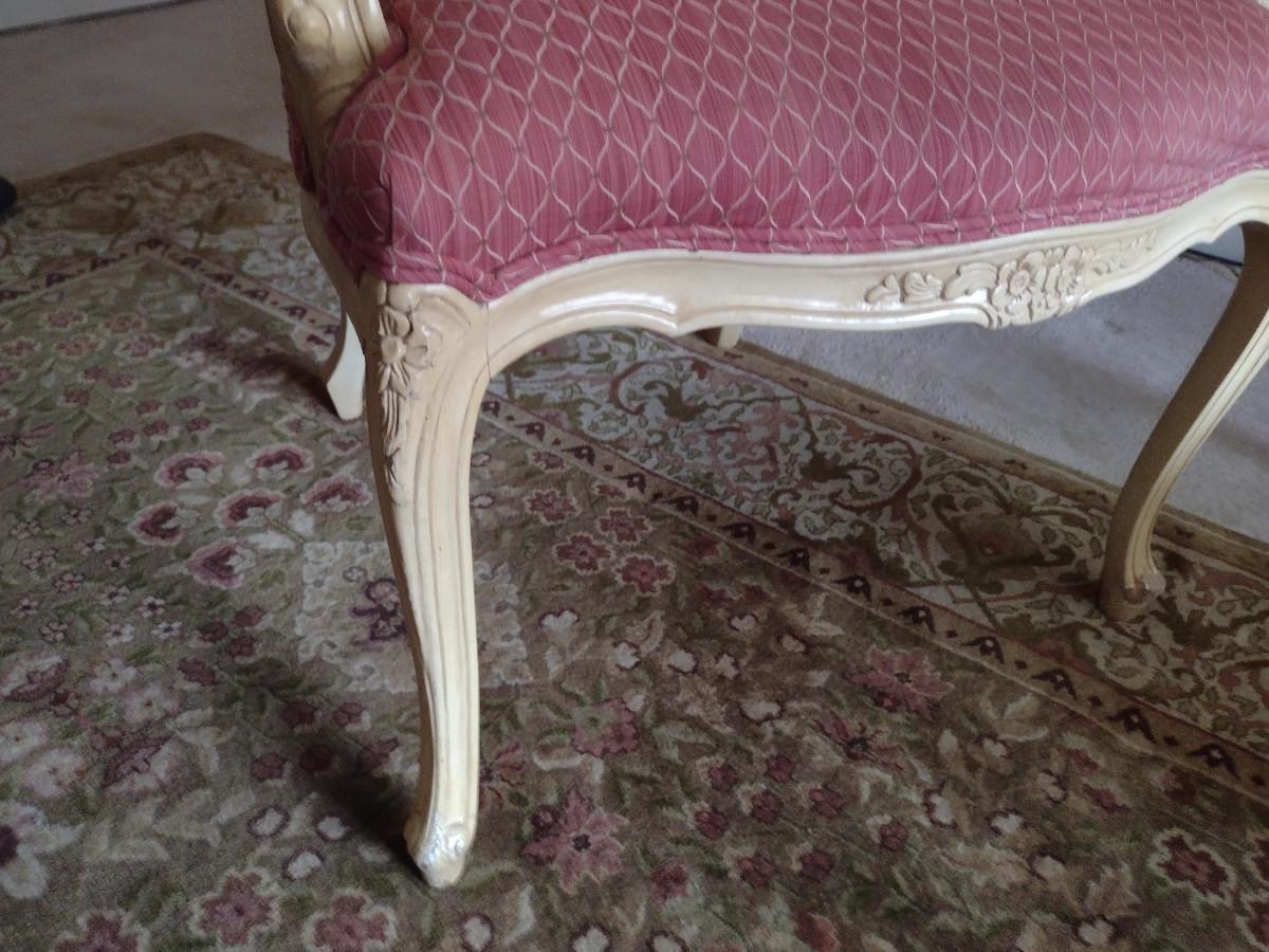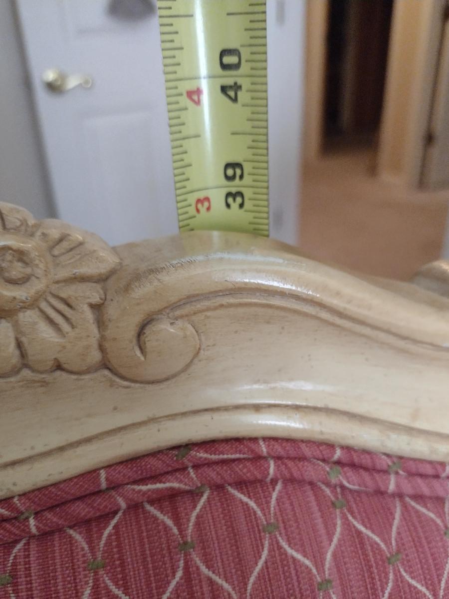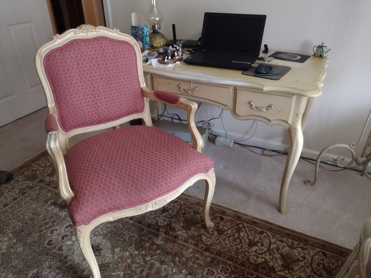 Upholstered Wood Frame Accent/Desk Chair- Approx 25" Wide. Possibly Ethan Allen. Item is located downstairs and must be carried up a flight of steps for removal.