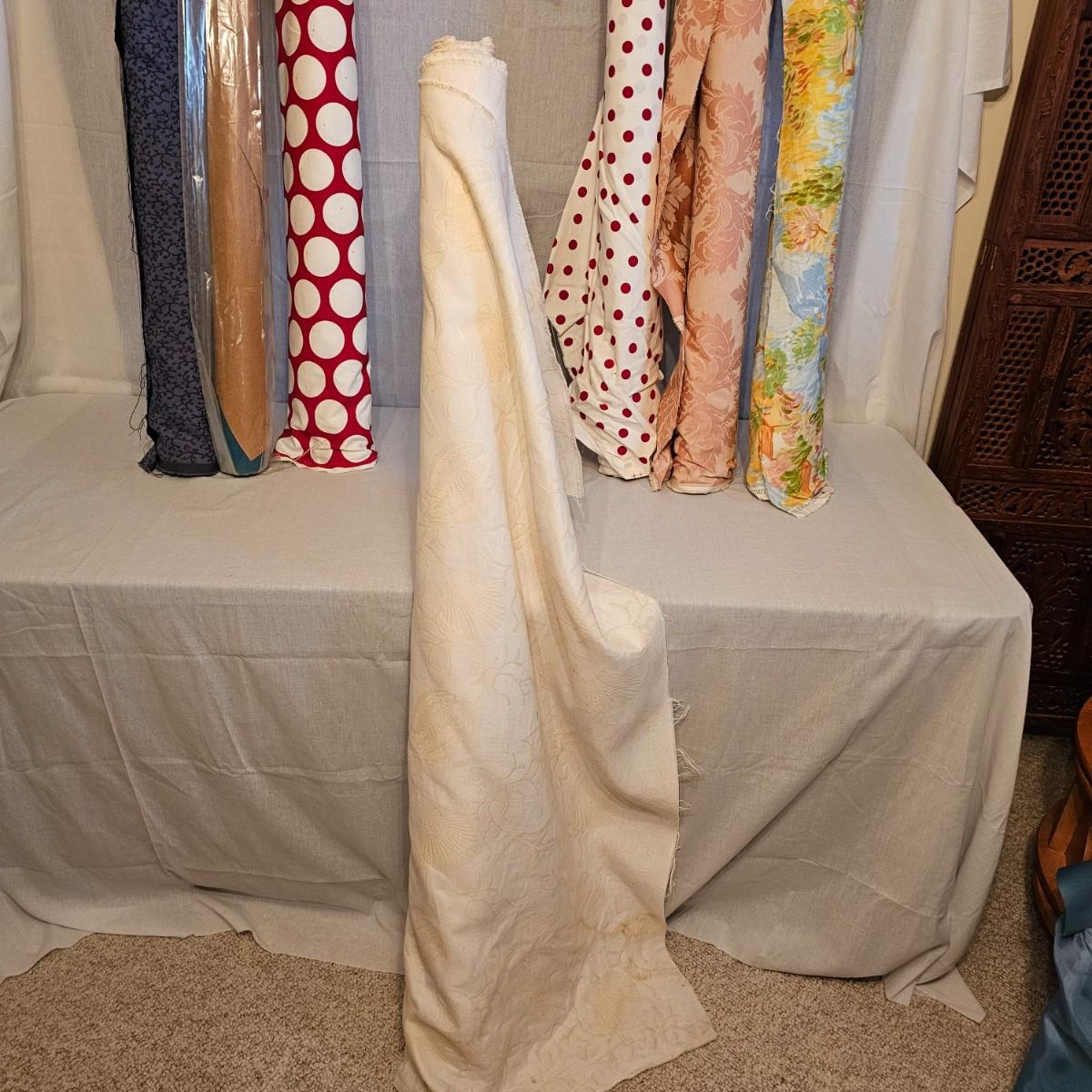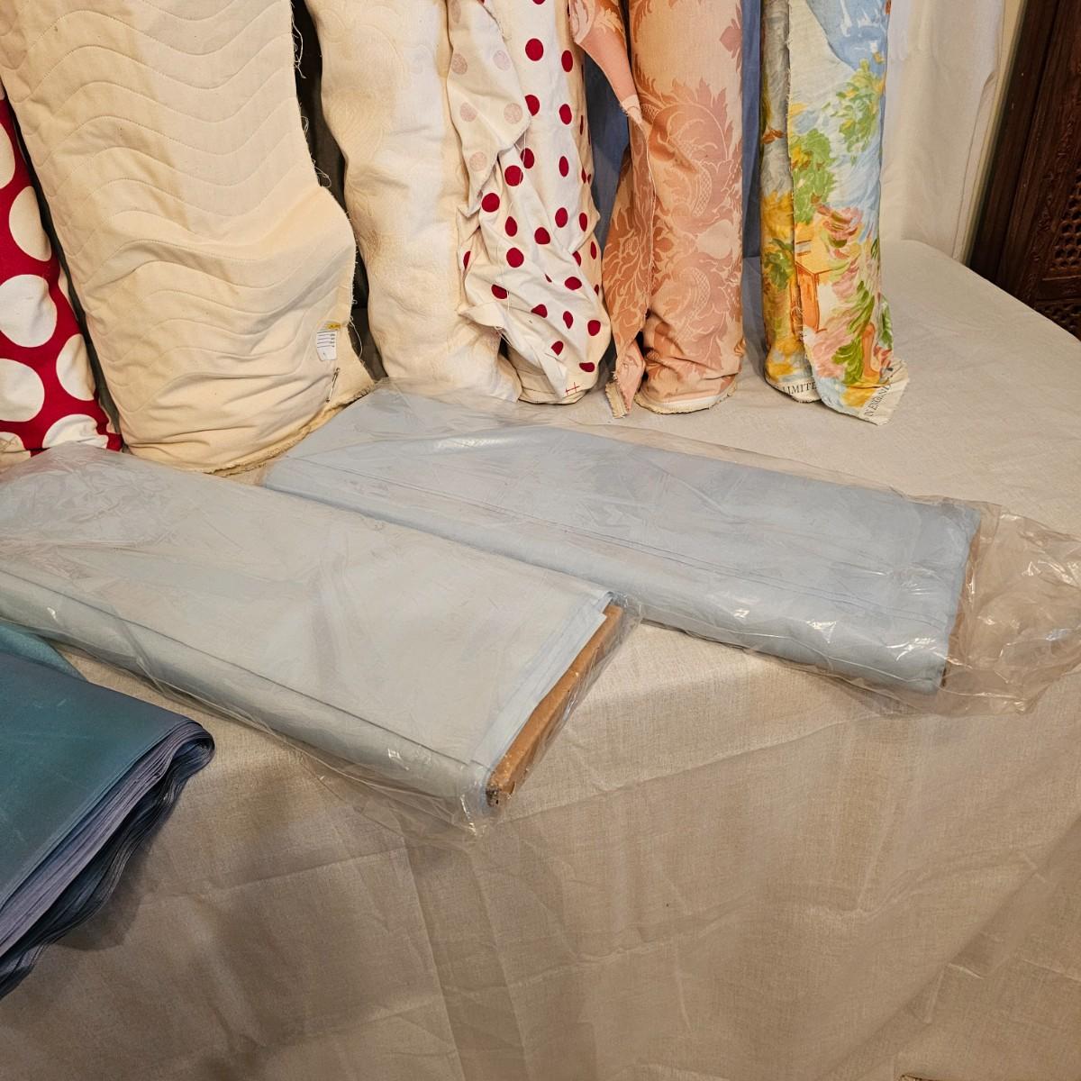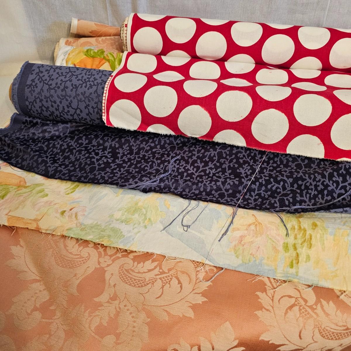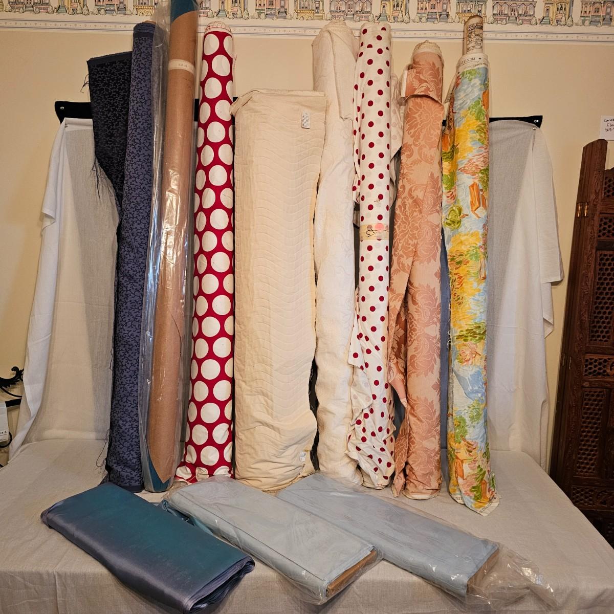 Seven bolts of upholstery fabric, one of quilted muslin and three flats of cotton/polyester blend. Bolt widths range from 55" to 60". The muslin is 48"W. All lengths indeterminate due to usage. Some spots and dirt on selvage ends. See photos for details. Local pickup only.
