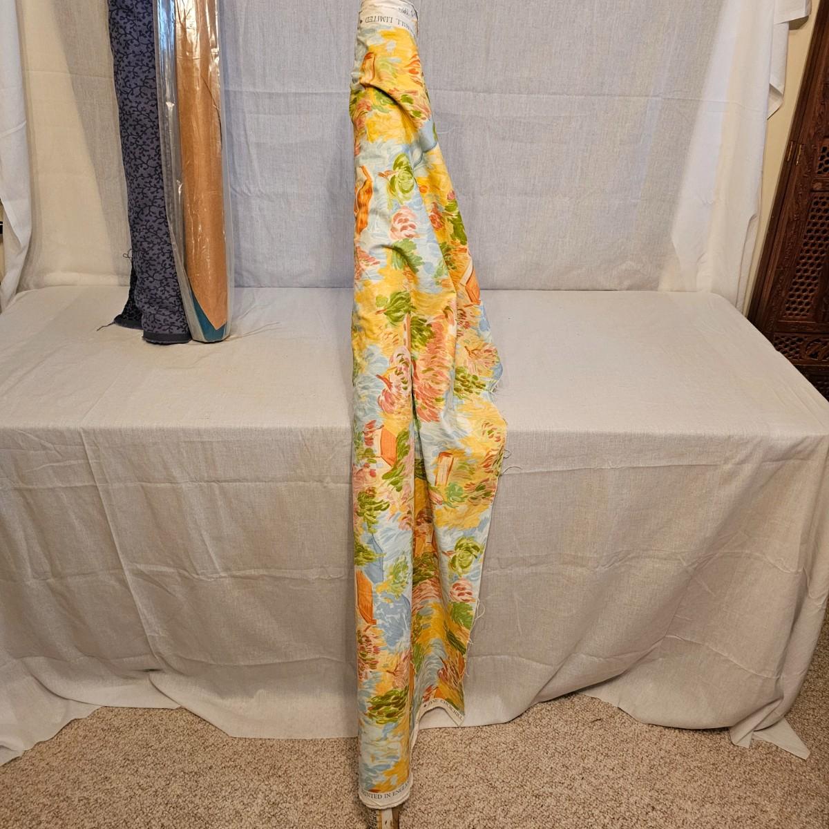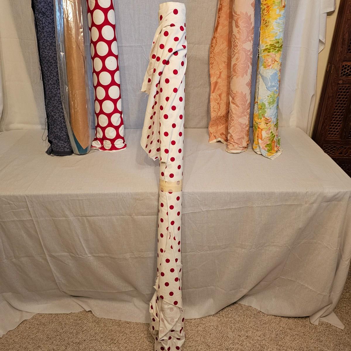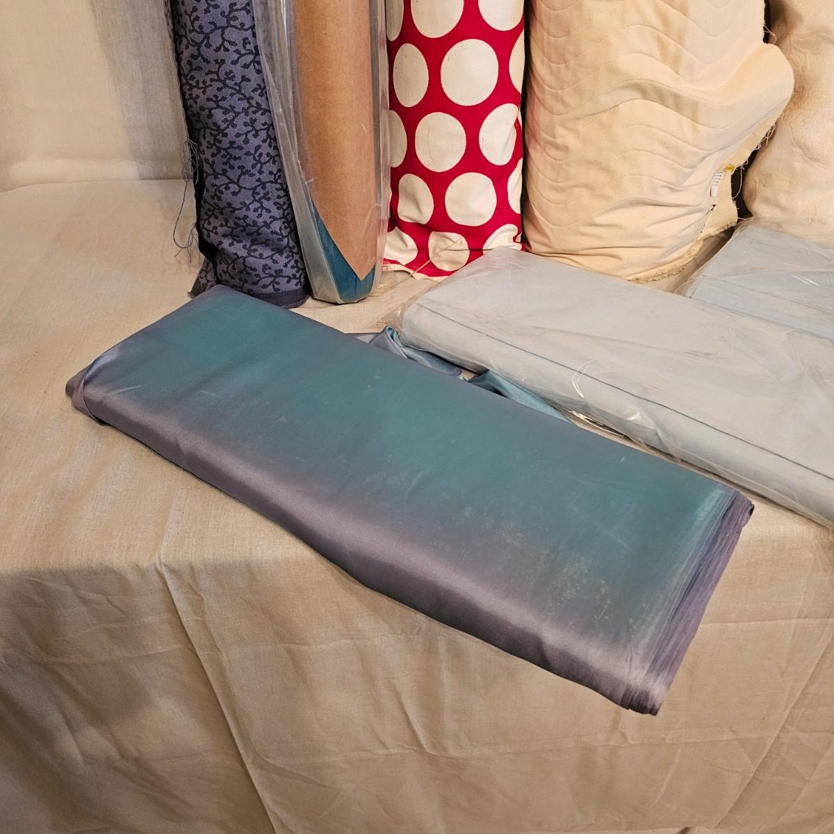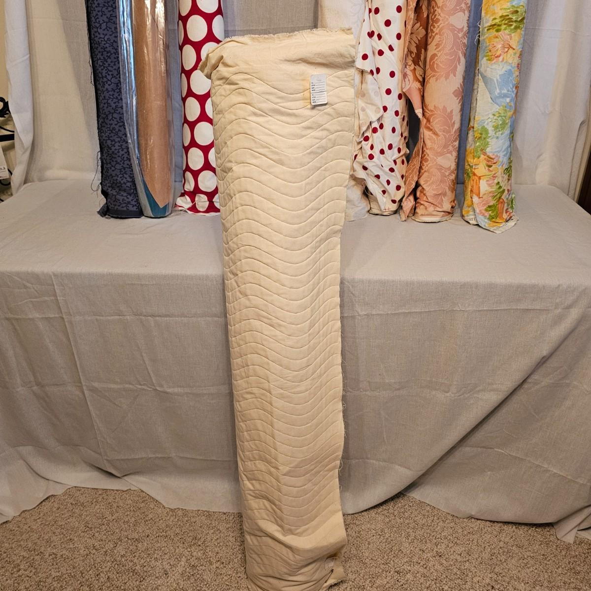 Seven bolts of upholstery fabric, one of quilted muslin and three flats of cotton/polyester blend. Bolt widths range from 55" to 60". The muslin is 48"W. All lengths indeterminate due to usage. Some spots and dirt on selvage ends. See photos for details. Local pickup only.