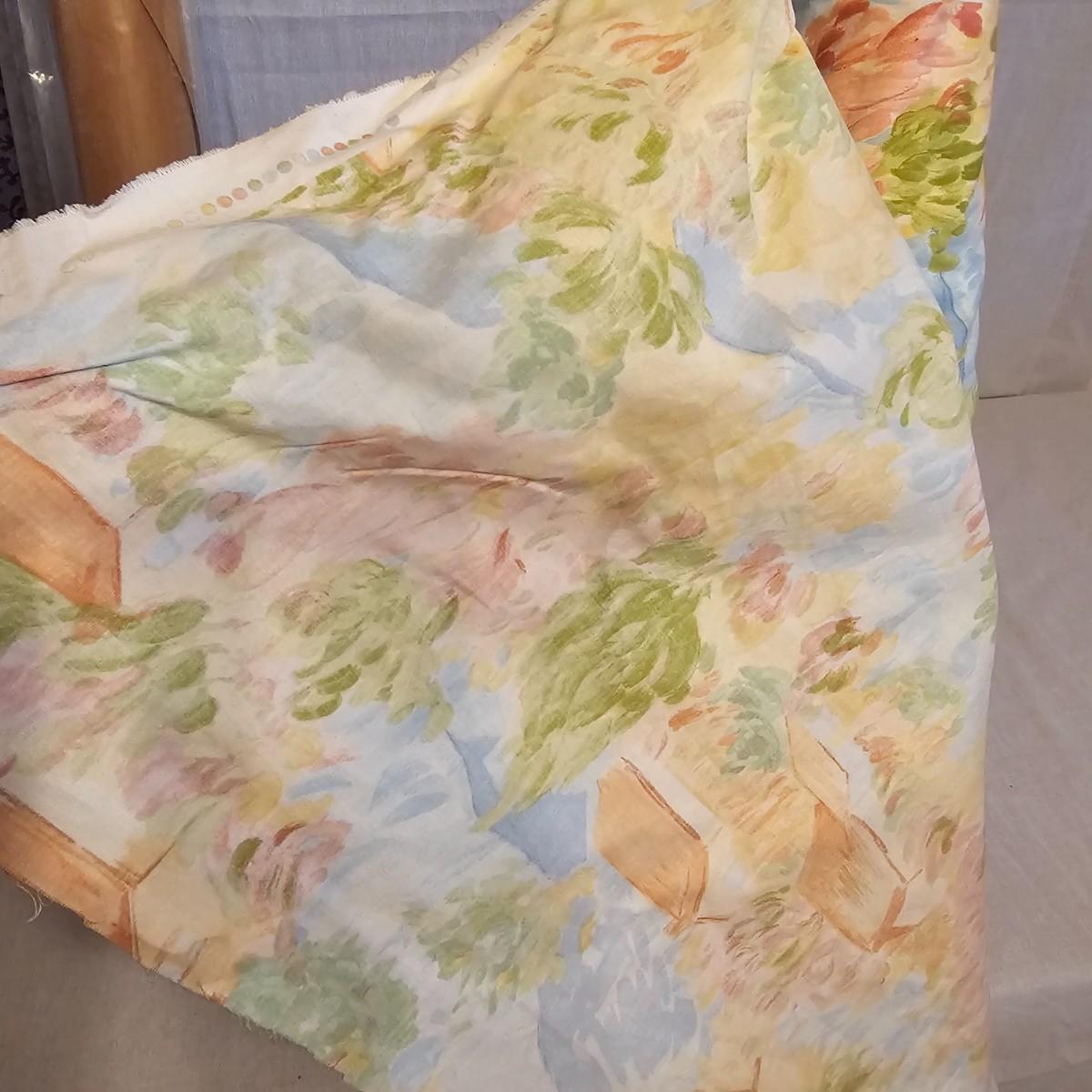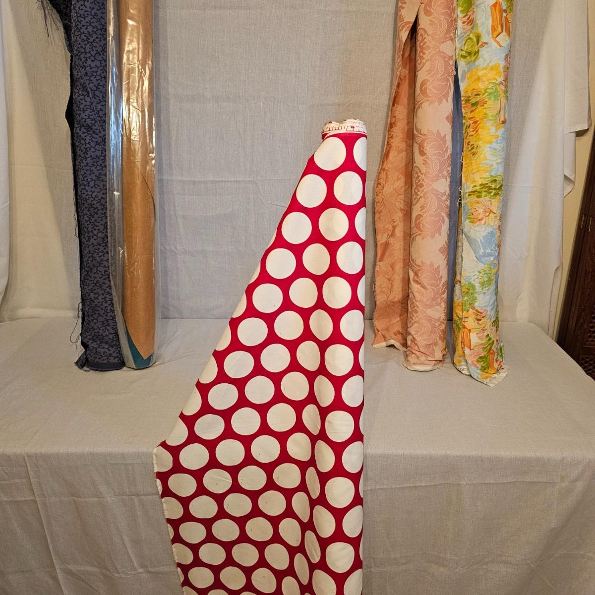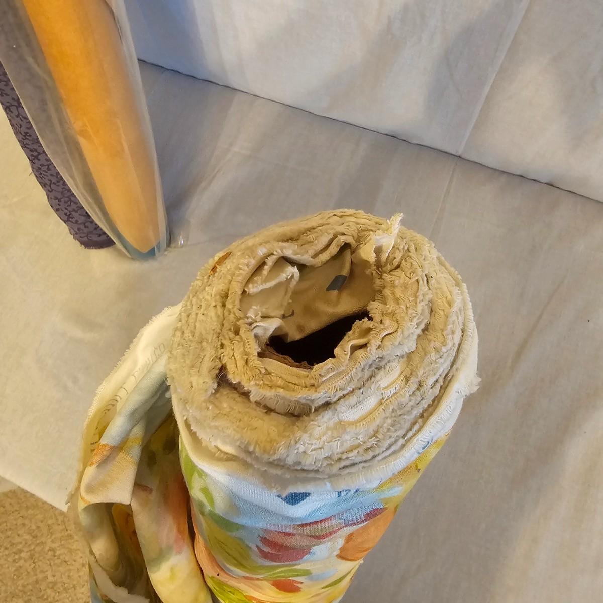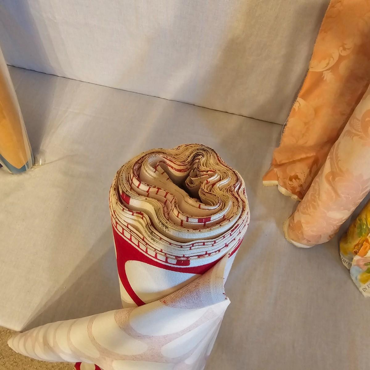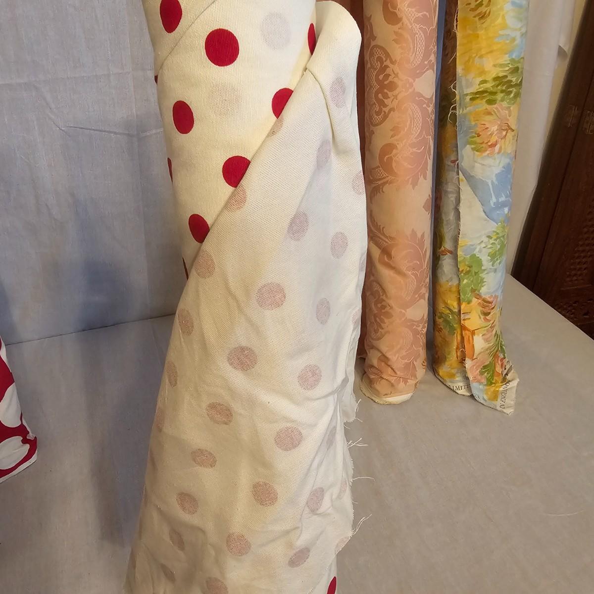 Seven bolts of upholstery fabric, one of quilted muslin and three flats of cotton/polyester blend. Bolt widths range from 55" to 60". The muslin is 48"W. All lengths indeterminate due to usage. Some spots and dirt on selvage ends. See photos for details. Local pickup only.
