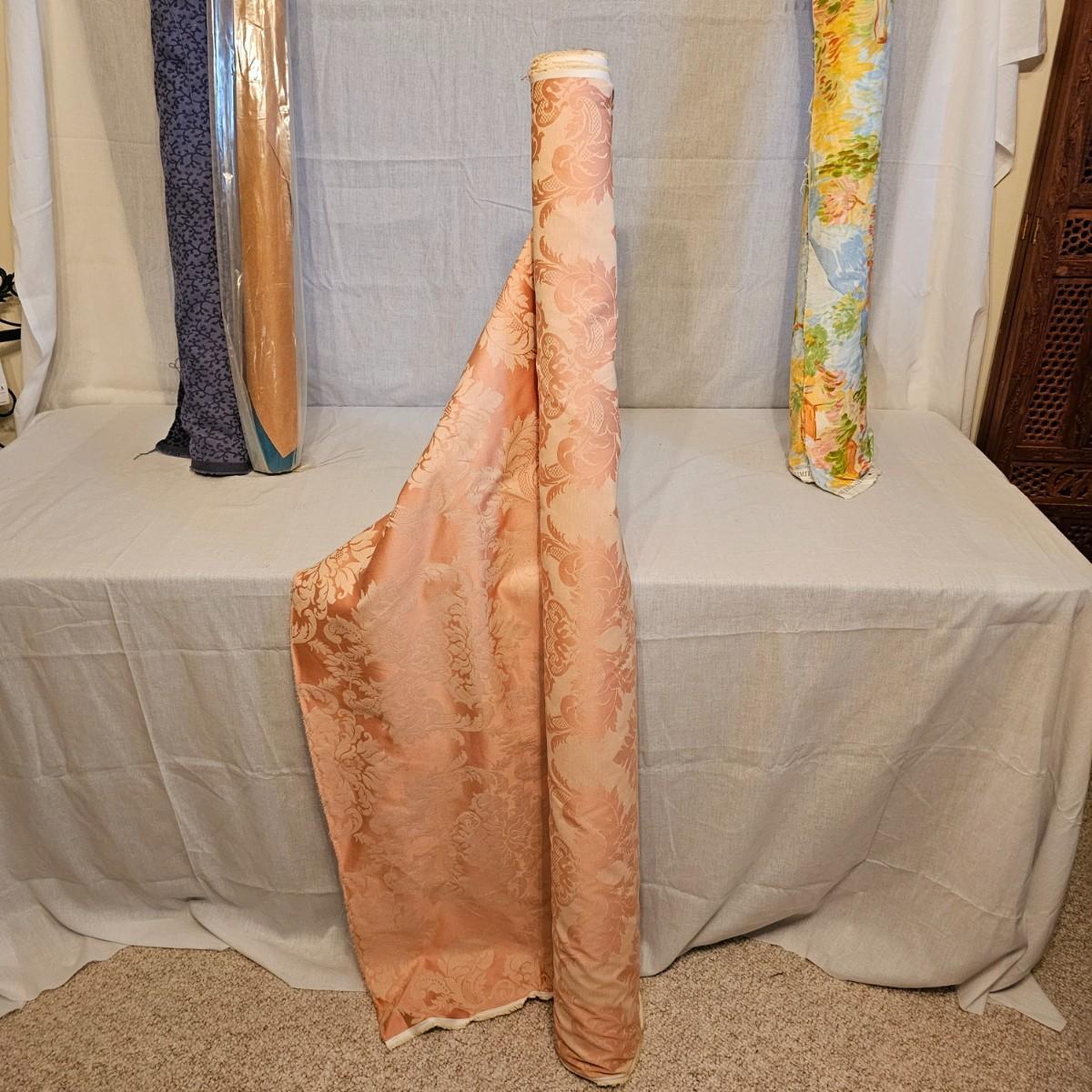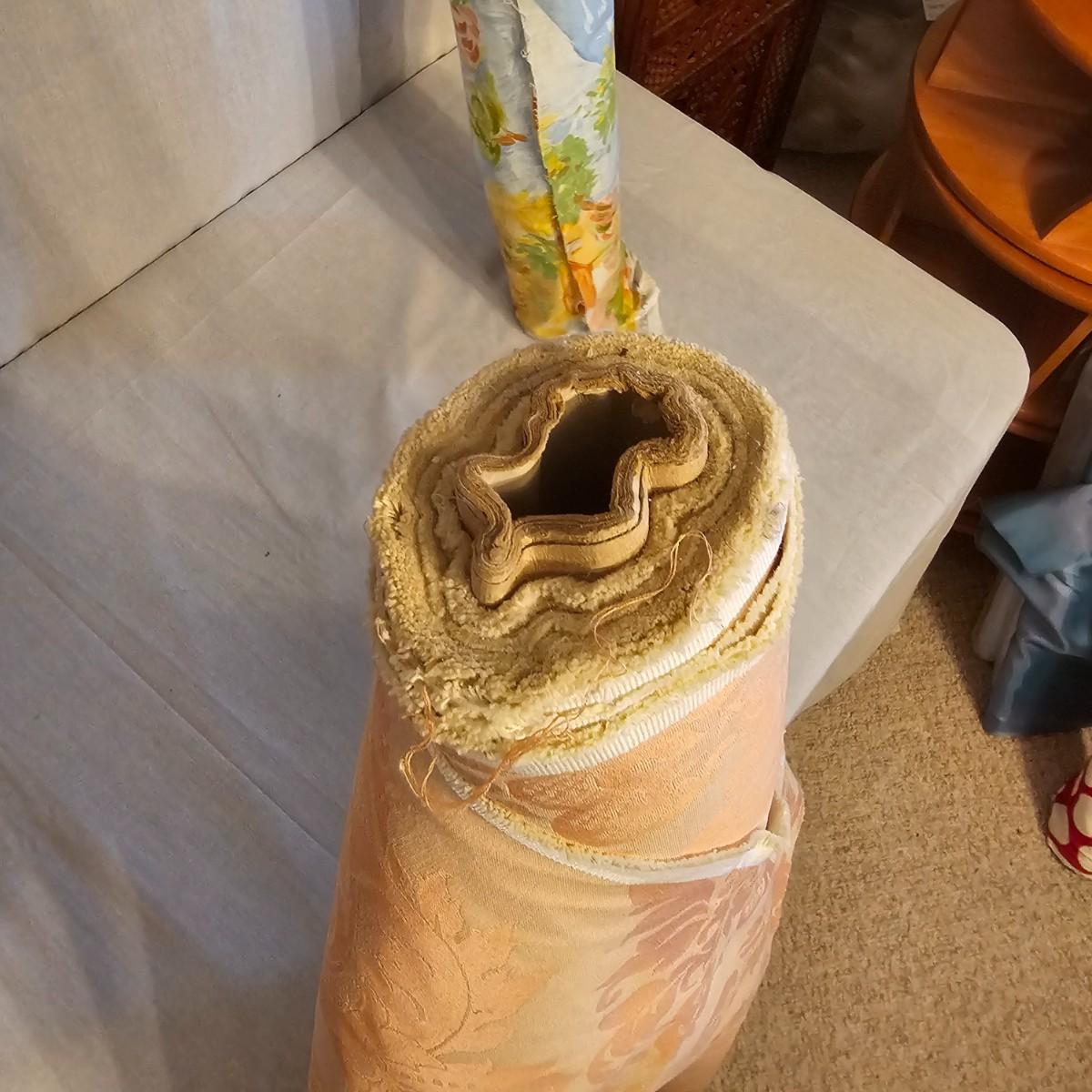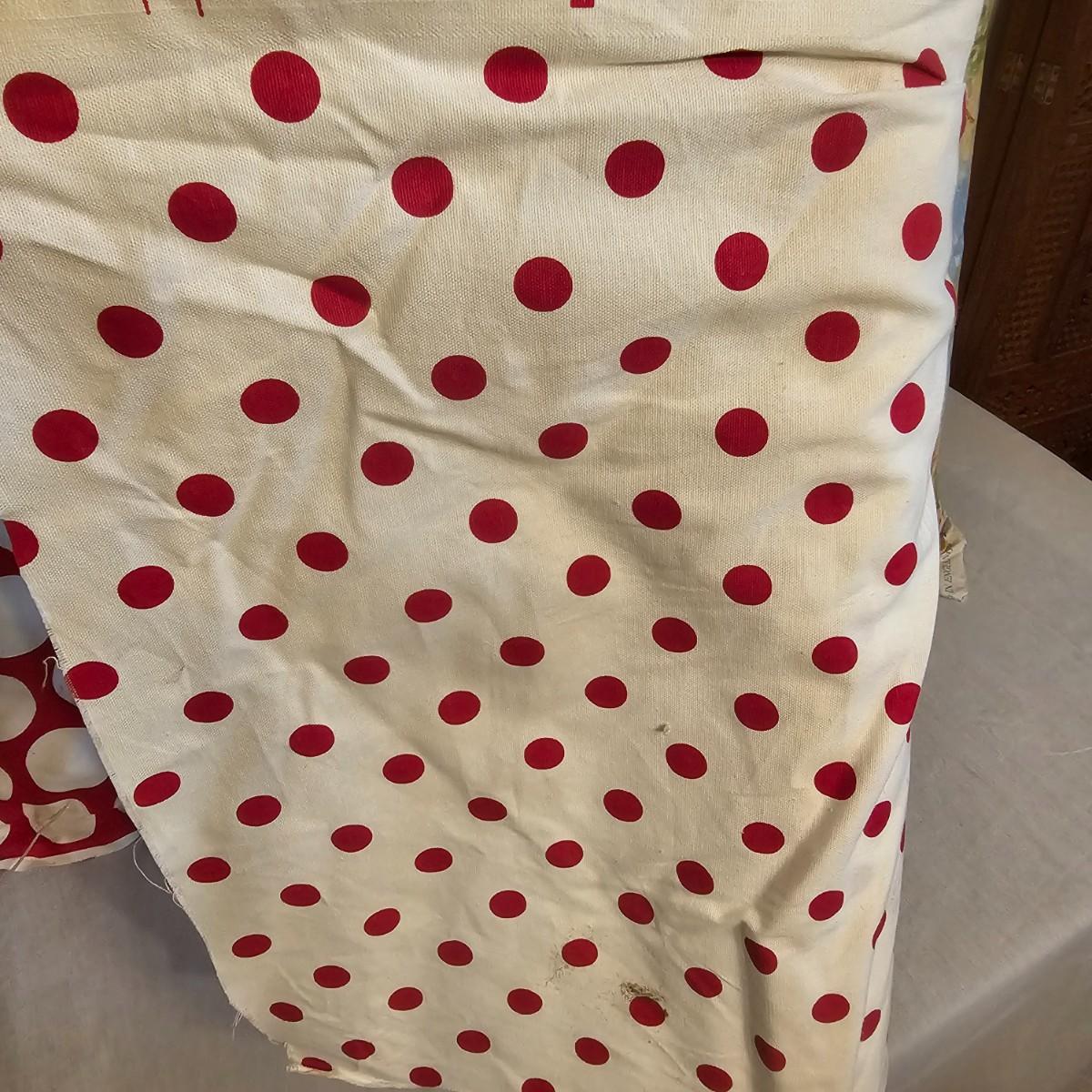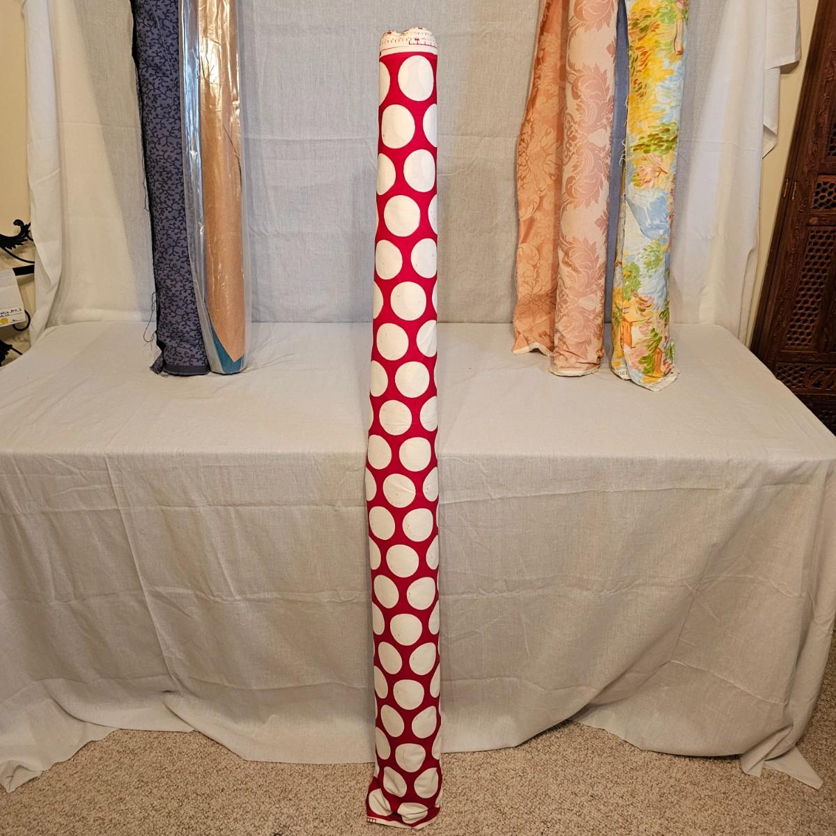 Seven bolts of upholstery fabric, one of quilted muslin and three flats of cotton/polyester blend. Bolt widths range from 55" to 60". The muslin is 48"W. All lengths indeterminate due to usage. Some spots and dirt on selvage ends. See photos for details. Local pickup only.