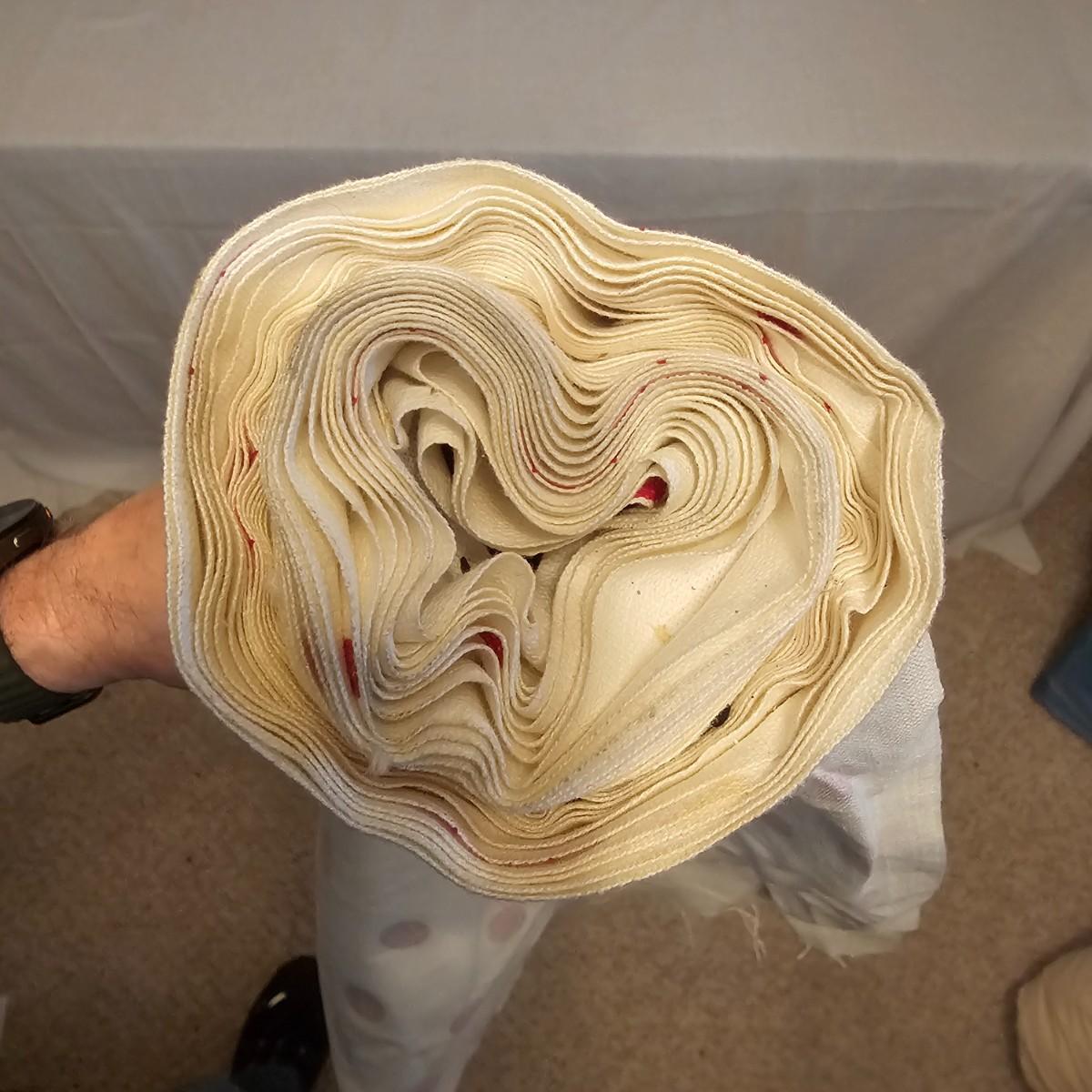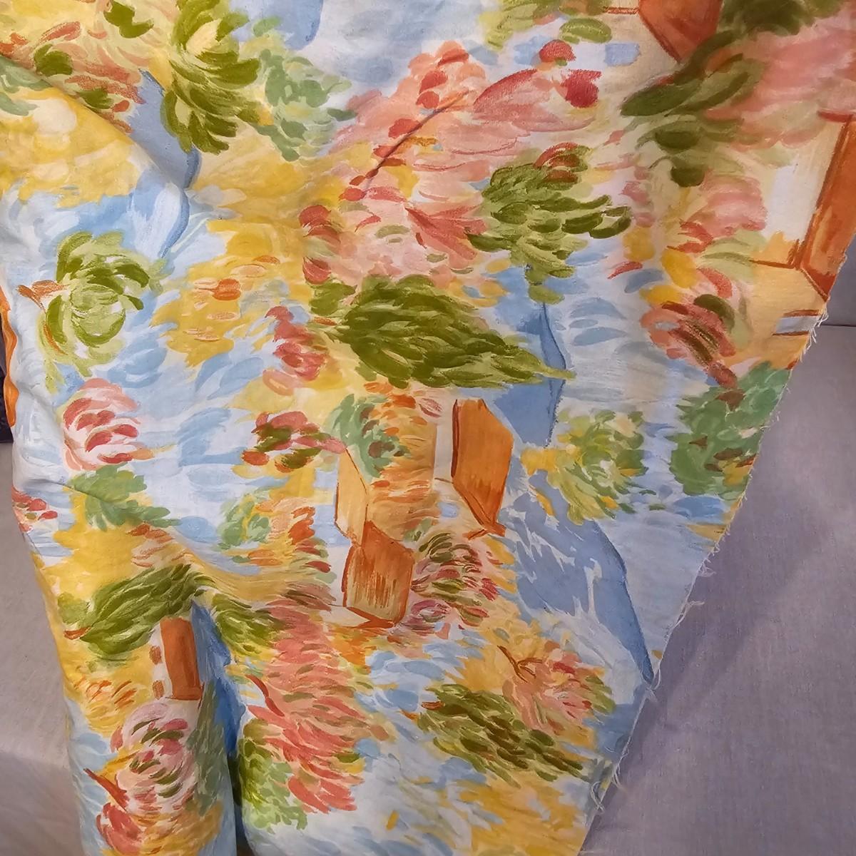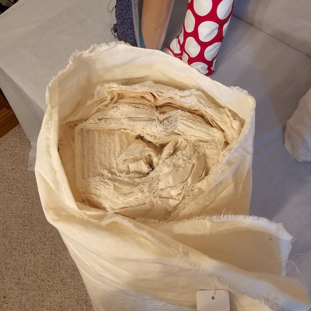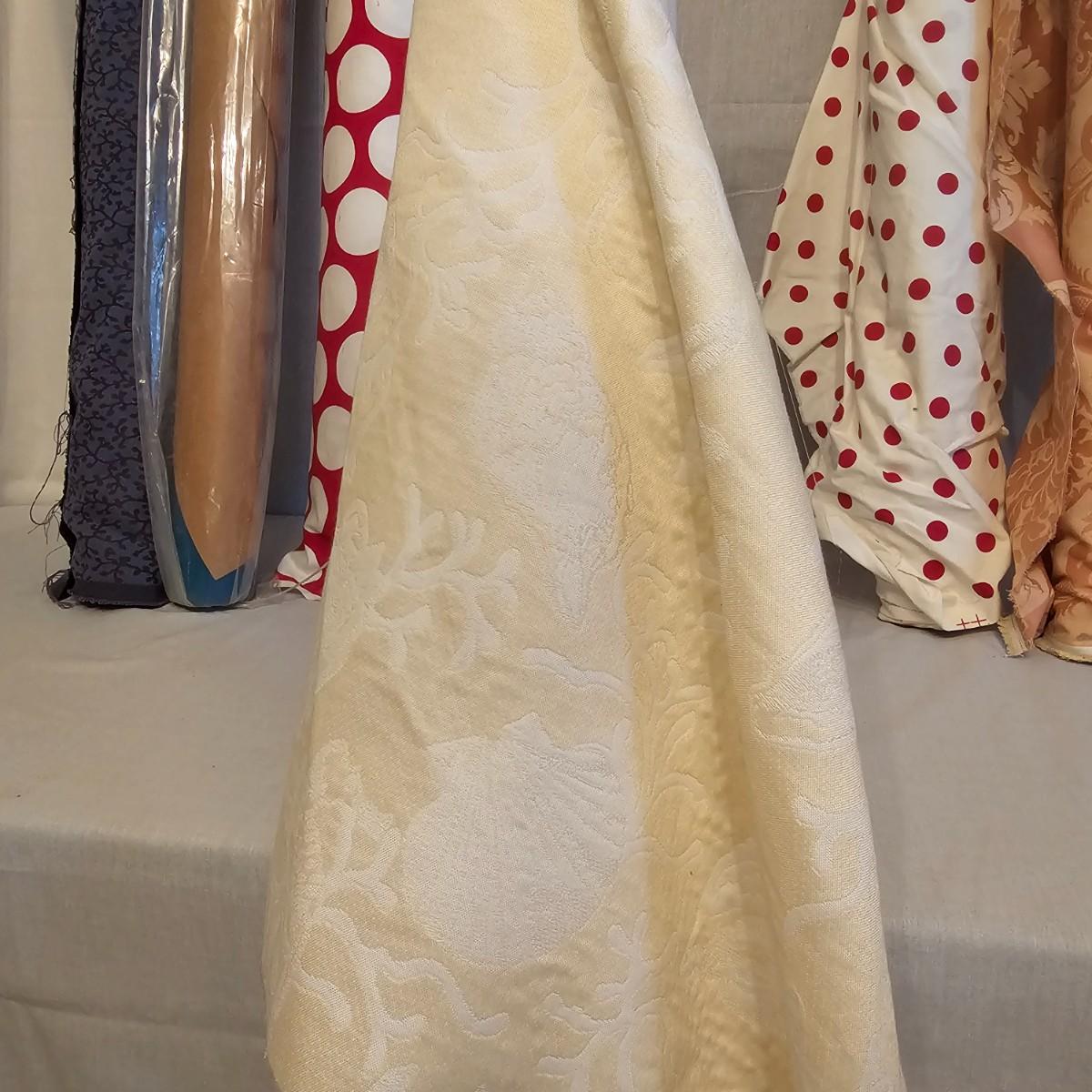 Seven bolts of upholstery fabric, one of quilted muslin and three flats of cotton/polyester blend. Bolt widths range from 55" to 60". The muslin is 48"W. All lengths indeterminate due to usage. Some spots and dirt on selvage ends. See photos for details. Local pickup only.