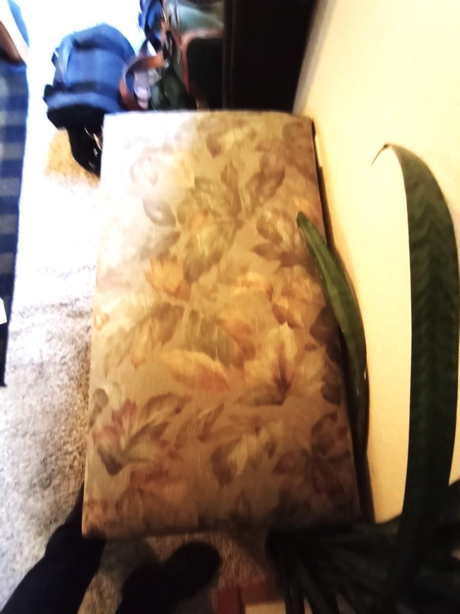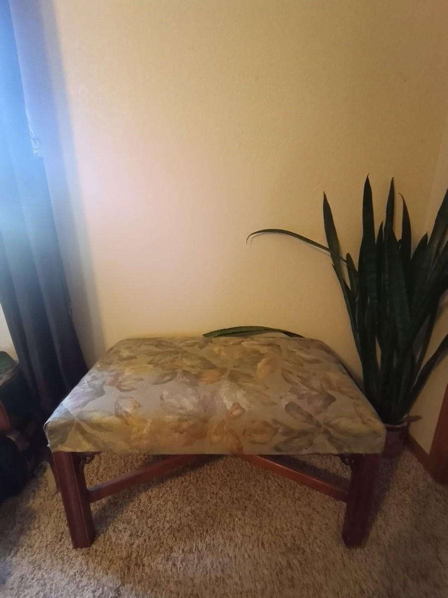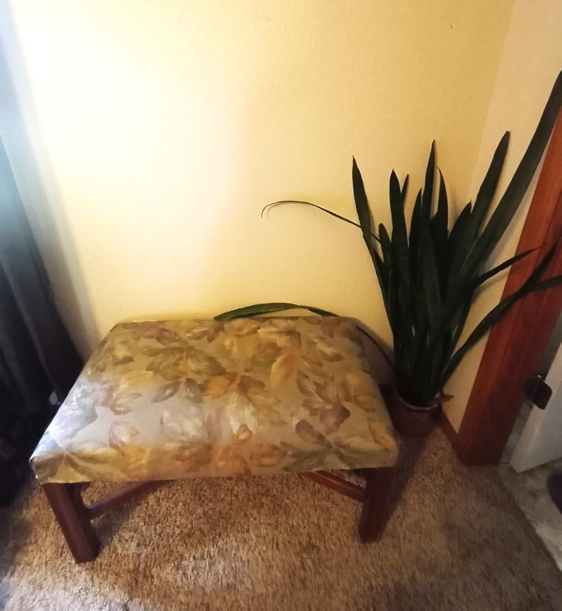 UPHOLSTERED SEAT BENCH APPROX.33X19 AND POTTED PLANT
