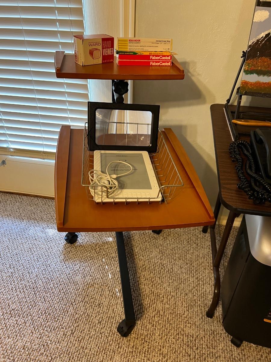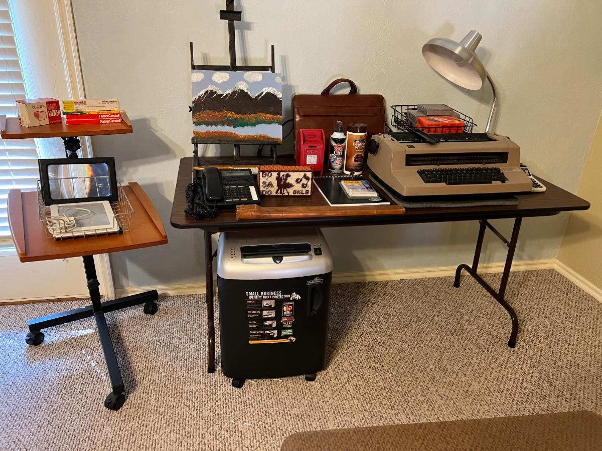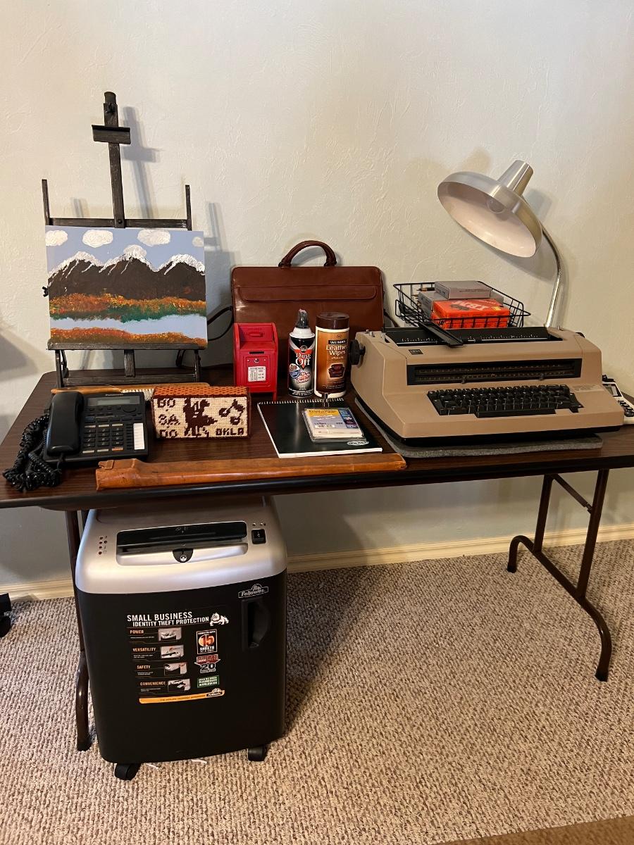 Office supplies, Typing desk, electric typewriter, Kindle, paper shredder all items as pictured