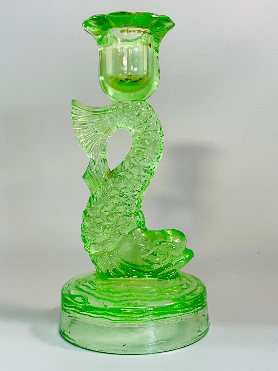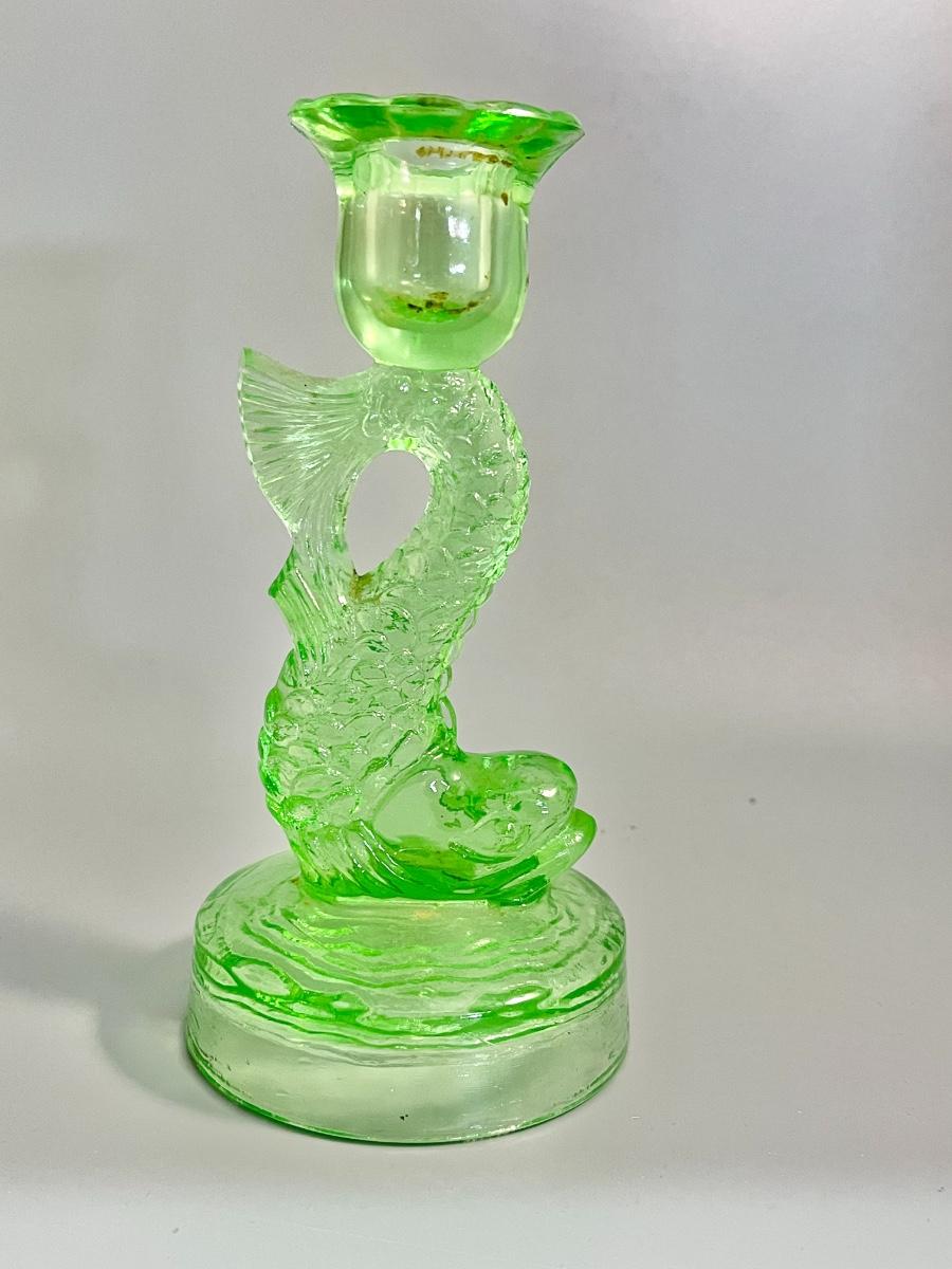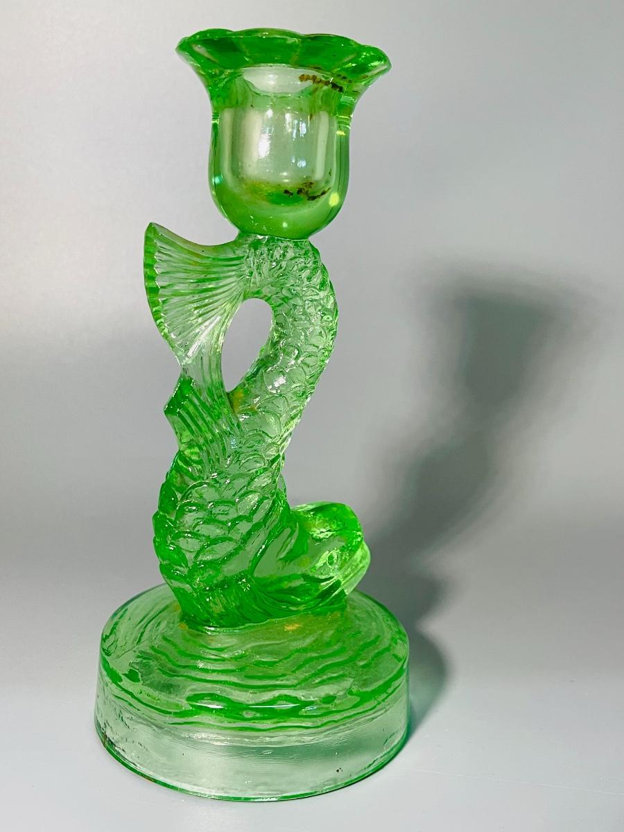 Lovely glow to this piece that is in excellent condition. Needs a gentle cleaning. A great addition to your vintage glass collection. The dolphin is sure a great piece to keep or gift to a fellow collector.