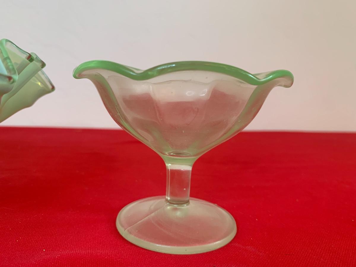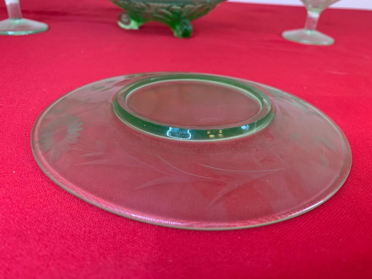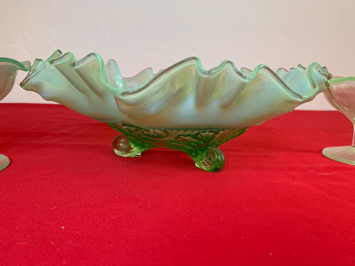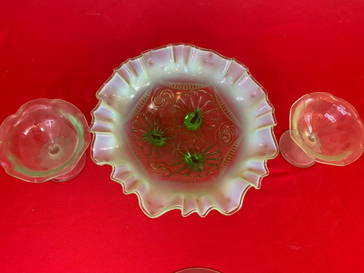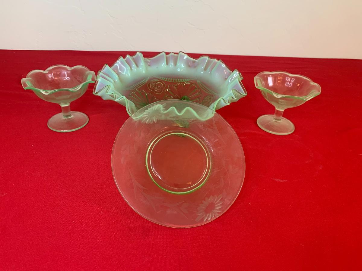 Lot includes a pair of uranium glass sherbets, a plate with flowers and a pressed glass footed candy dish with opalescent edge.