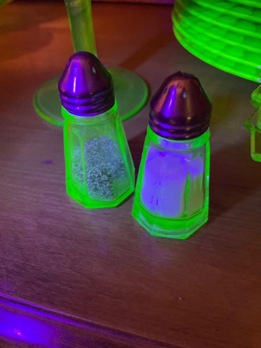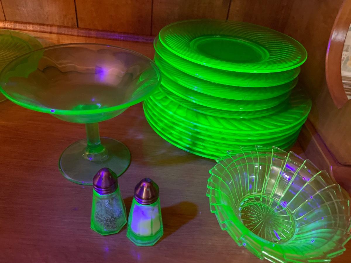 7 small plates, 6 dinner plates, S&P shakers and large glass set all reactive to black light
