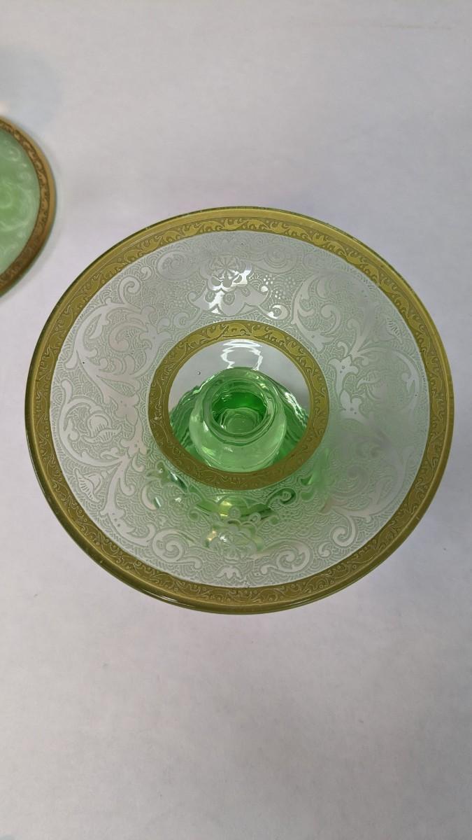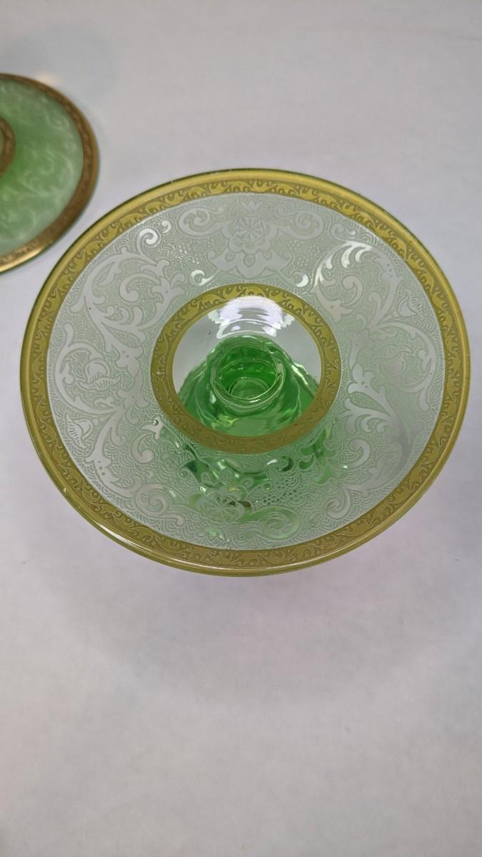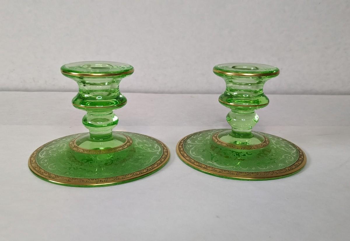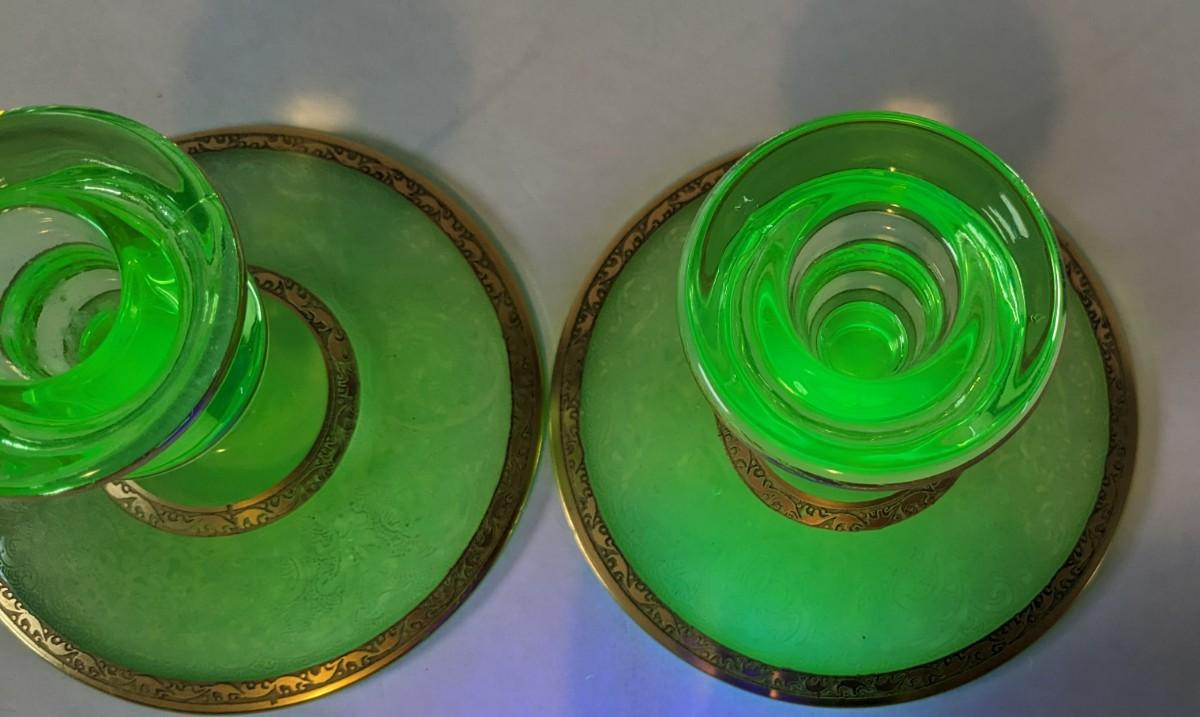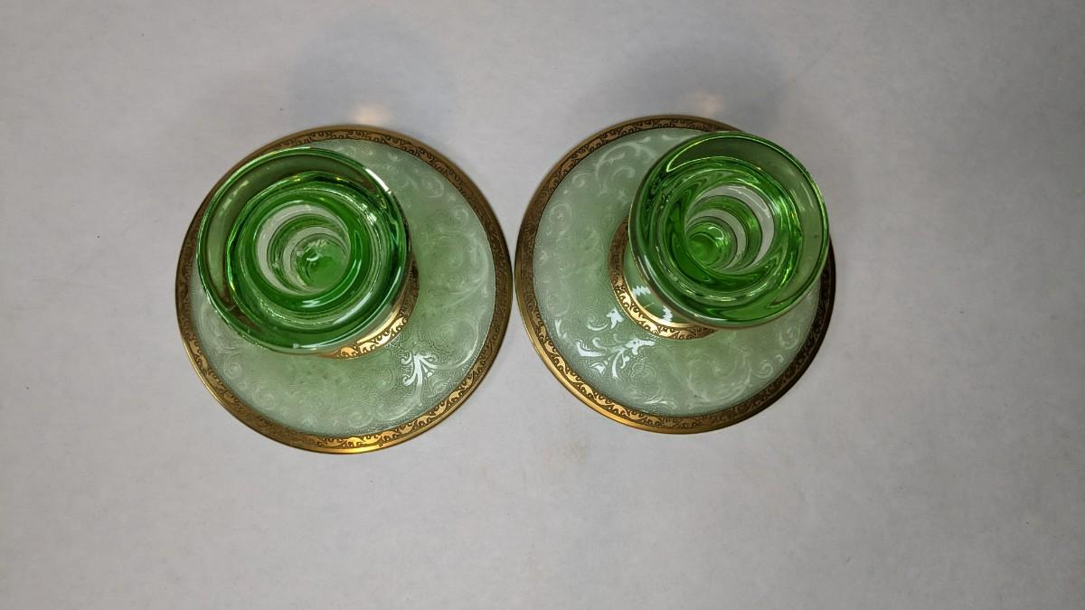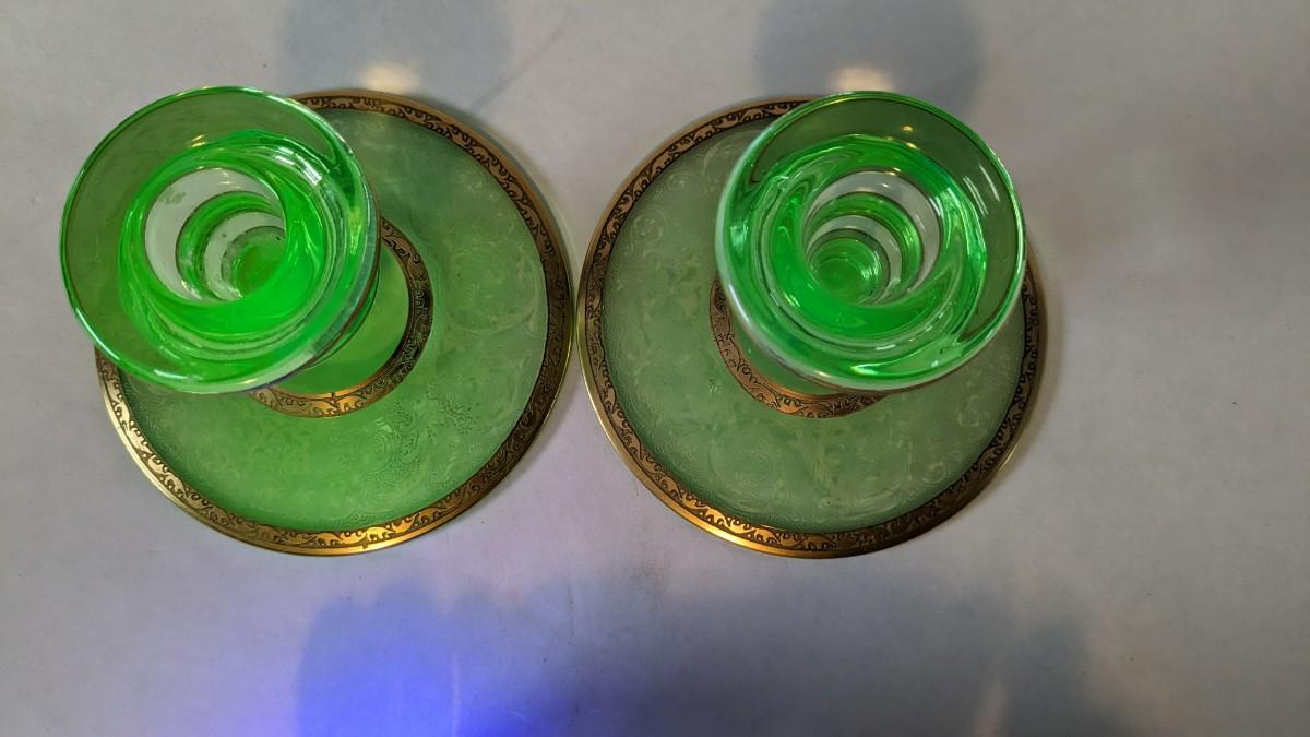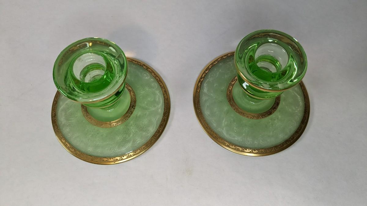 (2) 4.75"x3.25" uranium glass candlestick holders. These incredible piece feature beautiful etched florals in the base with gold highlights around rim. Both are in excellent condition with no cracks, chips, or major wear noted. Matching console can be found in lot 30.