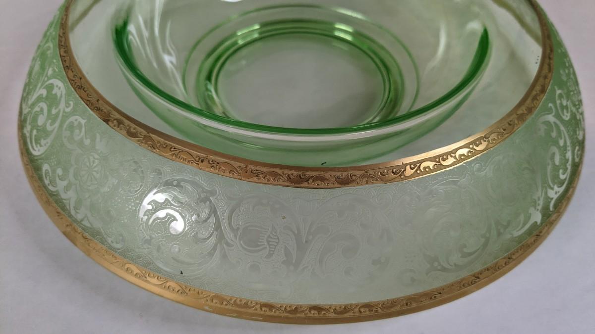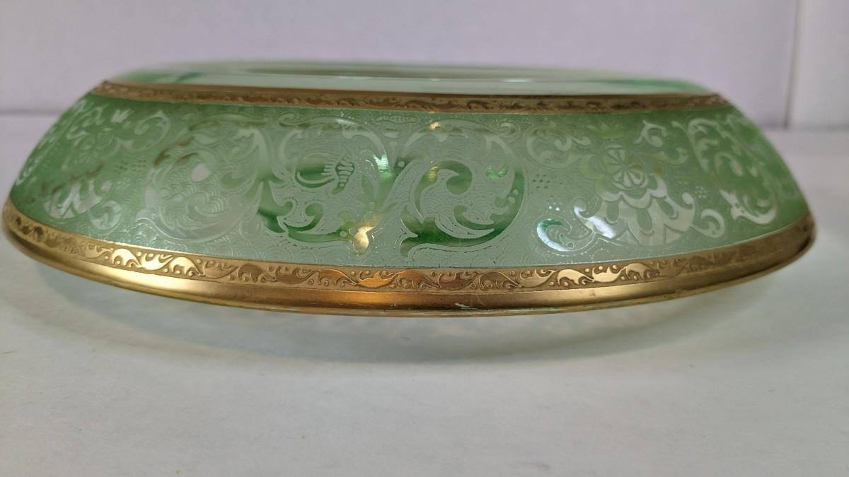 a stunning 11.25" console/ fruit bowl. This piece features a lovely etched floral rolled edge with gold highlights. Inner dish is approximately 6.25"x2" and is excellent condition. Matching candlestick holders can be found in lot 8