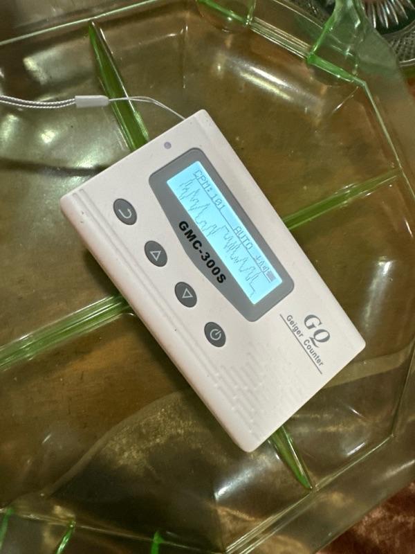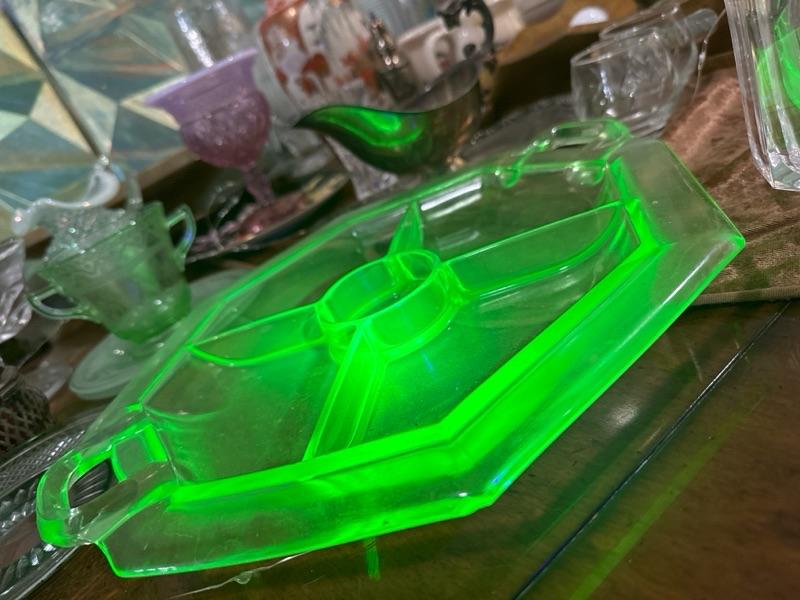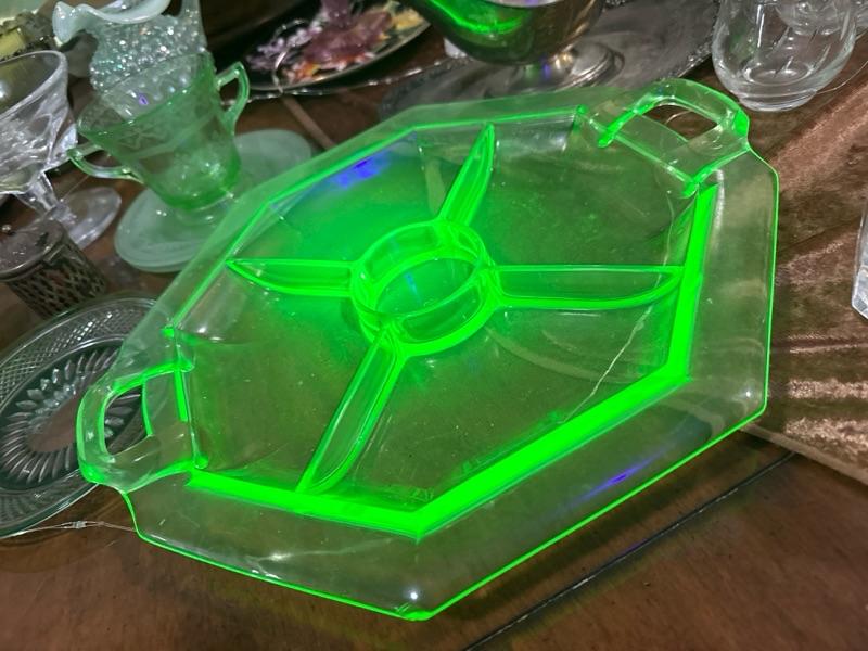 Uranium glass serving tray bright heavy server 4 compartments - thx Oppenheimer