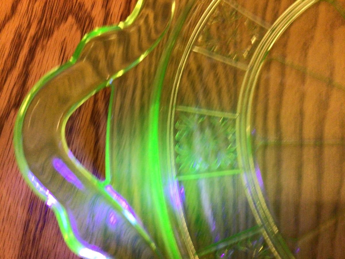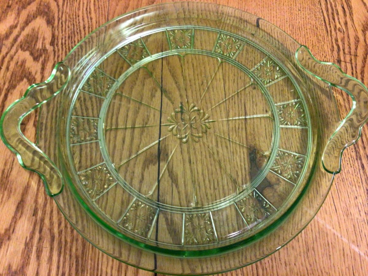 This is a great uranium green glass cake plate. It has a design etched it and has handles on two sides. It does glow under a black light. It is in great shape with no chips or cracks.
