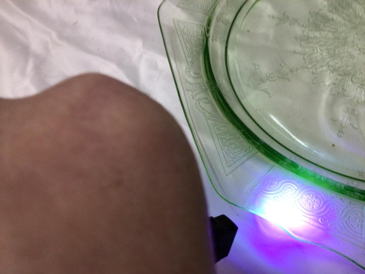 You get a large dinner plate green glass which glows under black light.