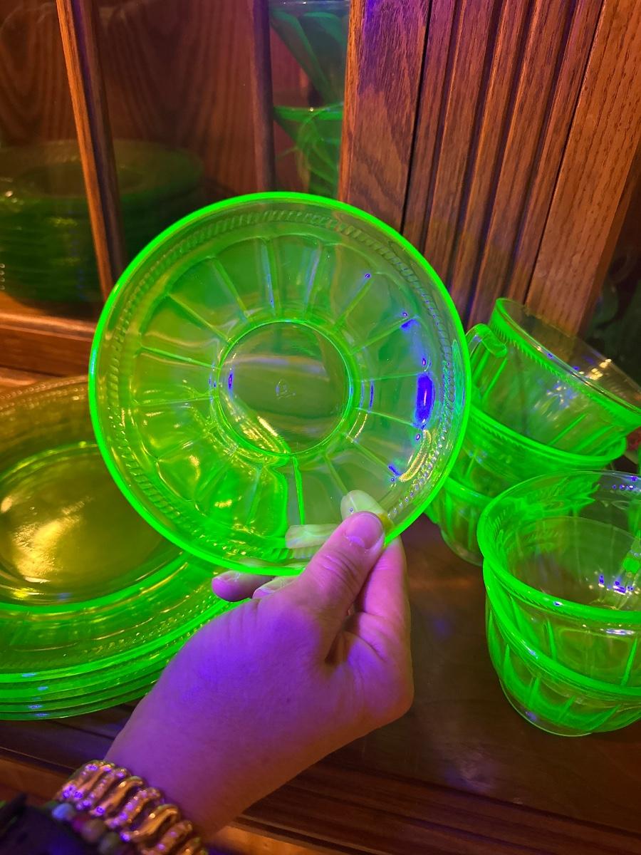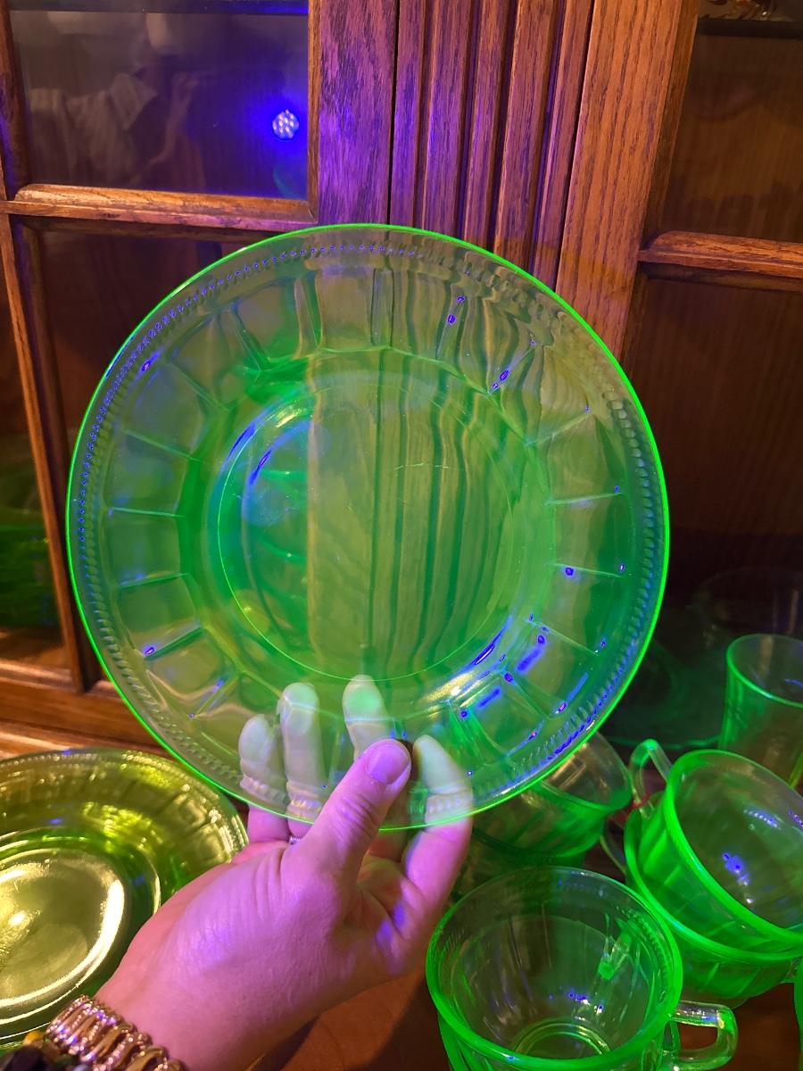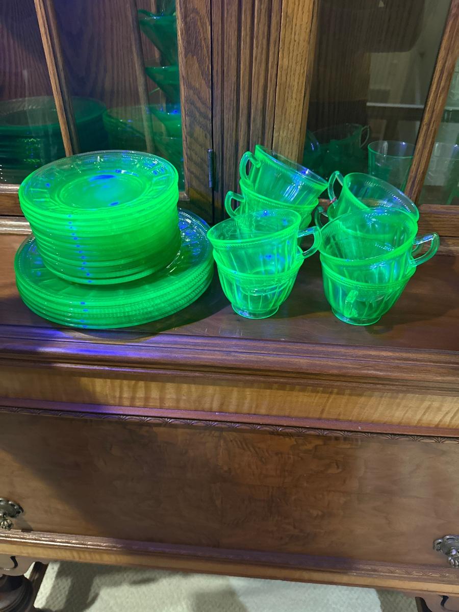 9 cups, 5 large plates, and 13 small saucers for uranium tea time.
