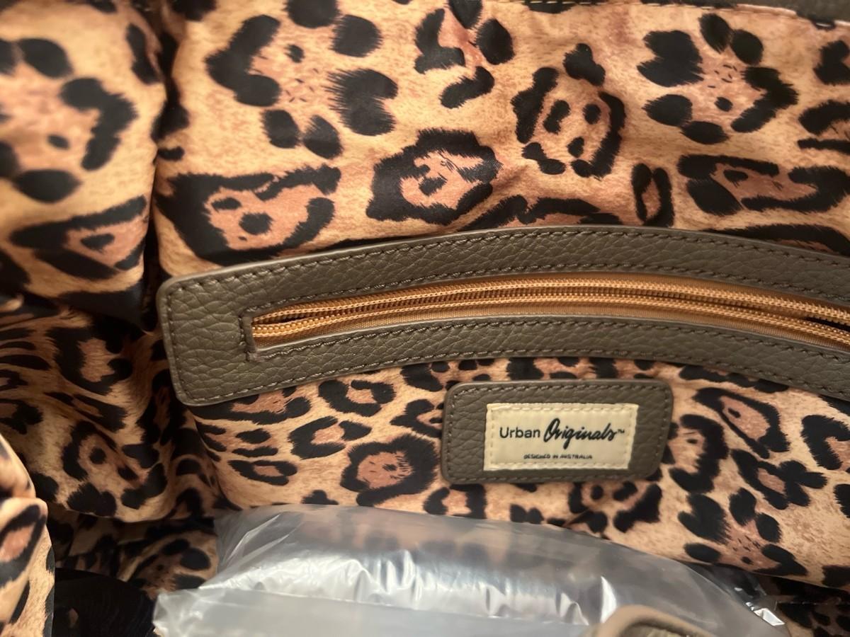 Stylish and roomy Urban Originals fringe tote handbag in olive green faux leather. Features long side fringe accents, dual shoulder straps, and a soft pebbled texture. The interior is fully lined with a bold leopard-print fabric and includes a zippered pocket and open accessory pockets. Designed in Australia. Clean and in very good pre-owned condition.