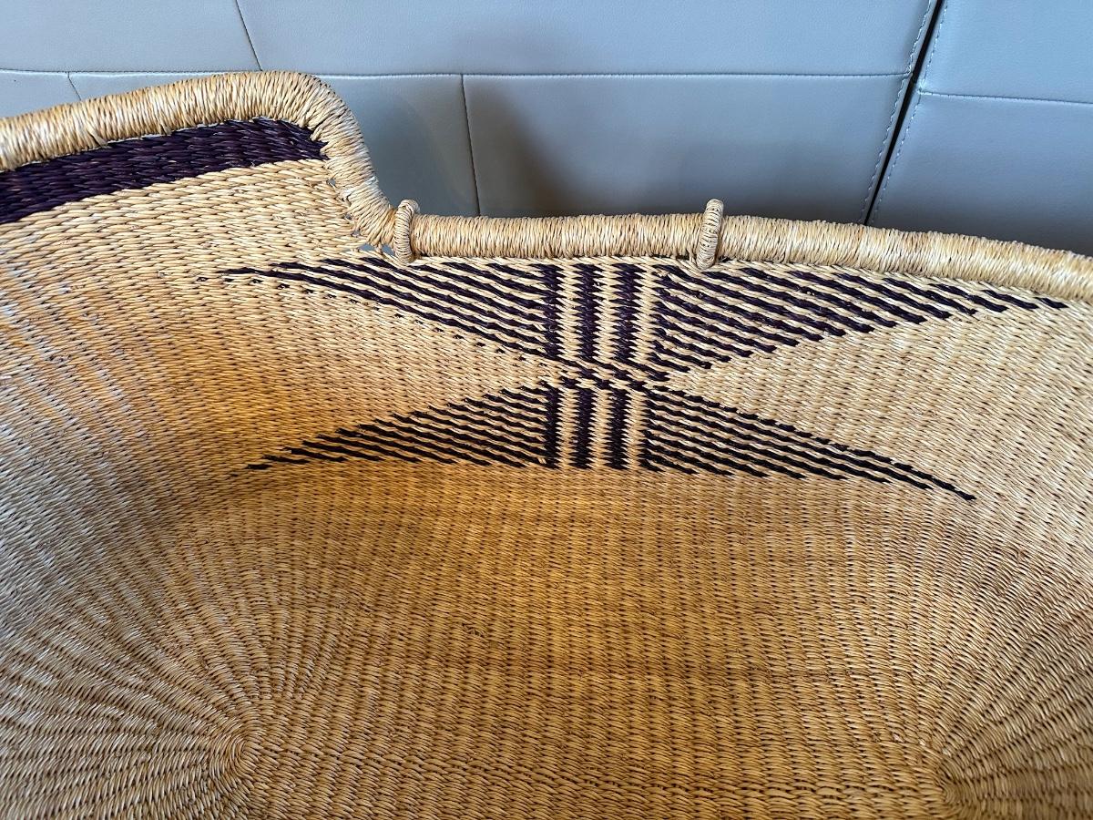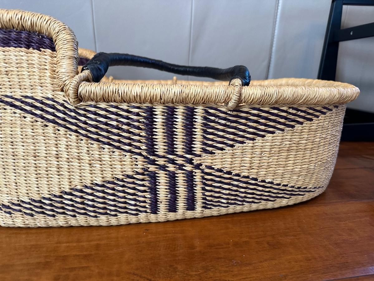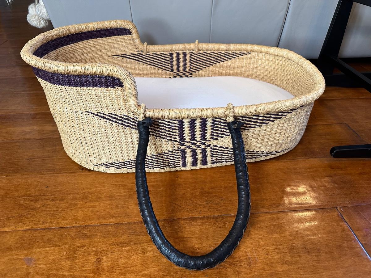 Beautiful handwoven Moses basket with black leather handles and a sleek black rocking stand by Uri Rose & Co. Features a natural and navy woven design with a fitted mattress pad — gently rocks for soothing motion.