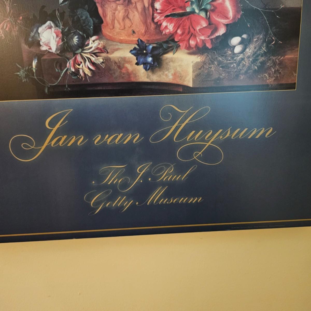 A still life print of flowers in a ceramic pot from the J. Paul Getty Museum. Original by Jan van Huysum. Print is on a wooden frame, measures 24" x 2" x 36"H. See photos for details. Shipping available. Shipping art can be costly. We suggest contacting our preferred local shipping provider, Postage Express, with dimensions and getting an estimate before bidding: (828) 670-5501 or postageexpress@yahoo.com.