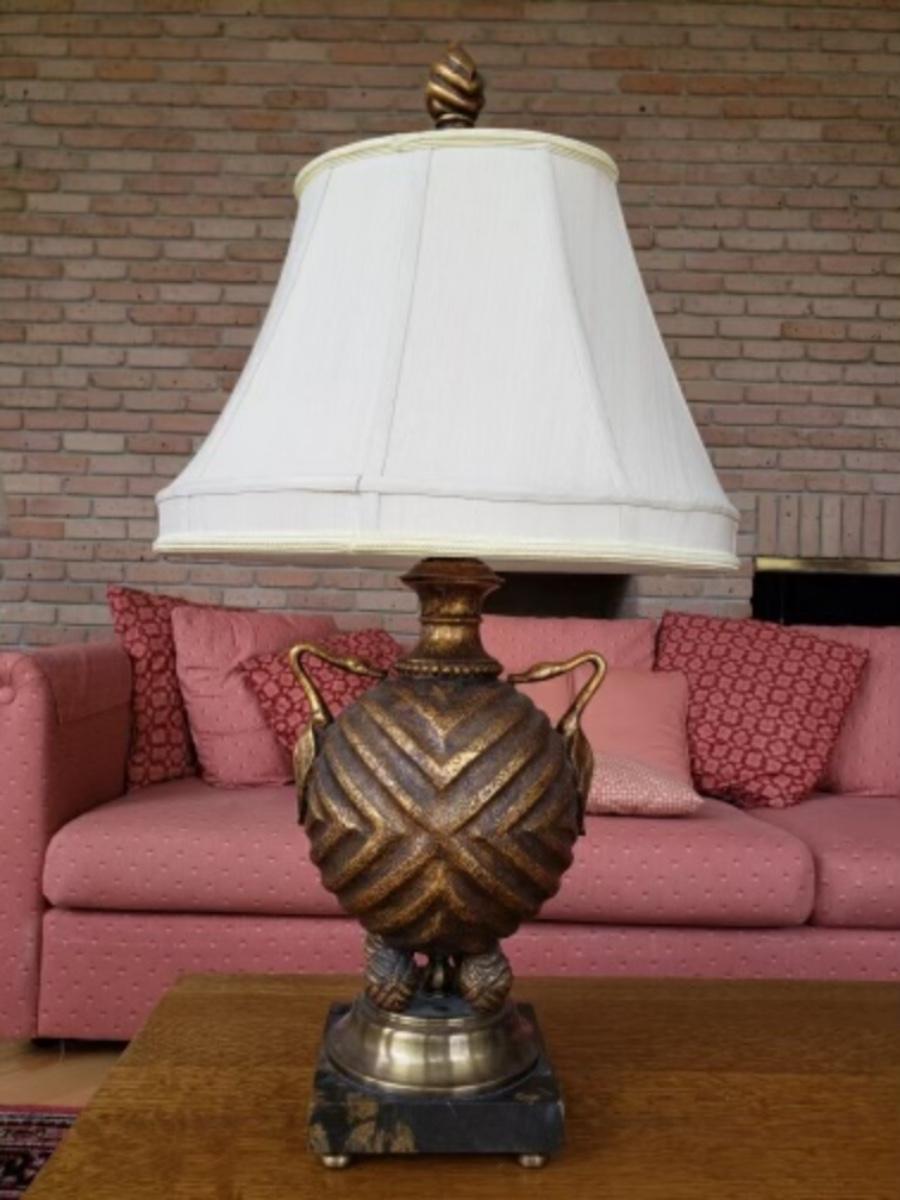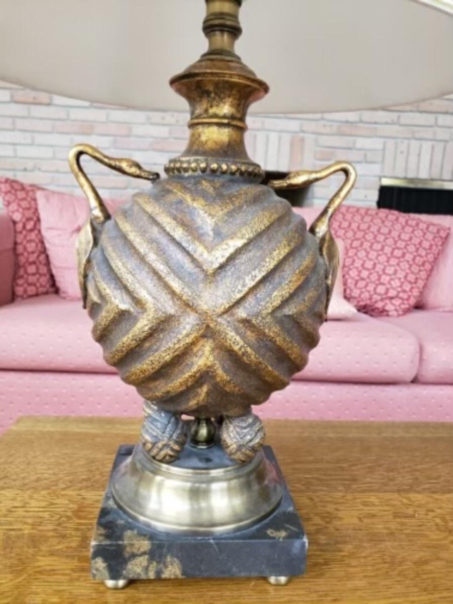 Urn style lamp with bird handles and marble base. Excellent condition 31h x 10 w. Shade approximate 18 w.