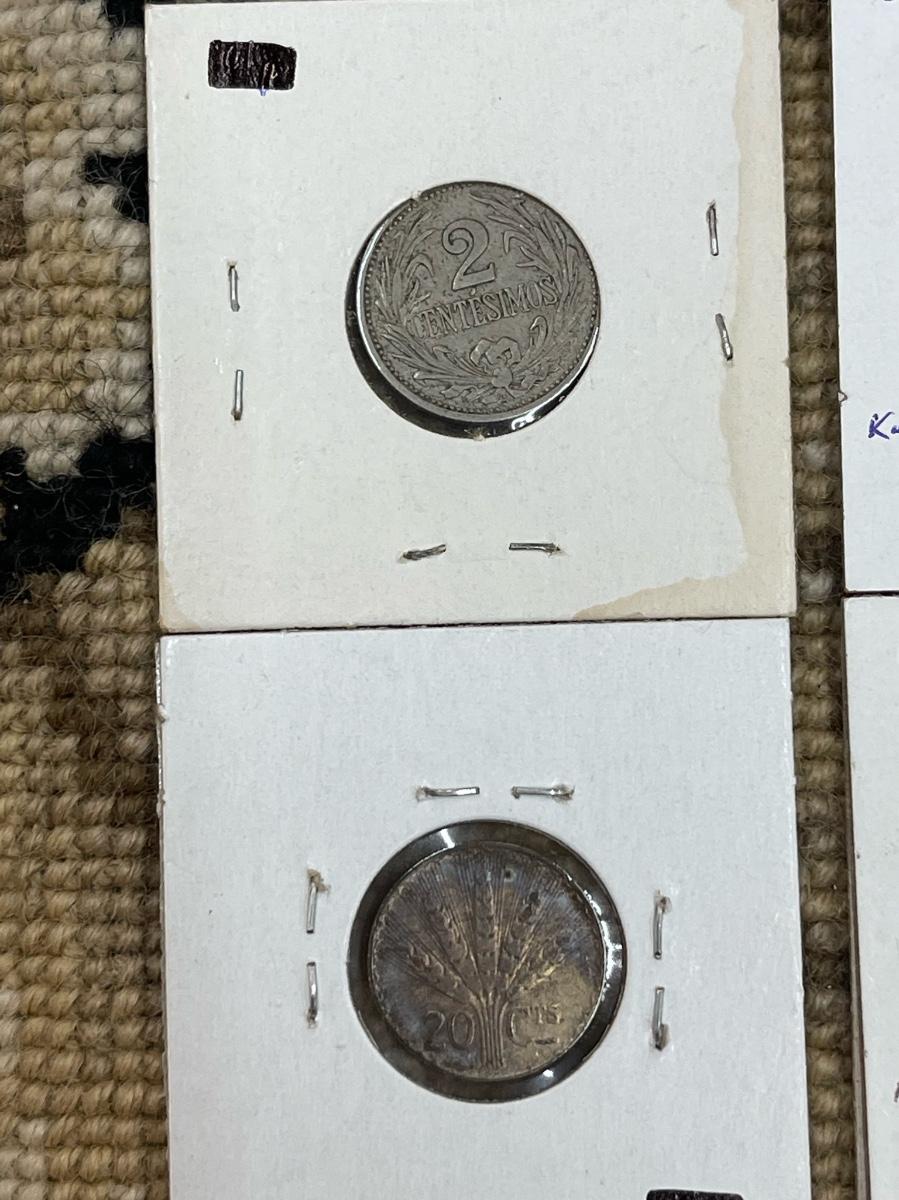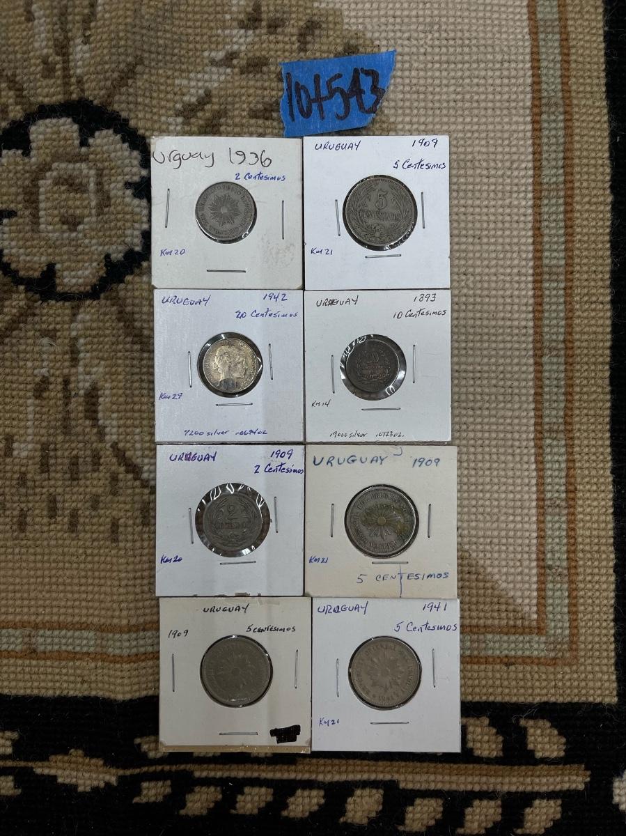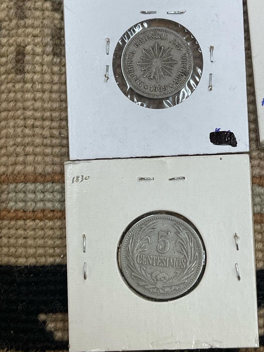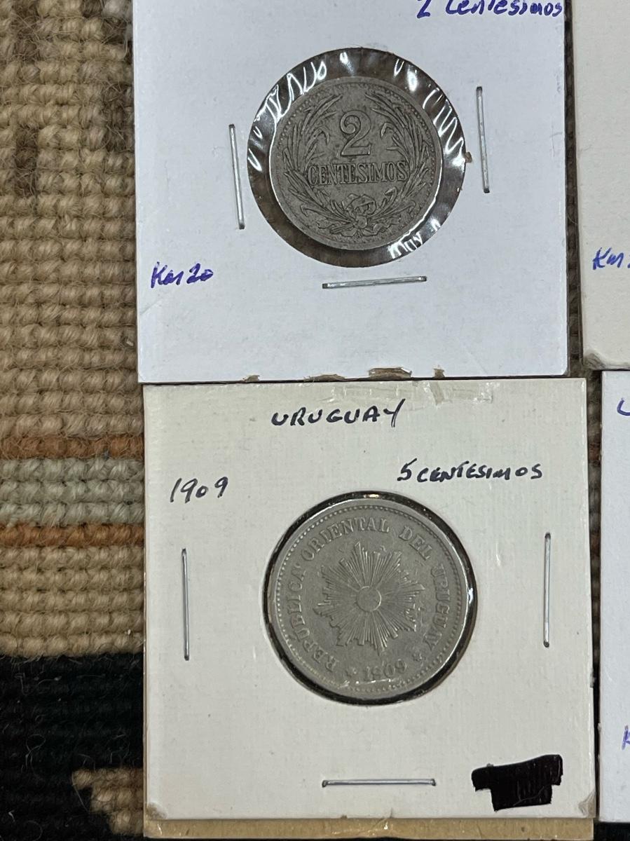 (8) vintage Uruguay coins - 1936 2 centesimos, 1909 5 centesimos, 1942 20 centesimos, 1893 10 centesimos, 1909 2 centesimos, 1909 5 centesimos, 1909 5 centesimos, 1941 5 centesimos.