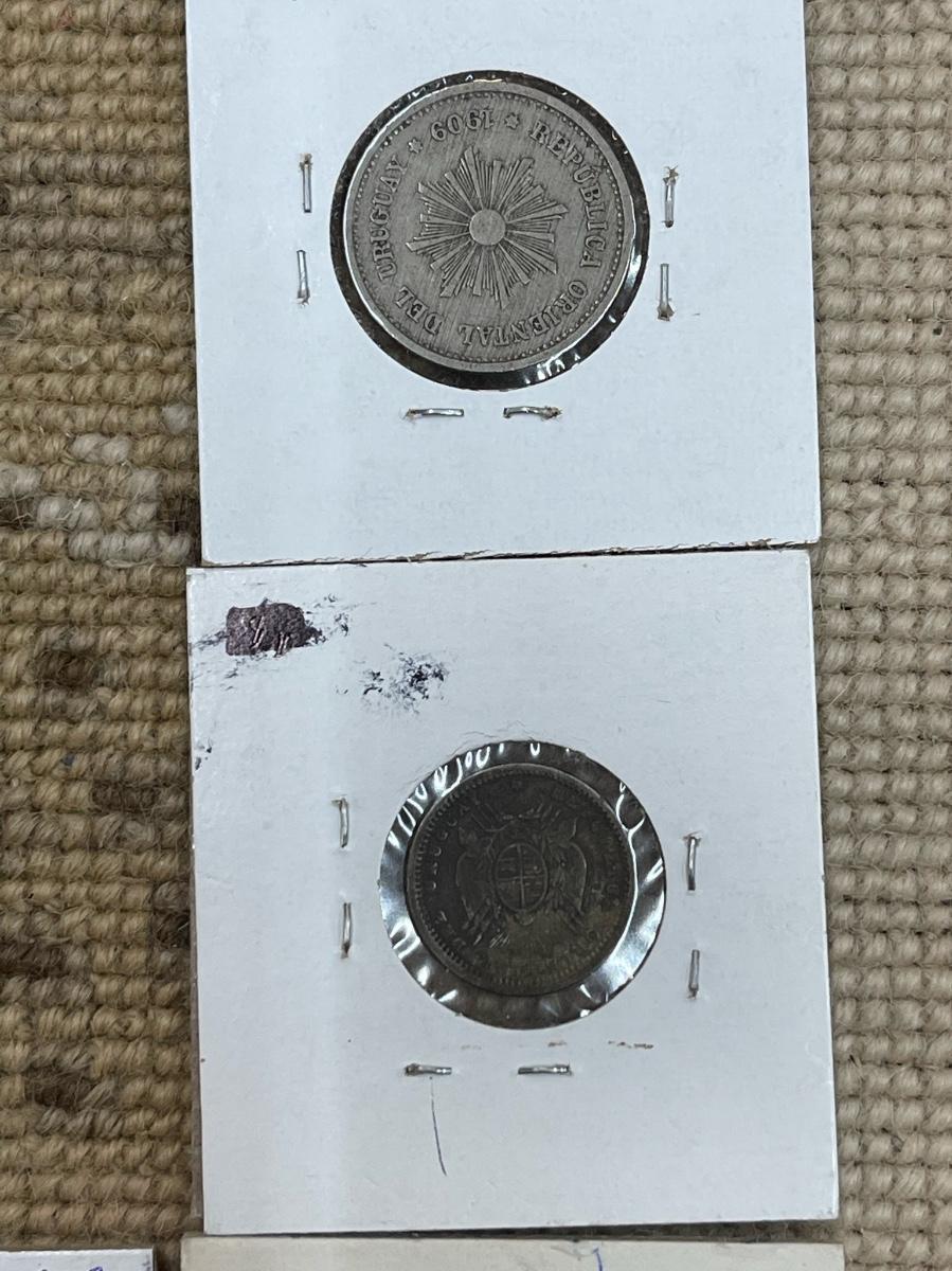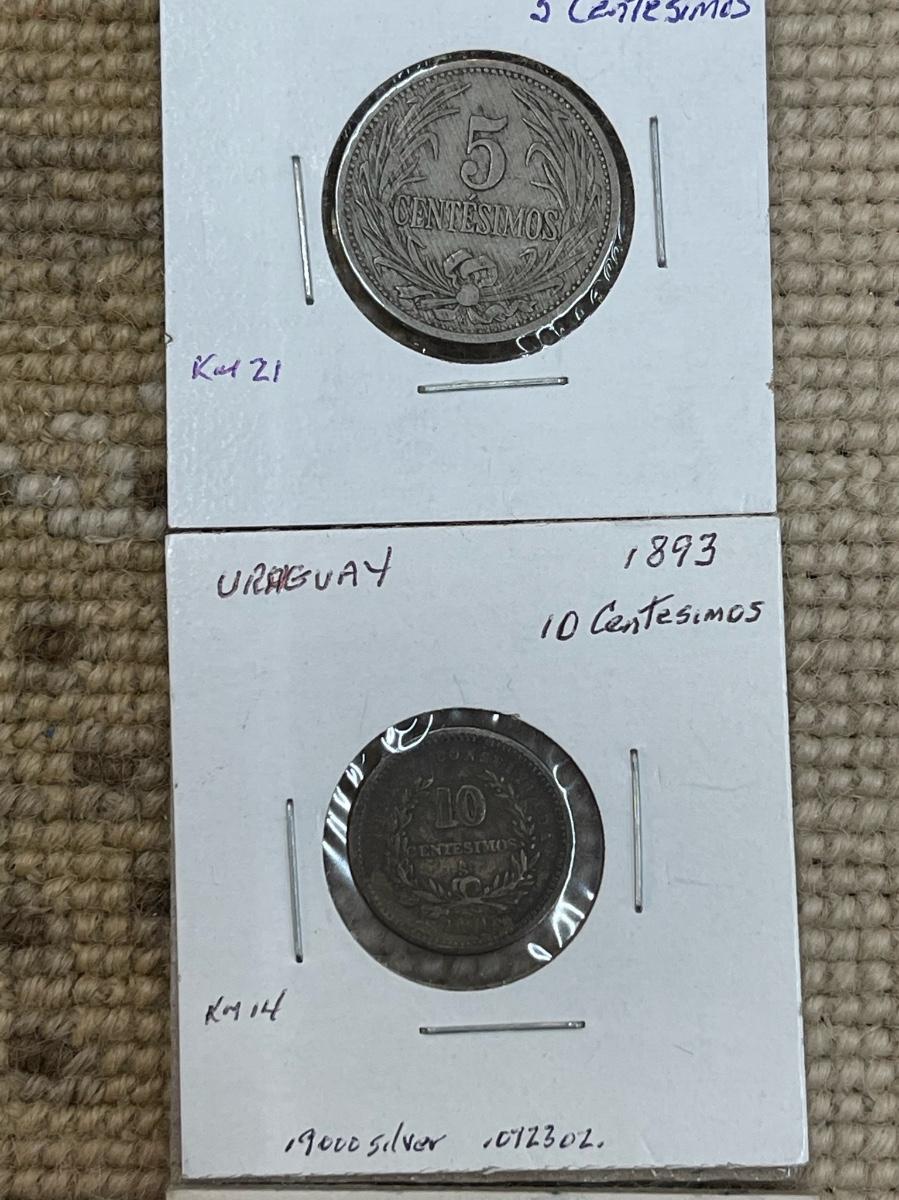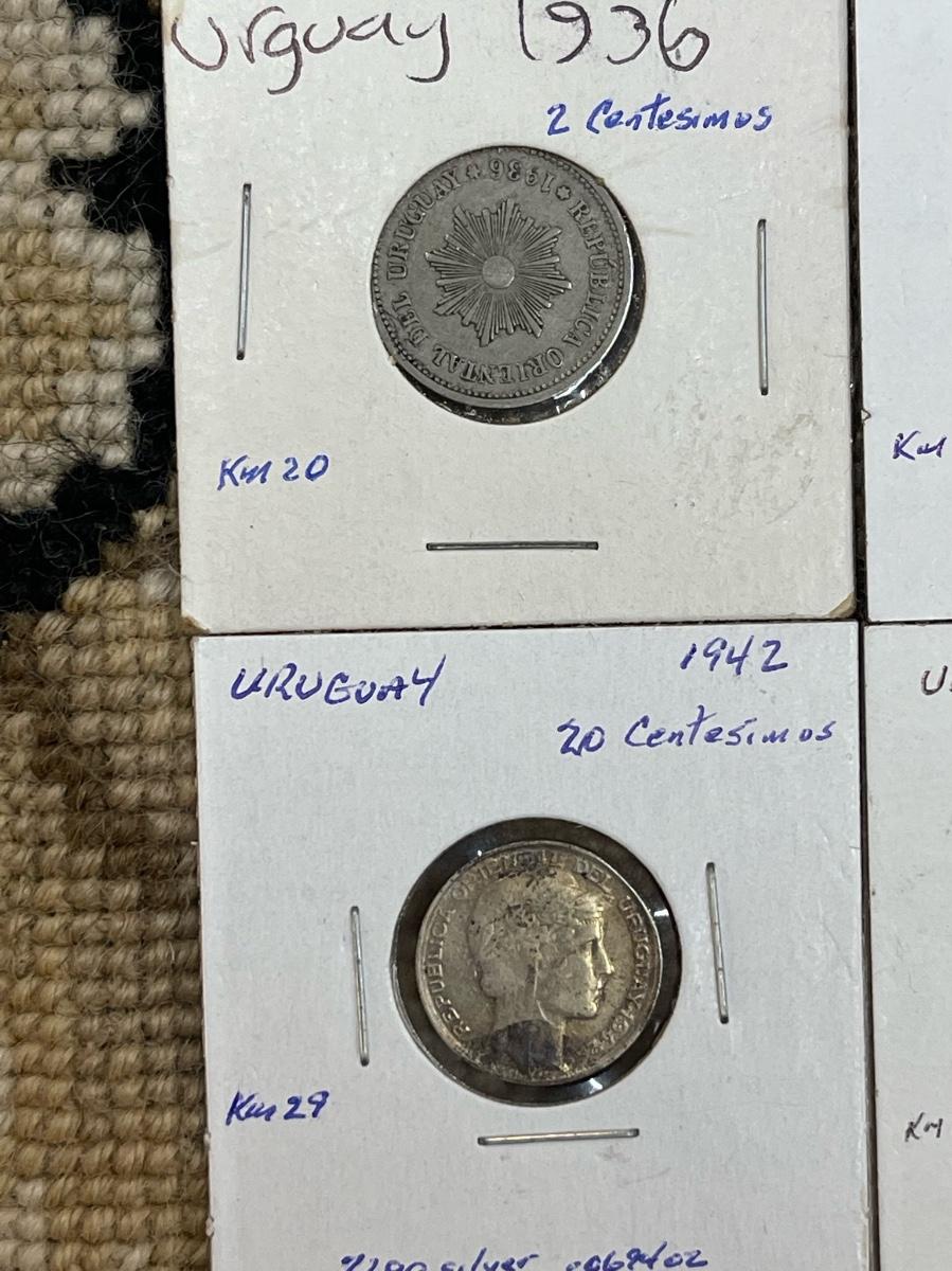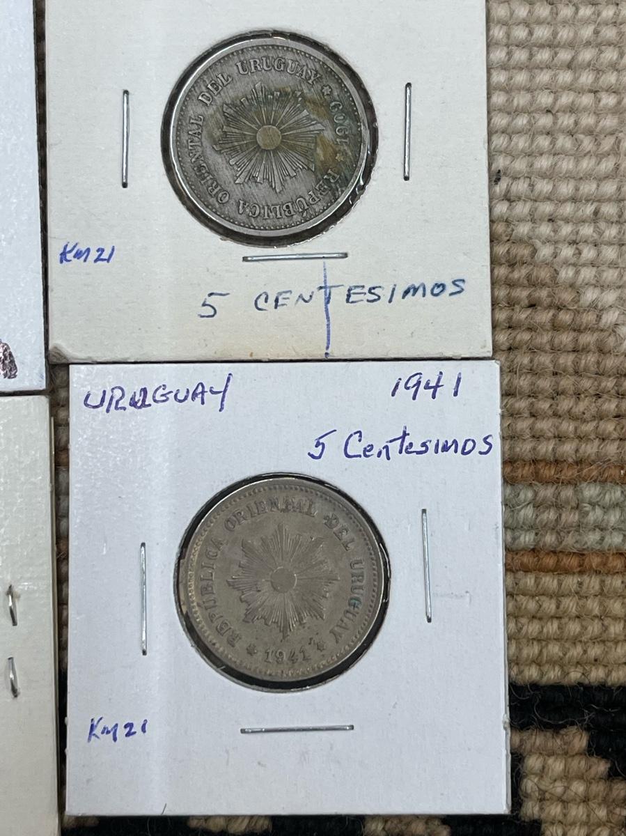 (8) vintage Uruguay coins - 1936 2 centesimos, 1909 5 centesimos, 1942 20 centesimos, 1893 10 centesimos, 1909 2 centesimos, 1909 5 centesimos, 1909 5 centesimos, 1941 5 centesimos.