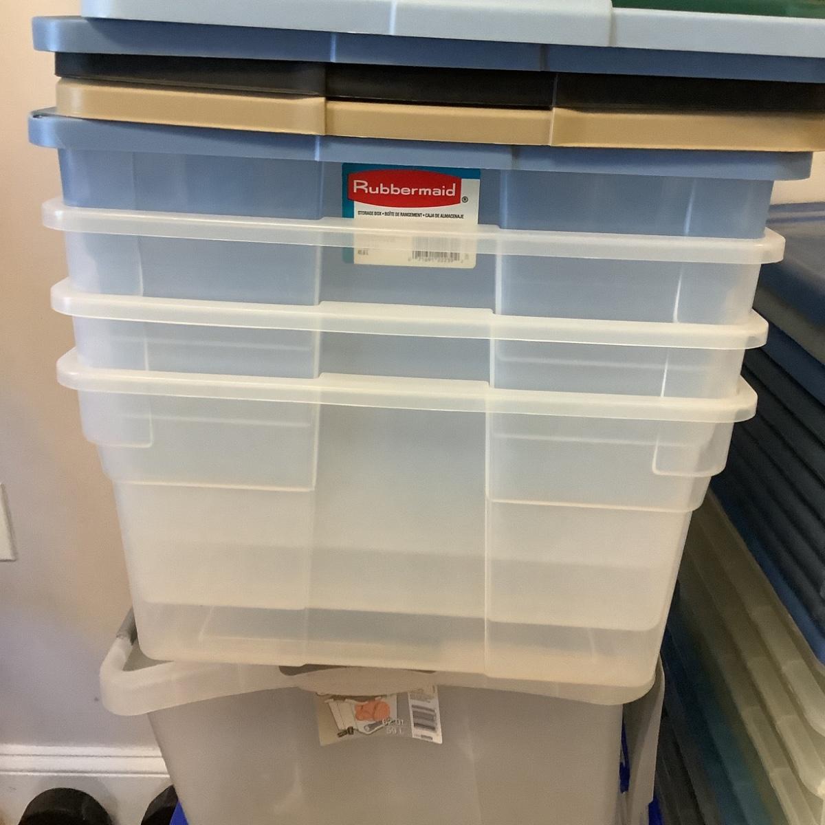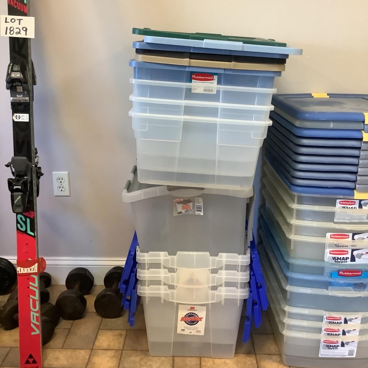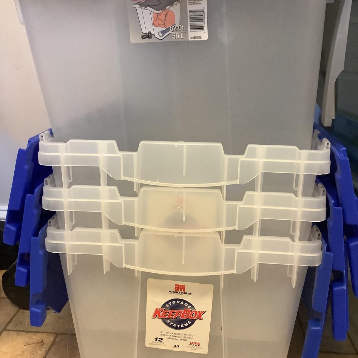 There are 3 of the Akro flip top lid containers, 4 of the rubbermaid with lids and a sterilite 62 qt container.