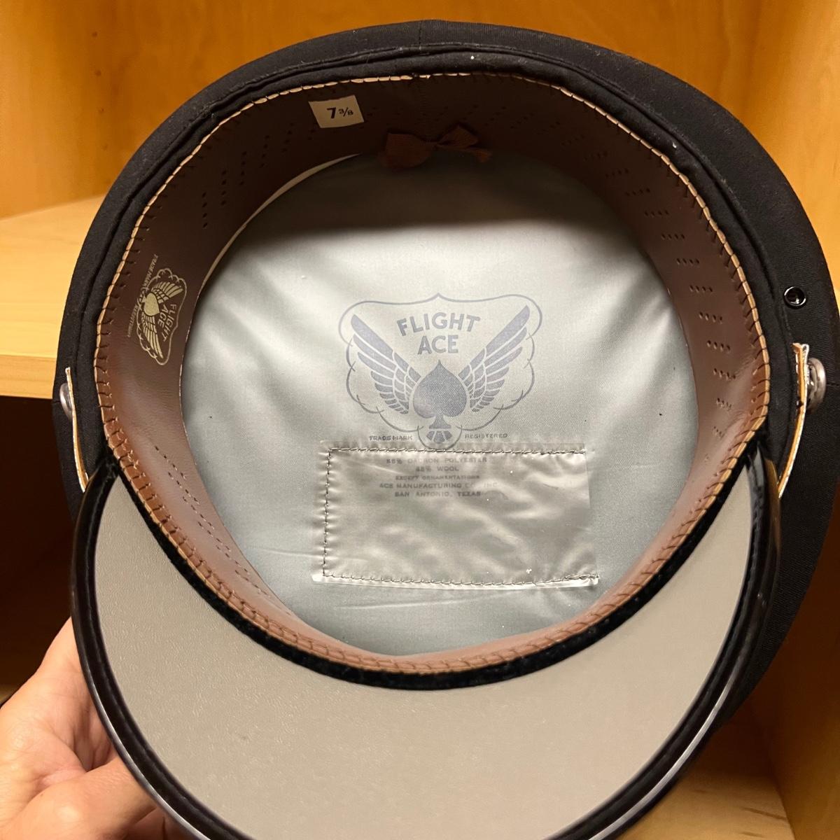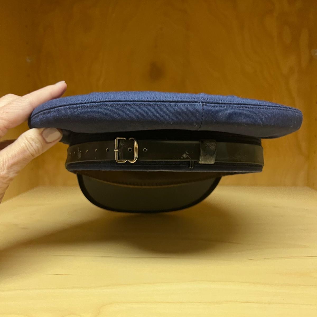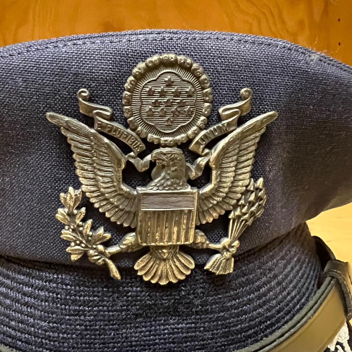 Four US Air Force dress hats. One blue crown cap size large, two US Air force dress officer hats size 7 3/8 and one USAF flight cap (size not available).