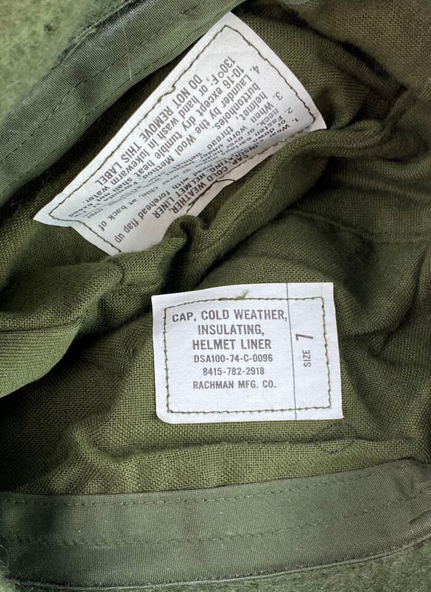 lightest use on this U.S. Army Cold Weather Insulating Helmet Liner Cap...Size 7...Made by the RACHMAN MFG CO. circa 1974...DSA100-74-C-0096...Original issue