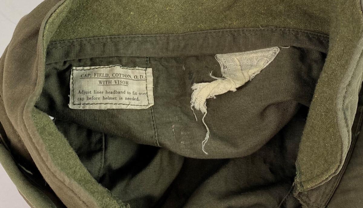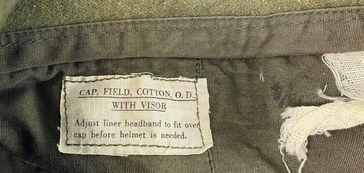 In very good condition with only light use wear here is an original issue cotton poplin U.S. Army O.D. Field Cap with Visor Size 6 3/4...with flannel ear flap. Circa early 1950's..Korean War era