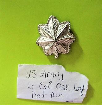 US Army Lt. Col. Oak Leaf Hat Pin: Measures 1” x 1 2/16” 6W is stamped on back of pin.
