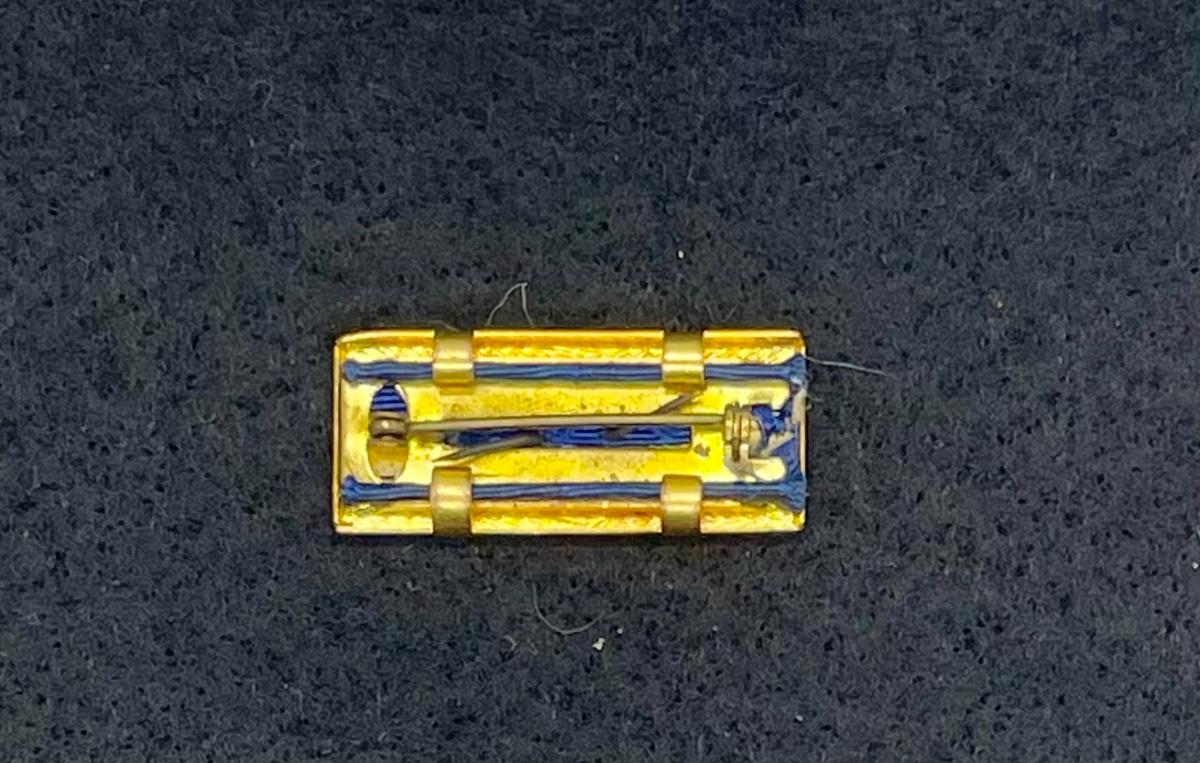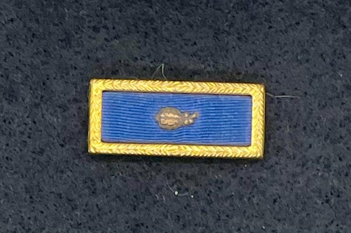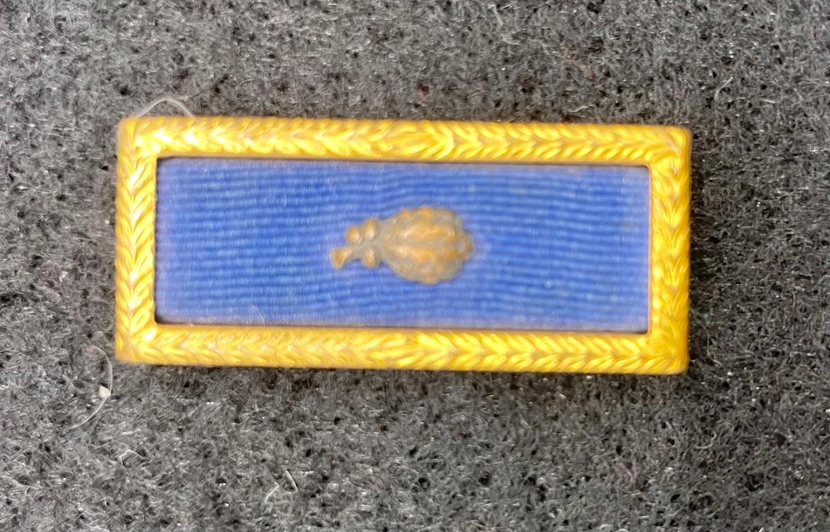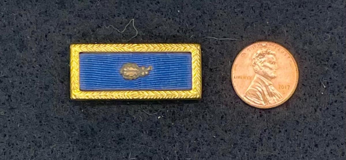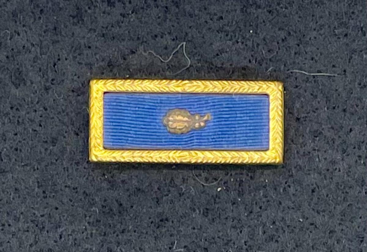 Solid-color blue ribbon with gold surround and 1 oak leaf cluster (indicates a second award). Good vintage condition.