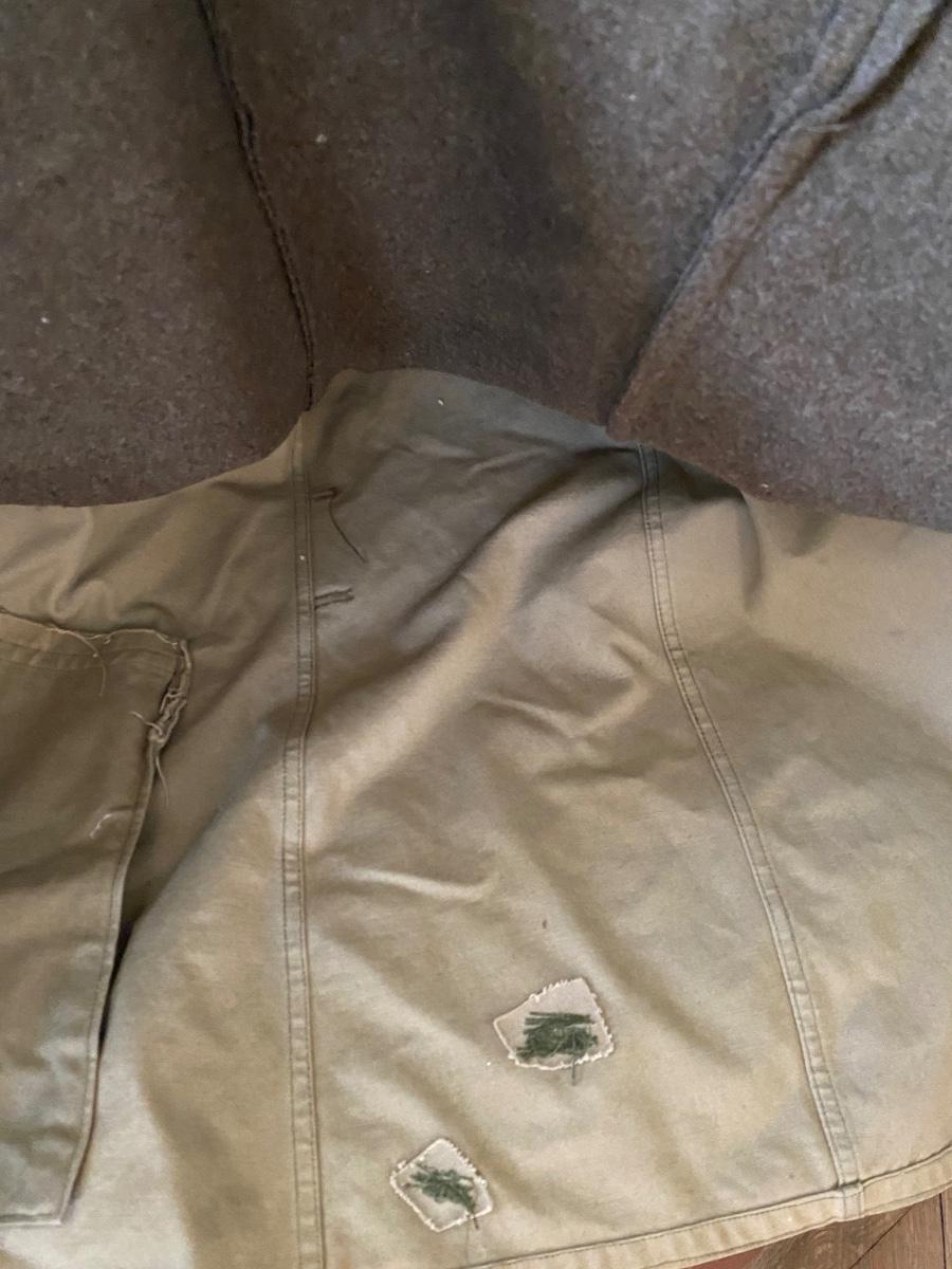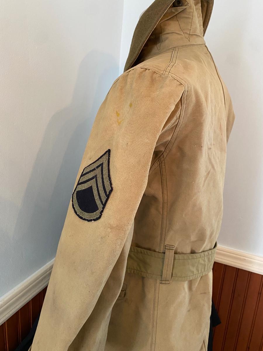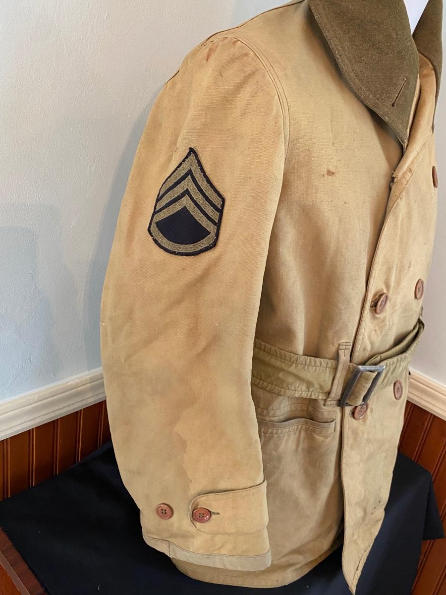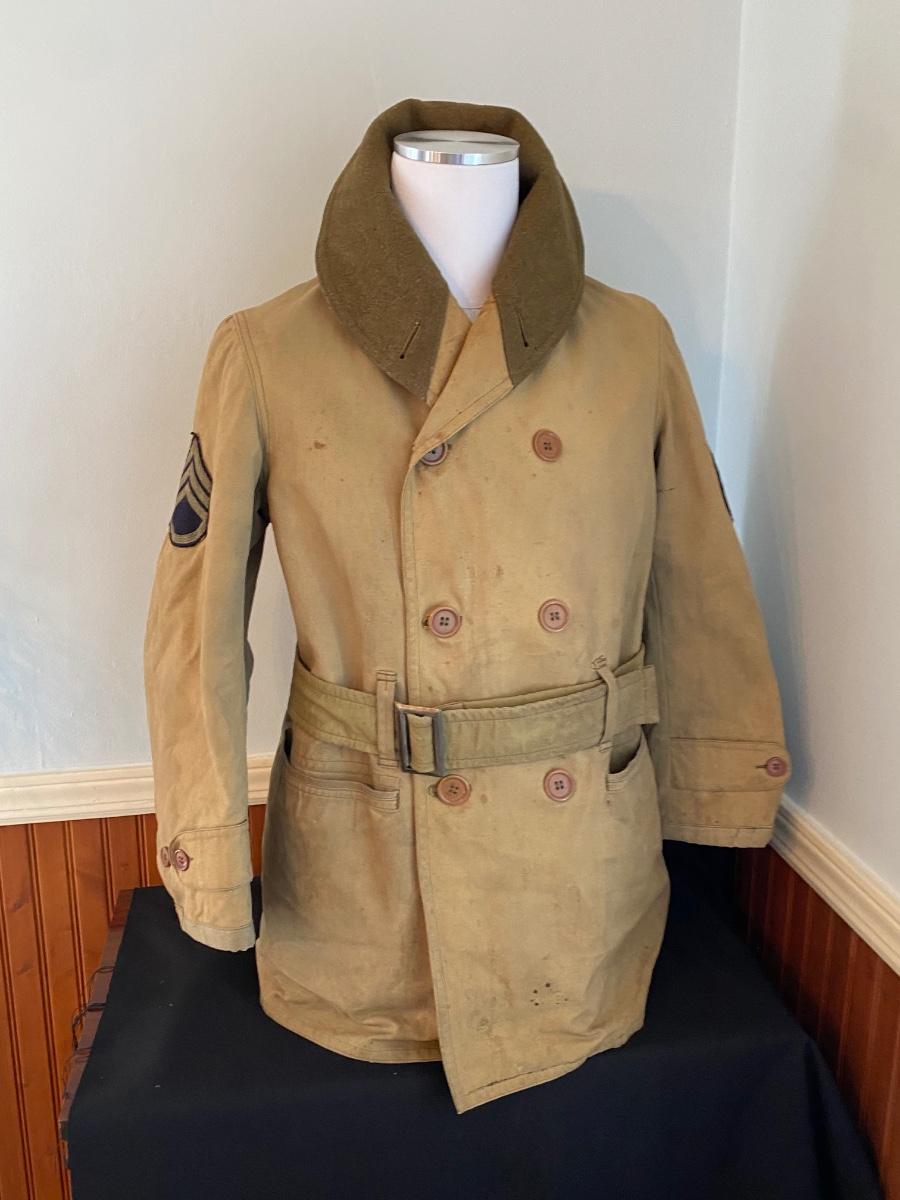US Army Winter Mackinaw Jeep Jacket Coat, vintage, constuction and condition indicated it dates to WW2 . Inner tag is too faded to read .Wool lining. Original belt which also has wool lining. Has not been stored well but in surprisingly over good condtion with no holes, mostly stains. All buttons. Staff Sargeant patch on both sleeves. Shoulder approx 17" across