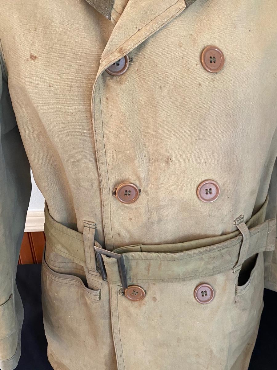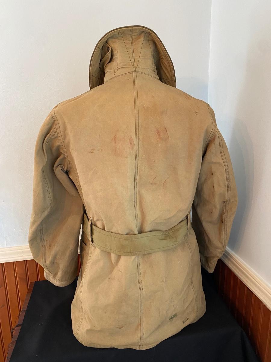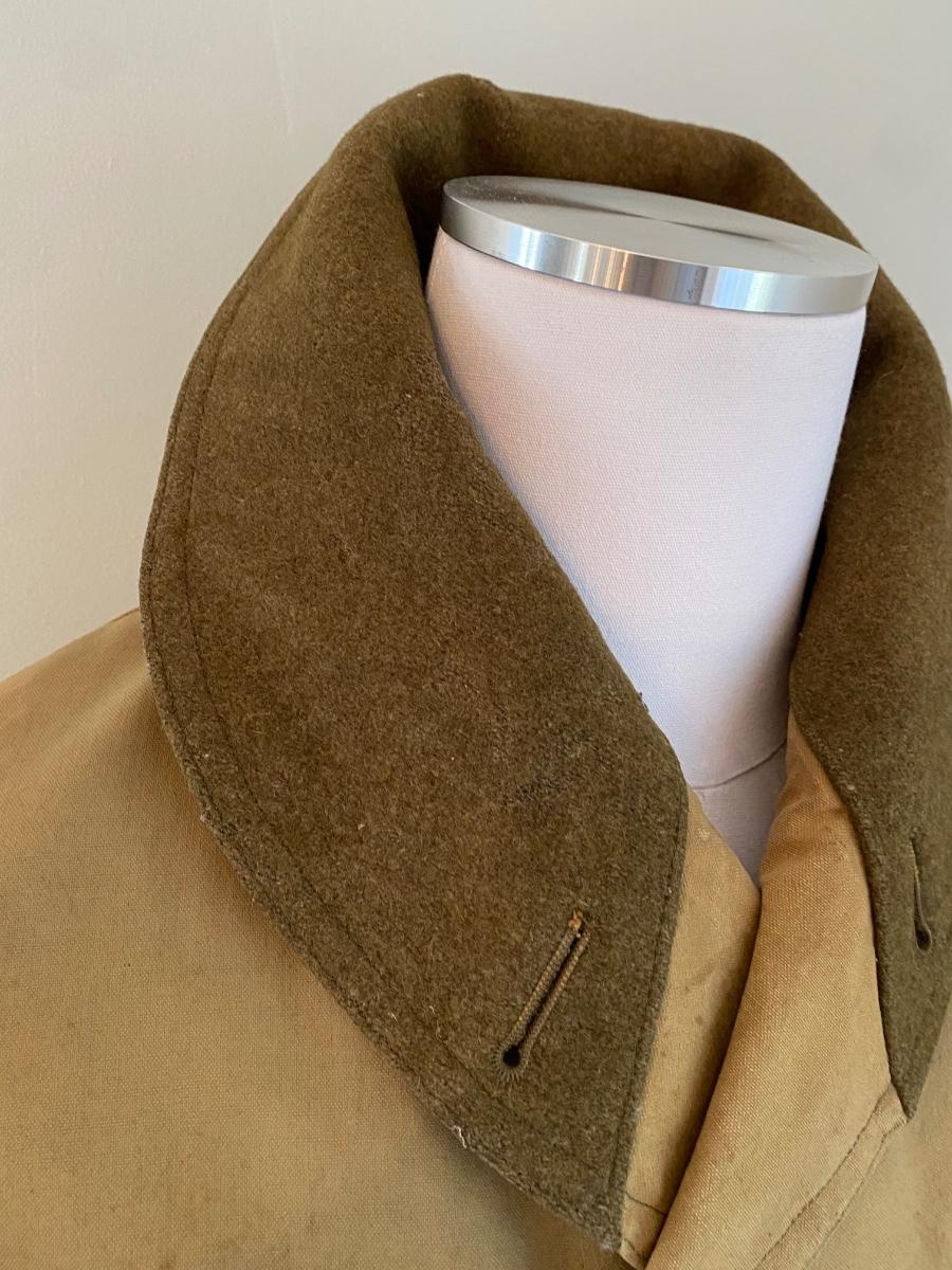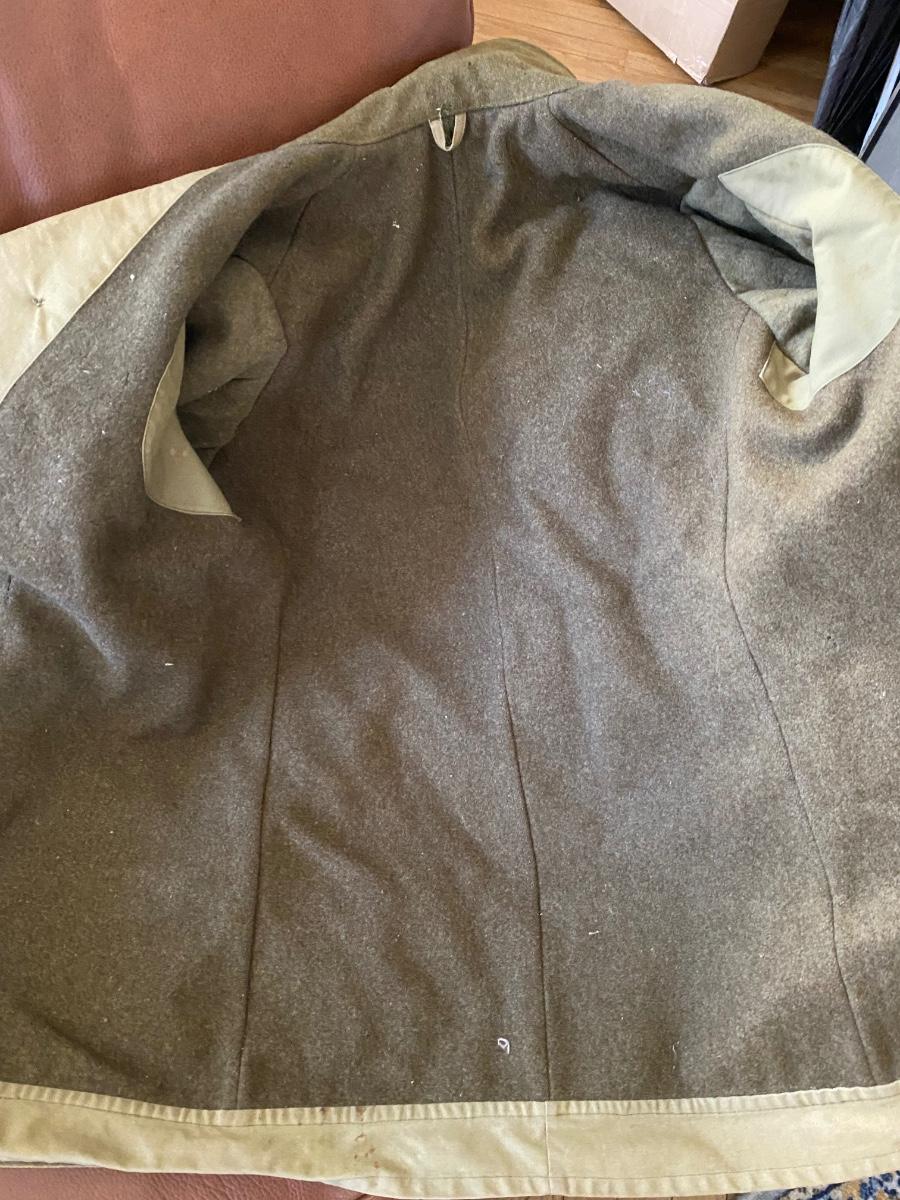 US Army Winter Mackinaw Jeep Jacket Coat, vintage, constuction and condition indicated it dates to WW2 . Inner tag is too faded to read .Wool lining. Original belt which also has wool lining. Has not been stored well but in surprisingly over good condtion with no holes, mostly stains. All buttons. Staff Sargeant patch on both sleeves. Shoulder approx 17" across