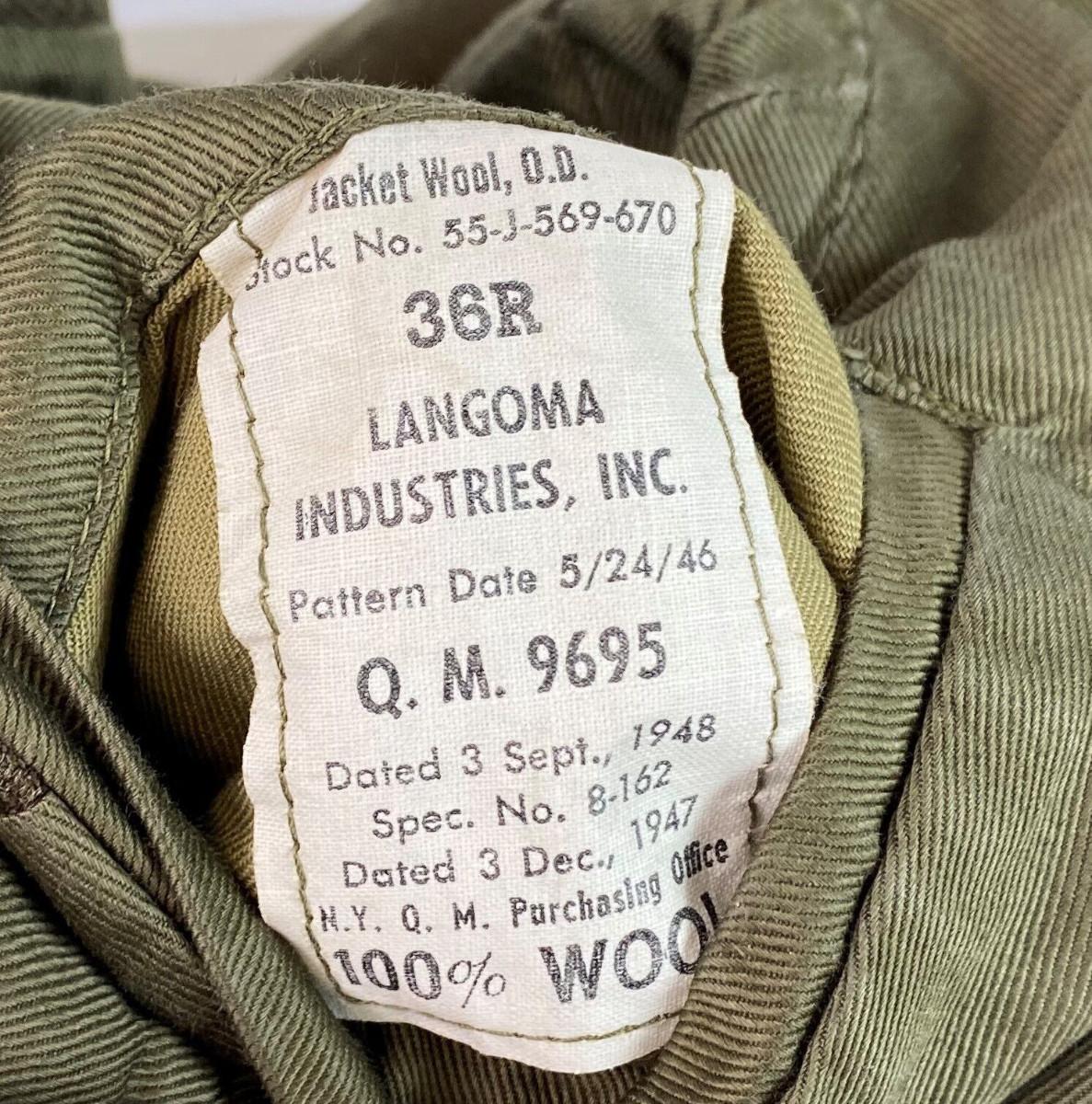 In good condition with just some wrinkles from storage here is an original "Ike" Jacket...1946 pattern made in 1948 by Langoma Industries...Spec. NO. 8-162...WOOL O.D. JACKET Size 36R...No moth holes...Insignia for Sixth Army. Corporal rating. Ordnance Corps.