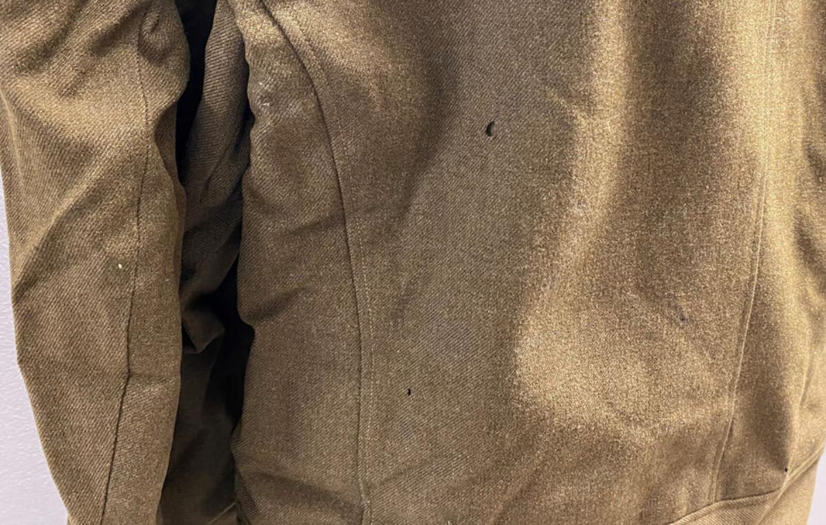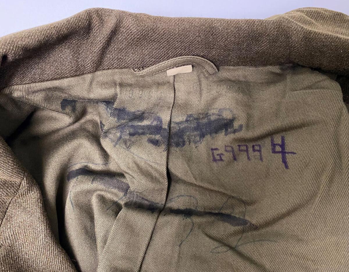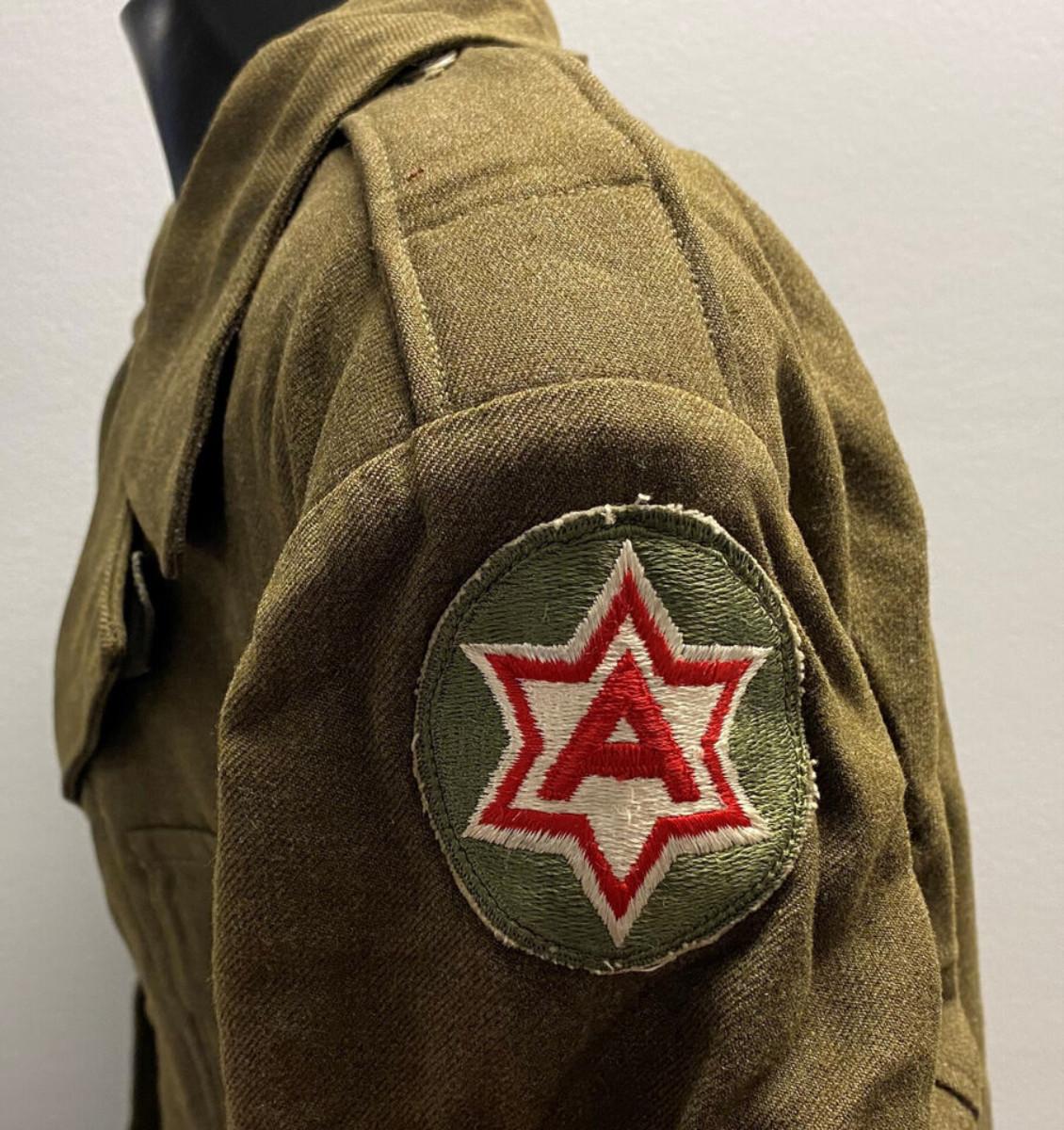 With slight wear. Some wrinkles from storage here is an original "Ike" Jacket...1946 pattern...WOOL O.D. JACKET Size 38R...Chest 36-36..Waist 33..Sleeve 33-34"...approx. sizes...The only wear is two small holes on back (pictured)...Insignia for Sixth Army.