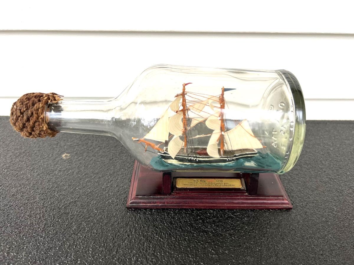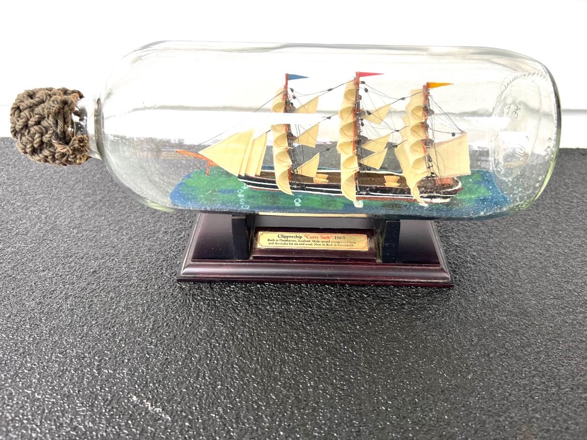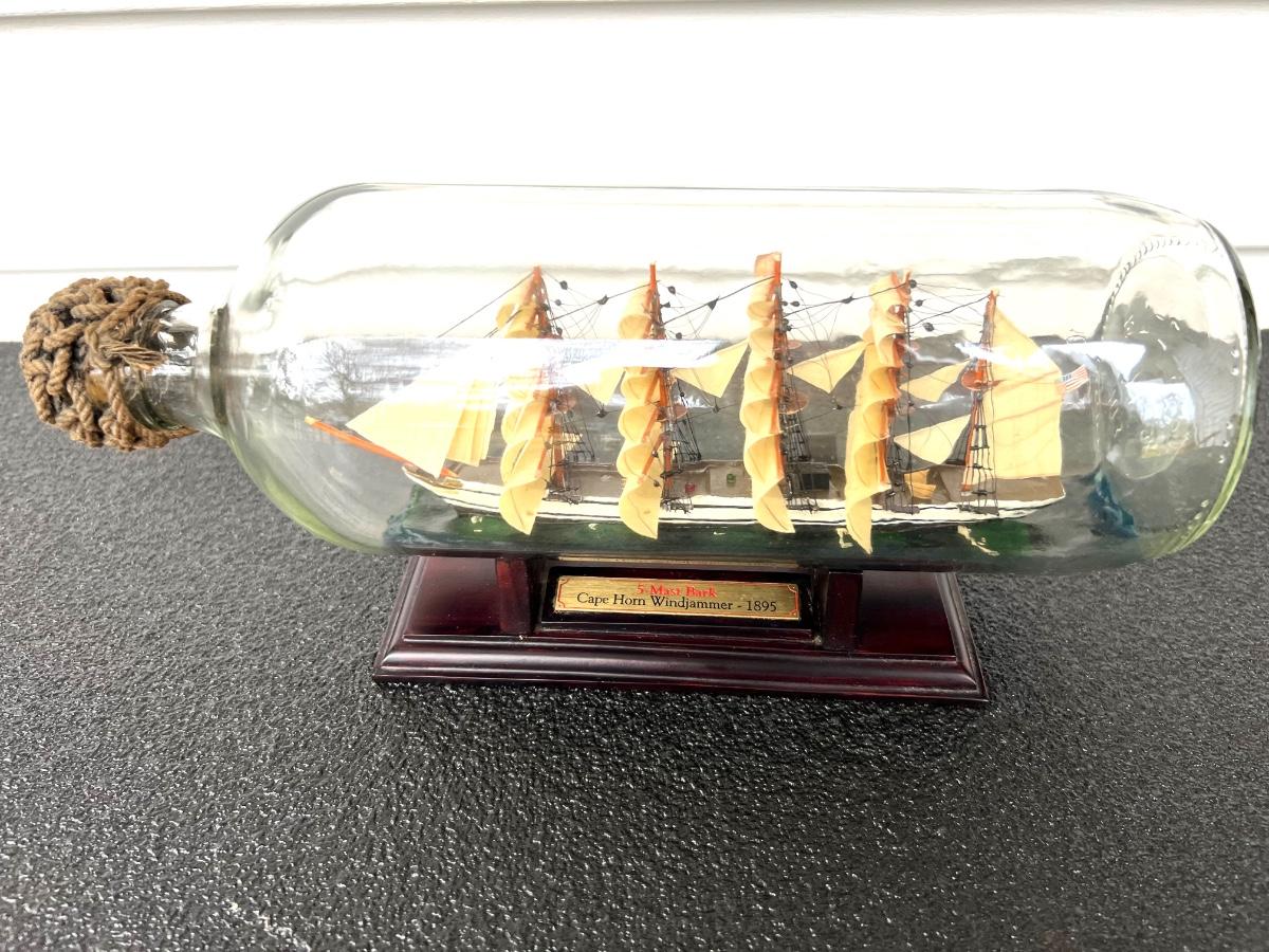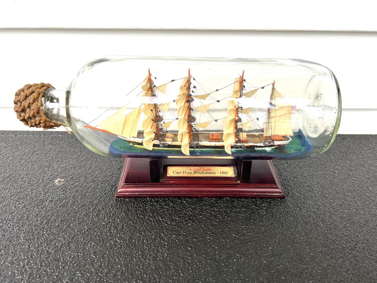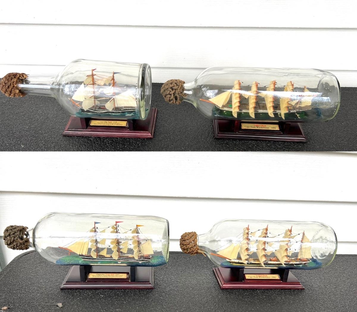 Set of 4 glass ships in a bottle US BRIG SWIFT 1778 measures 5 1/2 inches tall, 9 1/2 inches long and 3 1/2 inches wide., CAPE HORN WIND JAMMER 1895 measures 5 1/2 inches tall, 10 1/2 inches long and 3 1/2 inches wide. CAPE HORN WIND JAMMER 1880 Measures 5 inches tall, 10 1/2 inches long and 3 inches wide, CLIPPERSHIP CUTTY SARK 1869 measures 5 inches tall, 10 1/2 inches long and 3 inches wide.
