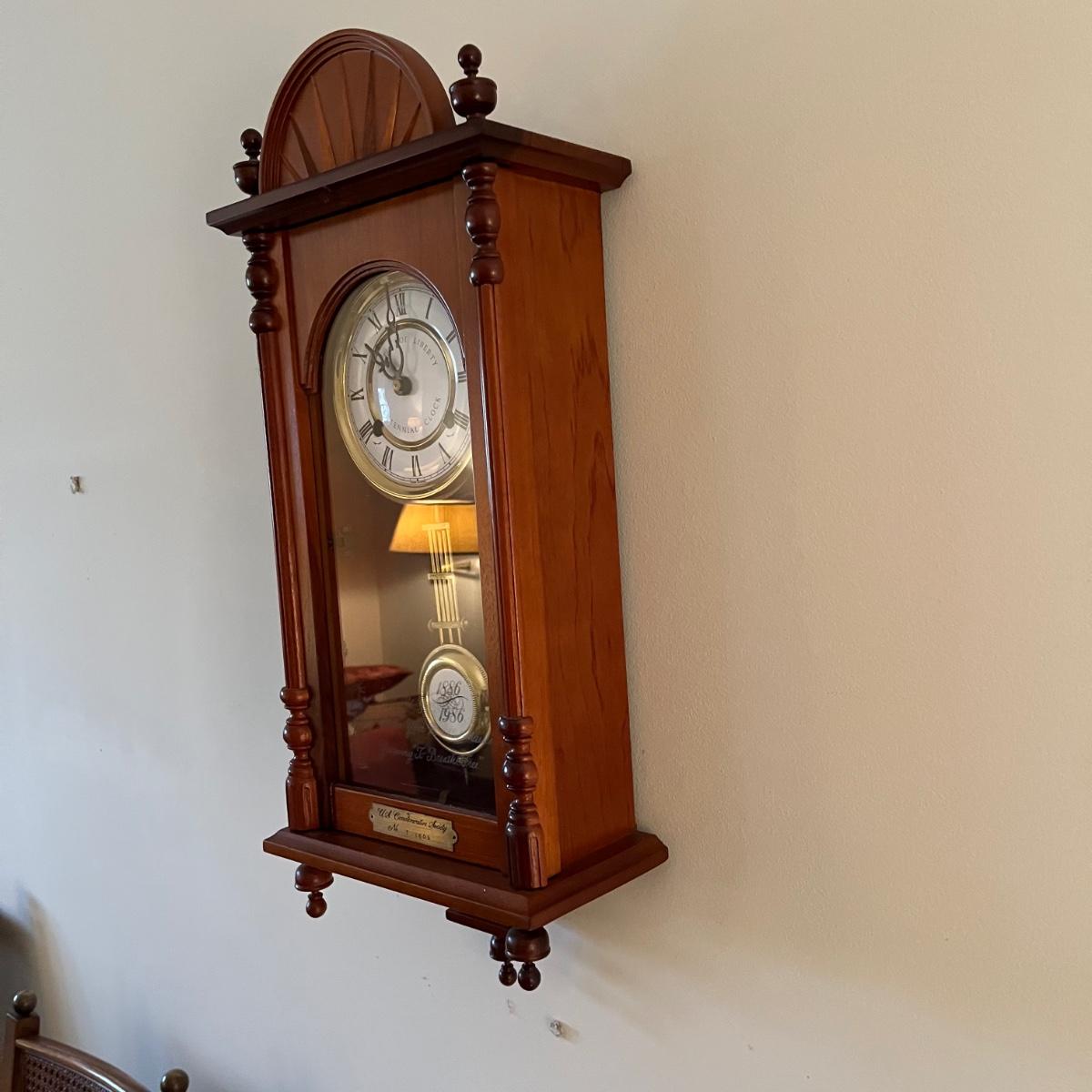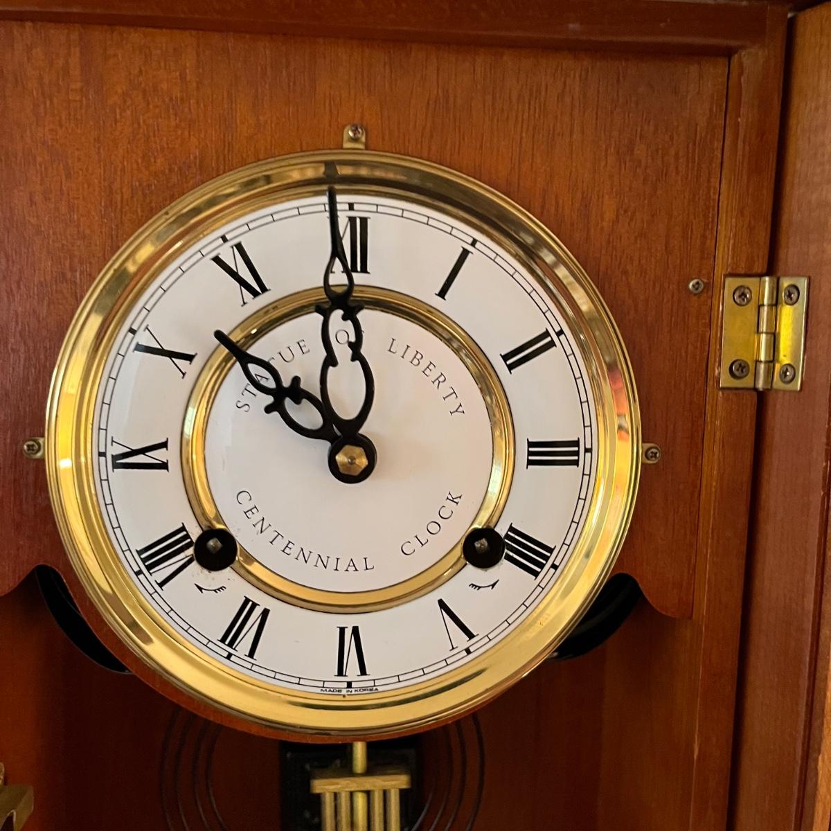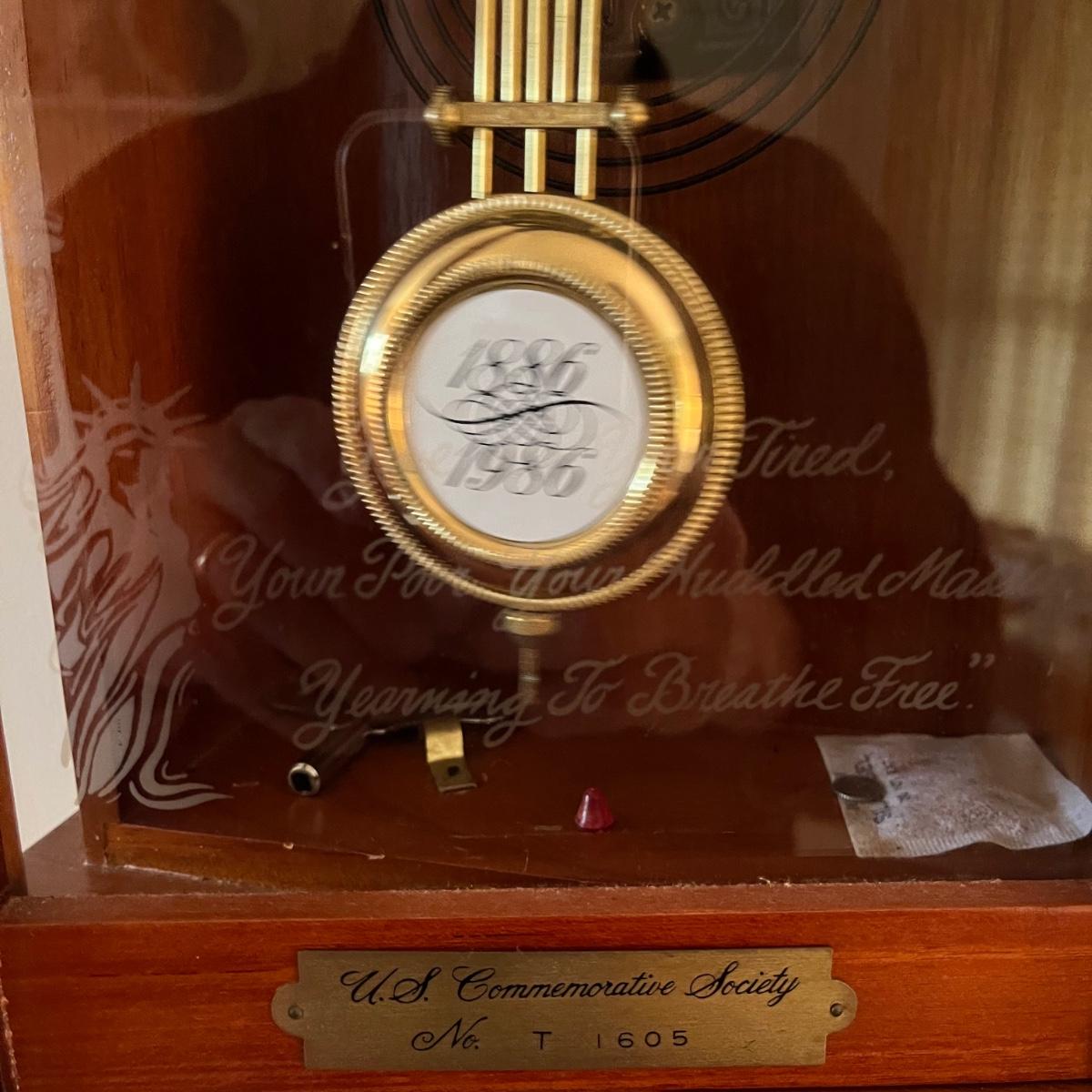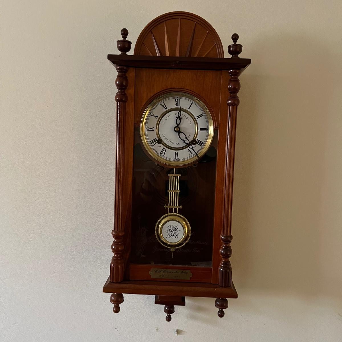Lot includes a U.S. Commemorative Society Statue of Liberty Centennial Clock. Clock worked when tested and comes with key. Clock measures 5.5” x 10.5” x 22.5” and appears that the case of the clock is all wood. Note on the back “Made in Korea.”
