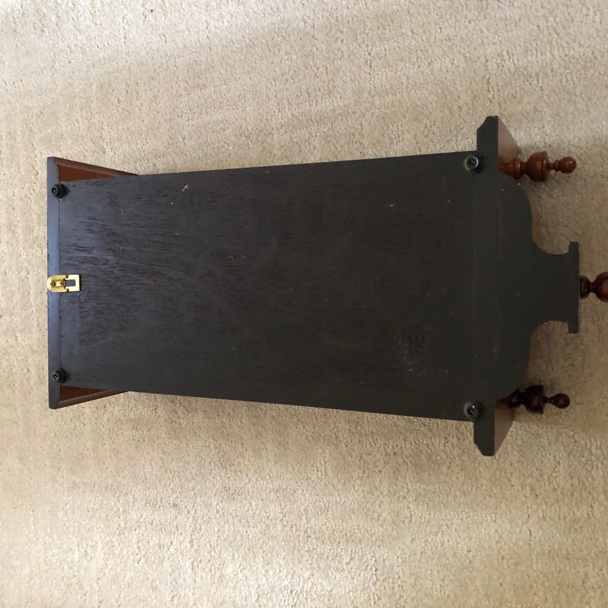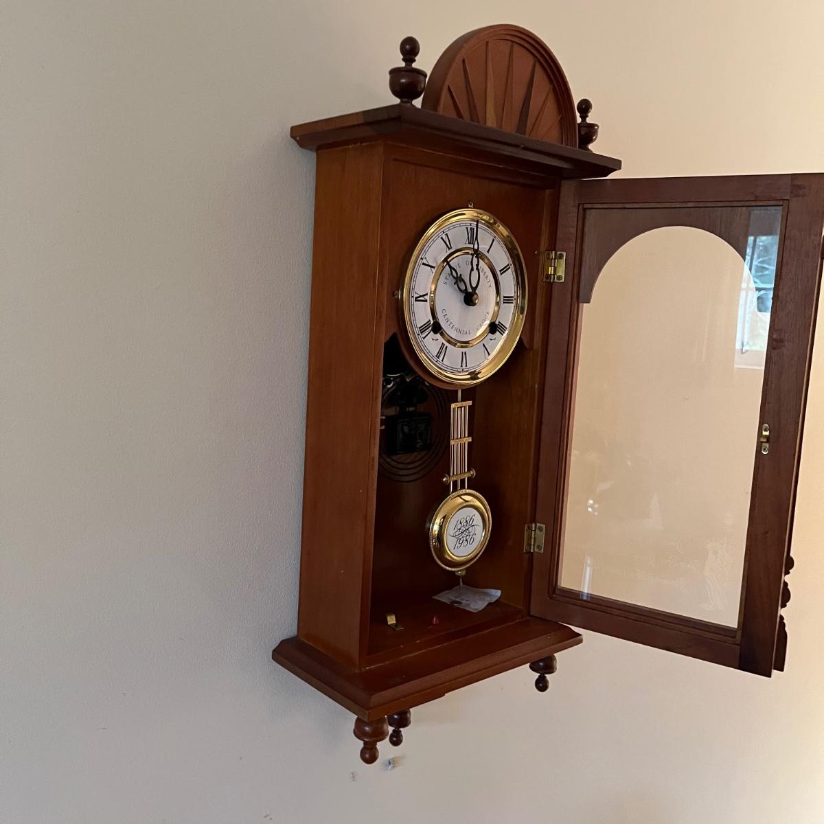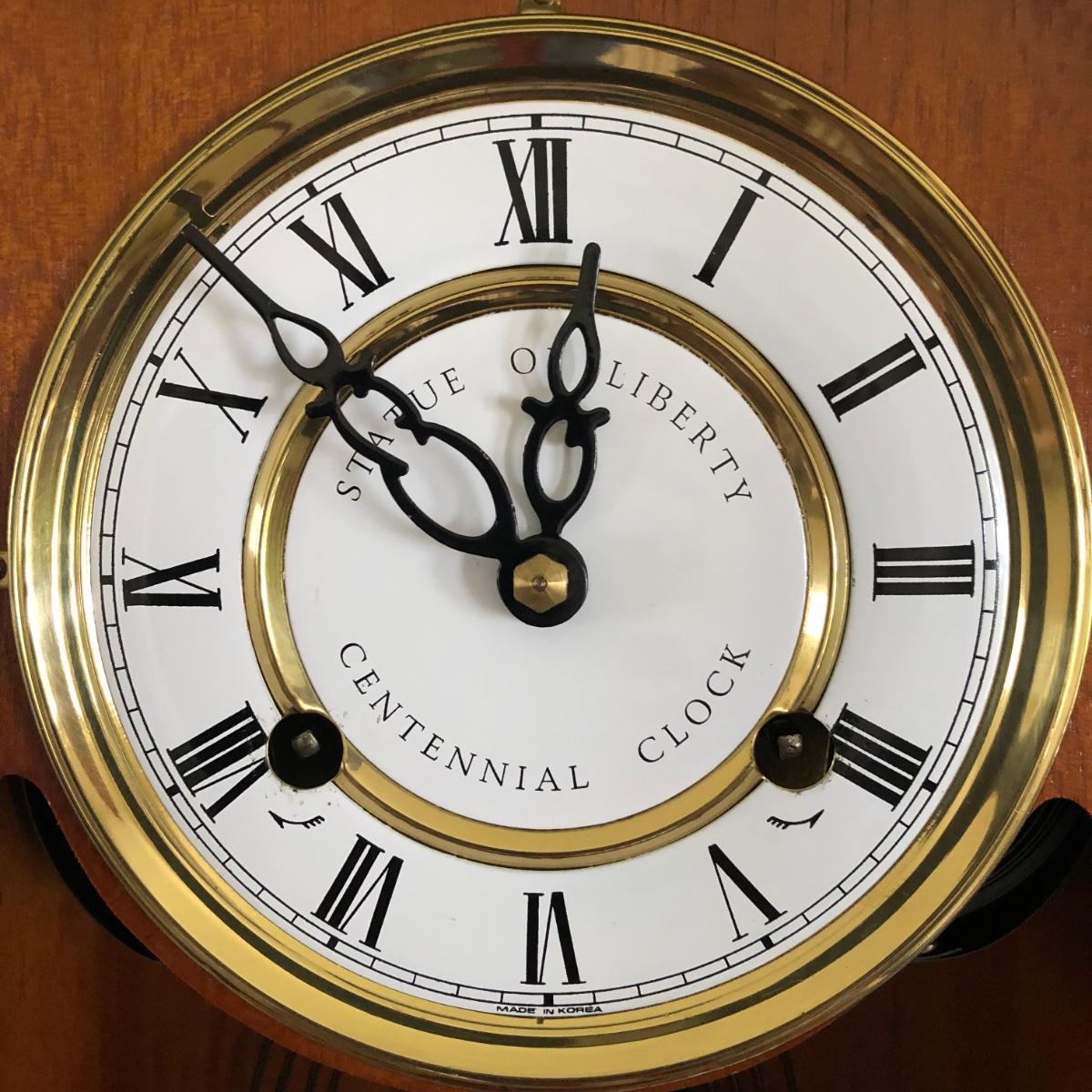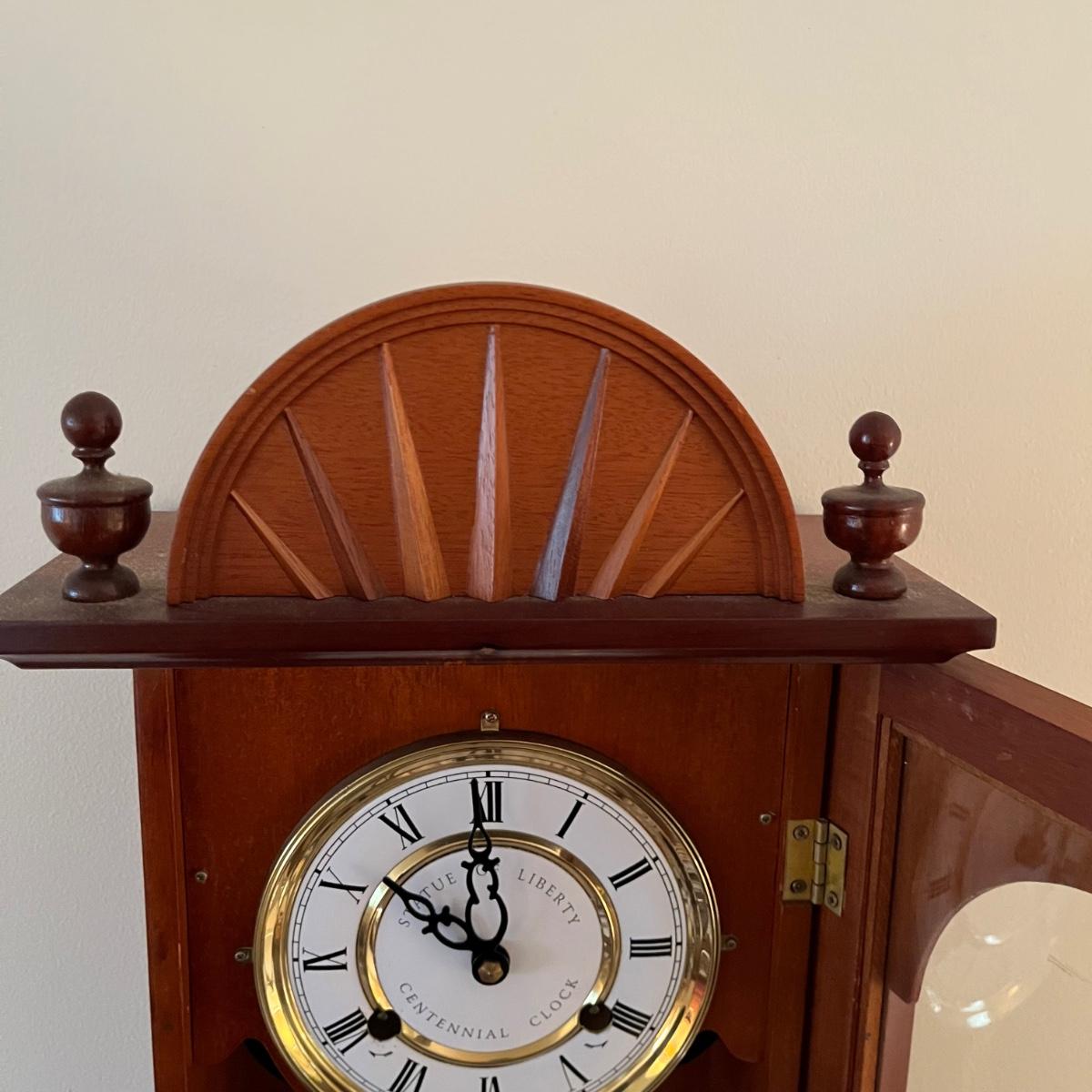 Lot includes a U.S. Commemorative Society Statue of Liberty Centennial Clock. Clock worked when tested and comes with key. Clock measures 5.5” x 10.5” x 22.5” and appears that the case of the clock is all wood. Note on the back “Made in Korea.”