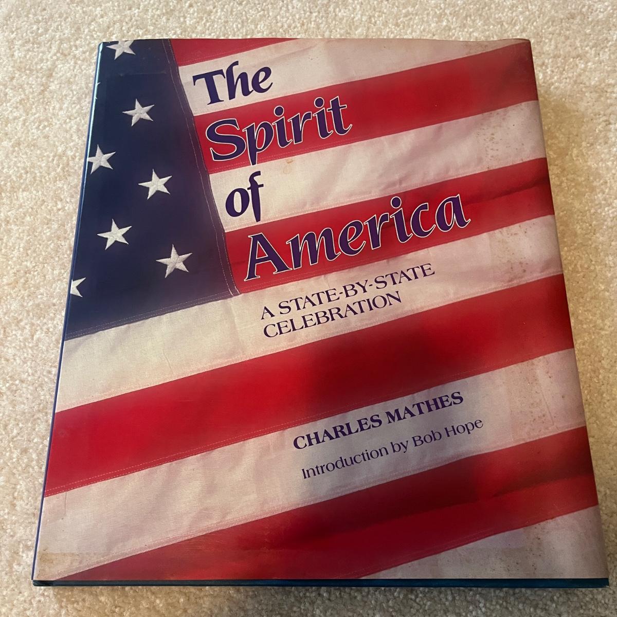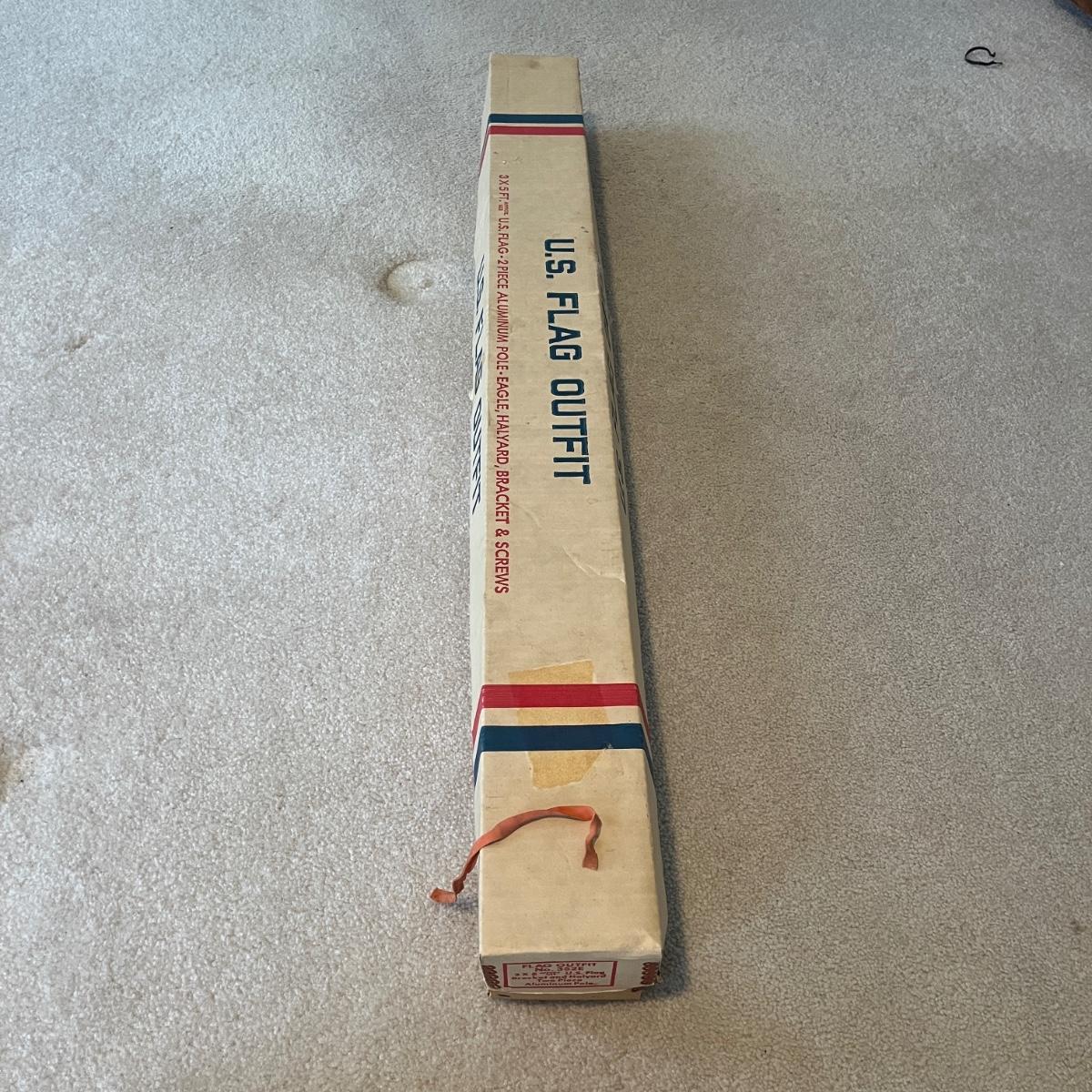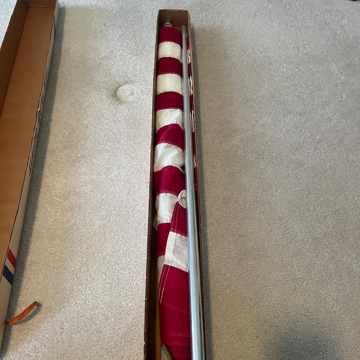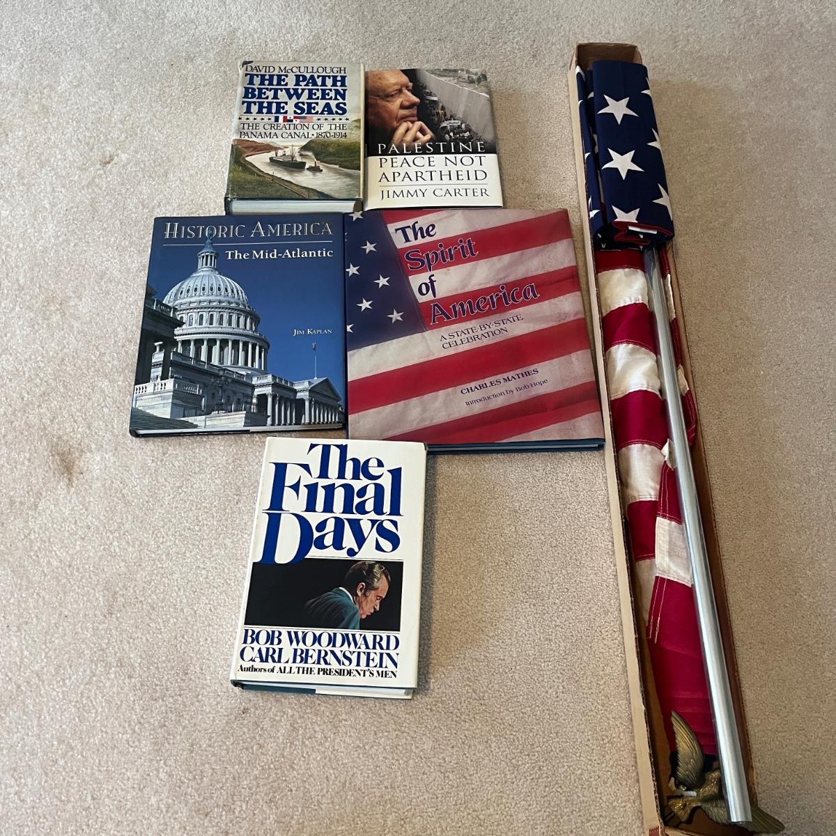 Lot includes two US flags with two-piece, six foot metal pole and five books on America and more.