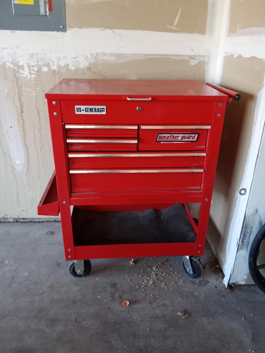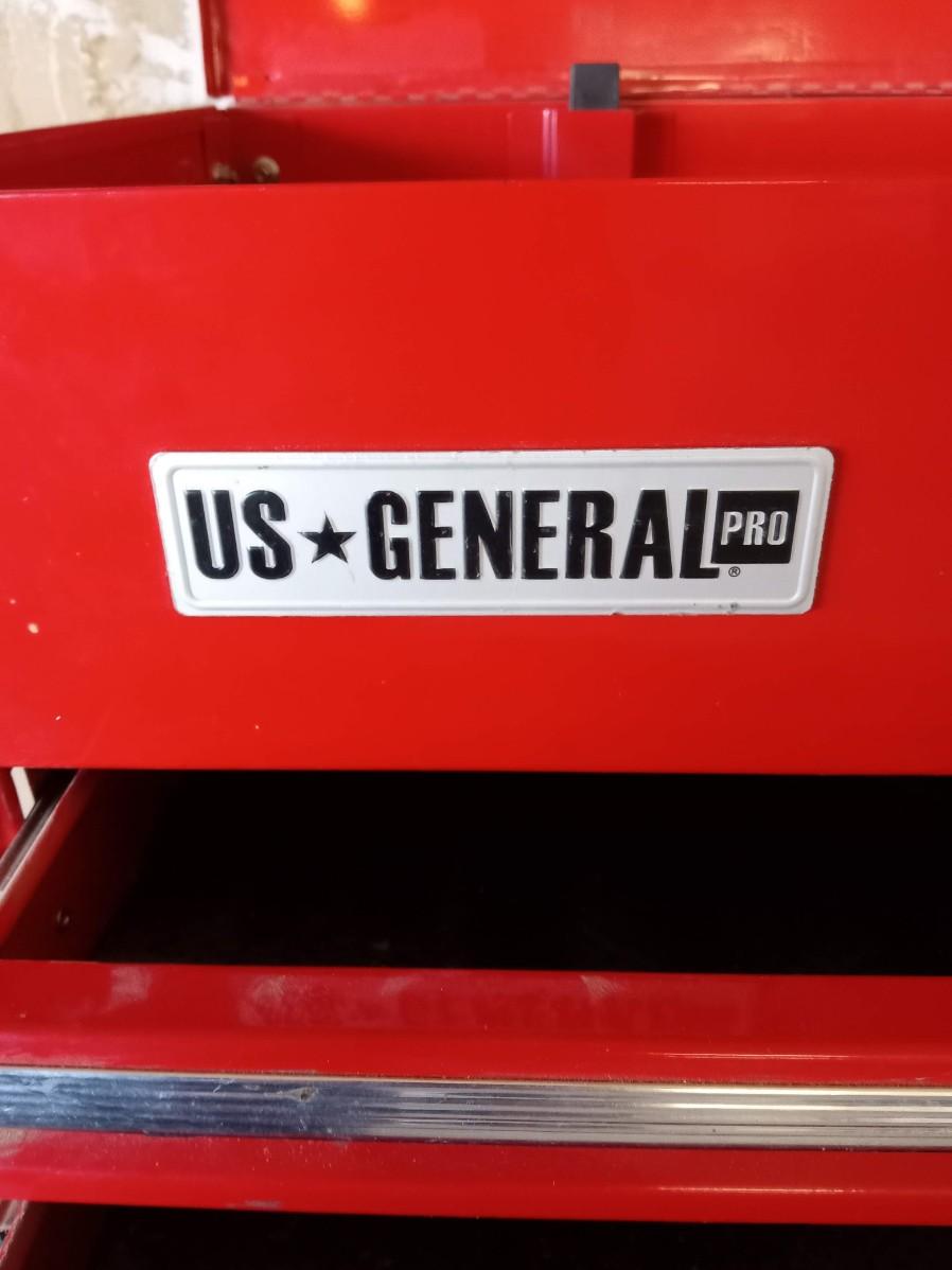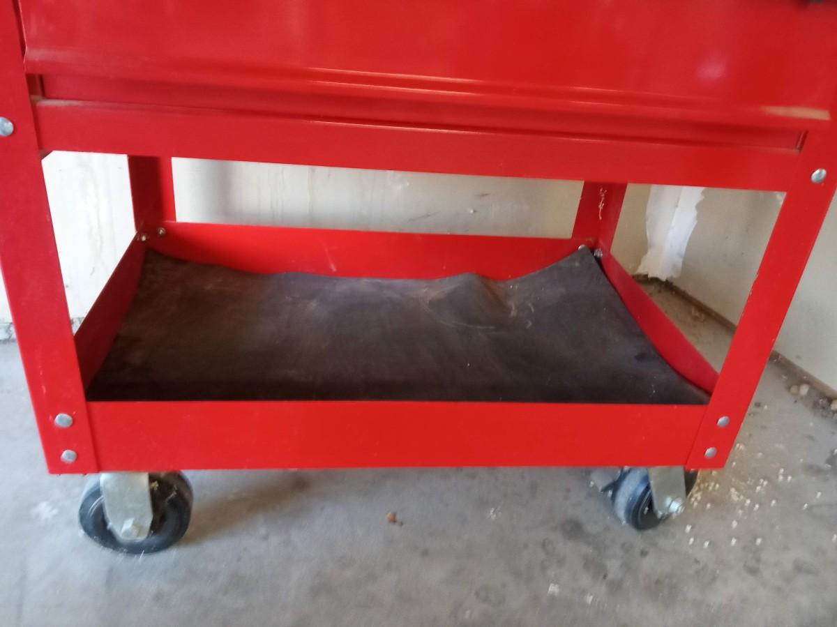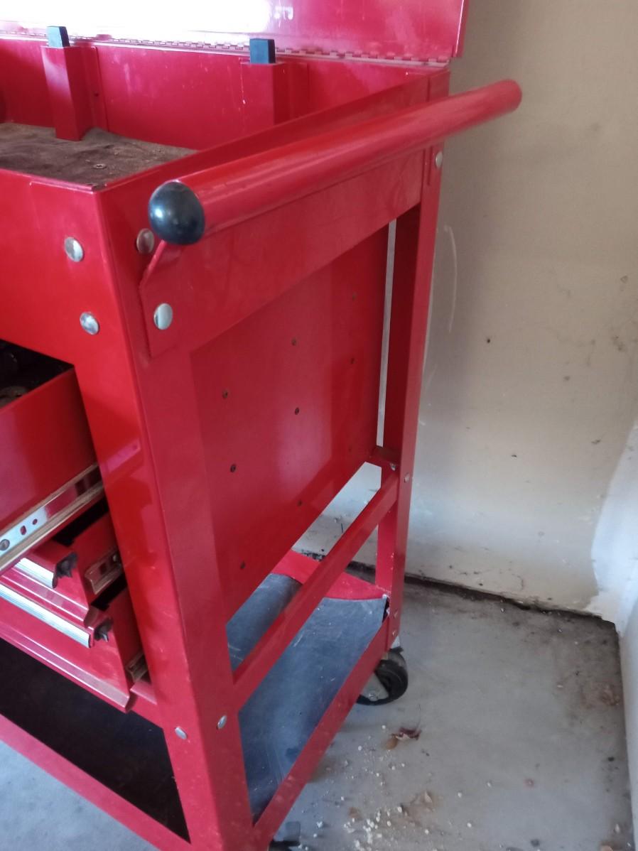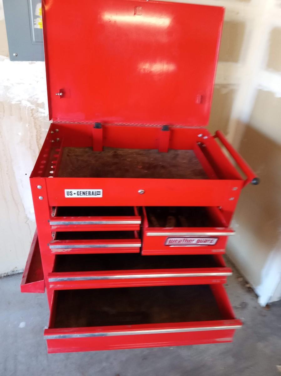 THE TOP LIFTS UP TO A LARGE DEEP SPACE, 5 DIFFERENT SIZE DRAWERS THAT OPEN WITH A SLIDE OF A KNOW LOCATED UNDER THE GRAB BAR HANDLE ON THE SIDE AND AN EXTRA TRAY ON THE OPPOSITE SIDE. THE DRAWERS SLIDE EASILY AND THE OPEN SPACE ON THE BOTTOM IS GREAT FOR BIGGER TOOLS 30" X 20.5" X 41"