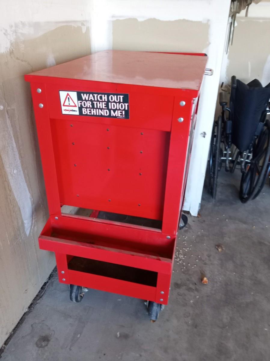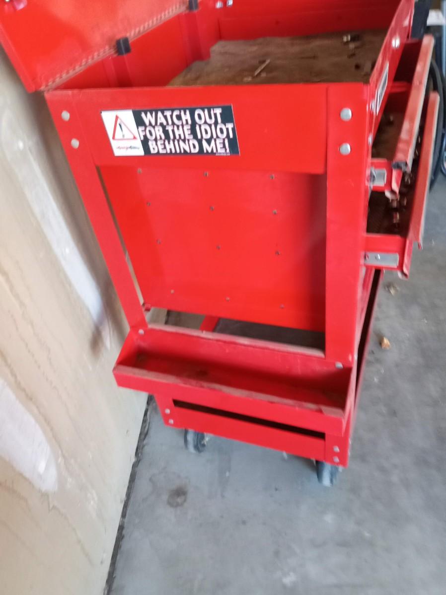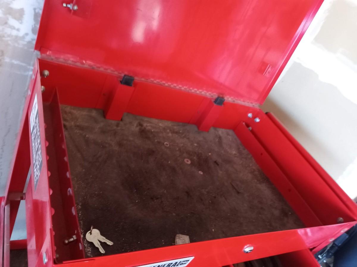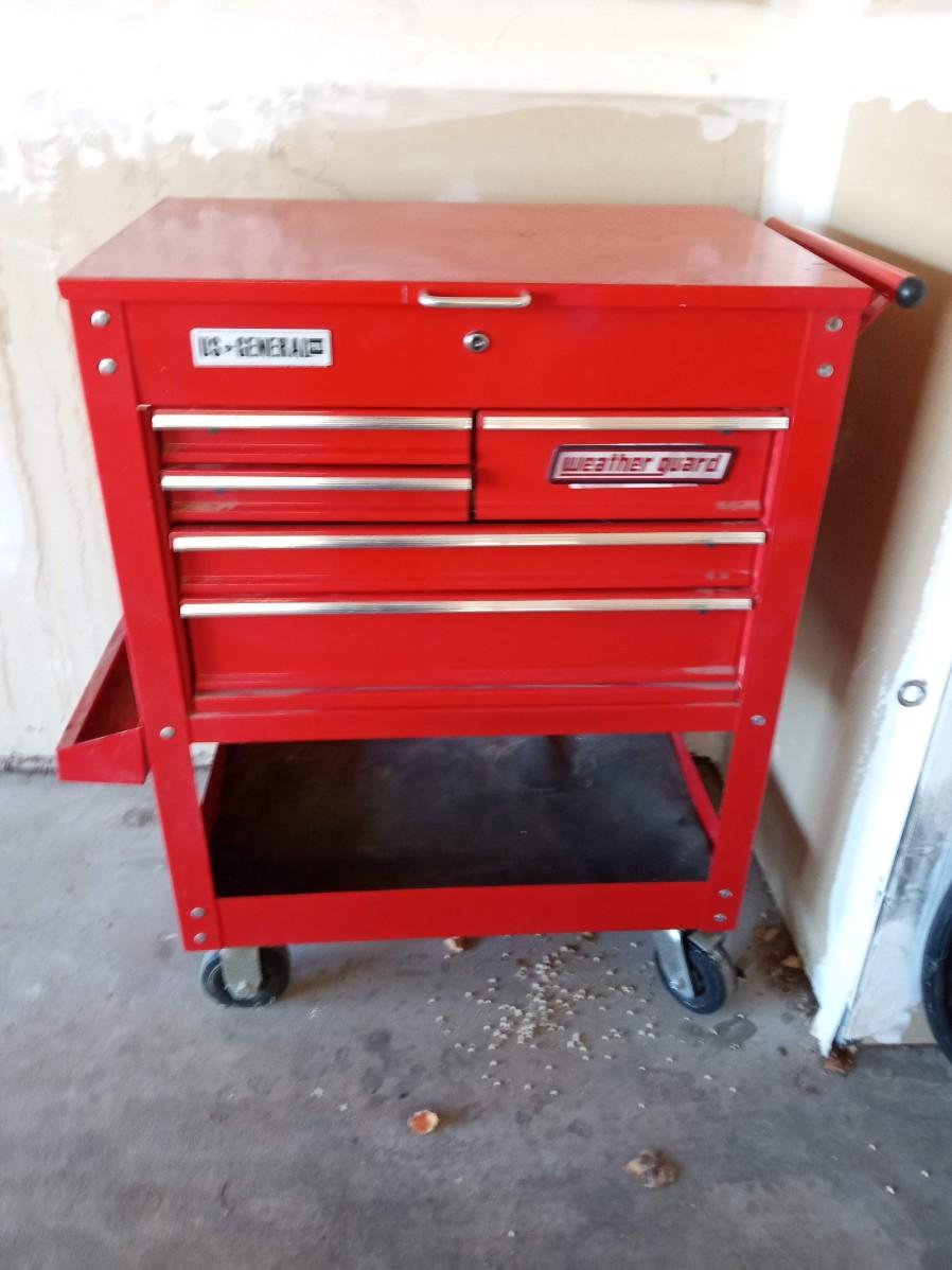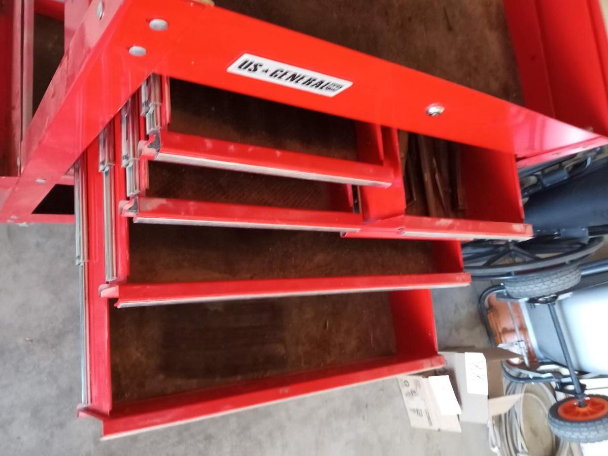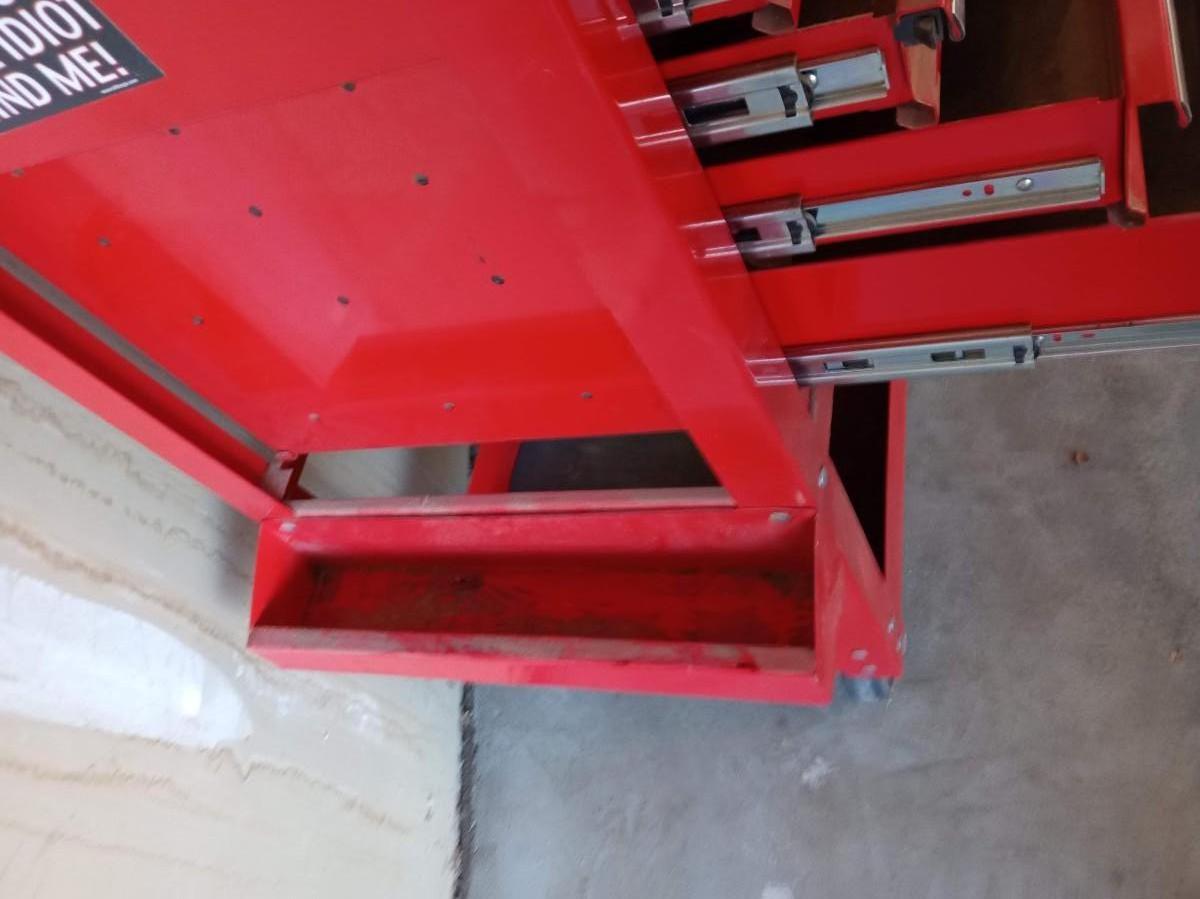 THE TOP LIFTS UP TO A LARGE DEEP SPACE, 5 DIFFERENT SIZE DRAWERS THAT OPEN WITH A SLIDE OF A KNOW LOCATED UNDER THE GRAB BAR HANDLE ON THE SIDE AND AN EXTRA TRAY ON THE OPPOSITE SIDE. THE DRAWERS SLIDE EASILY AND THE OPEN SPACE ON THE BOTTOM IS GREAT FOR BIGGER TOOLS 30" X 20.5" X 41"