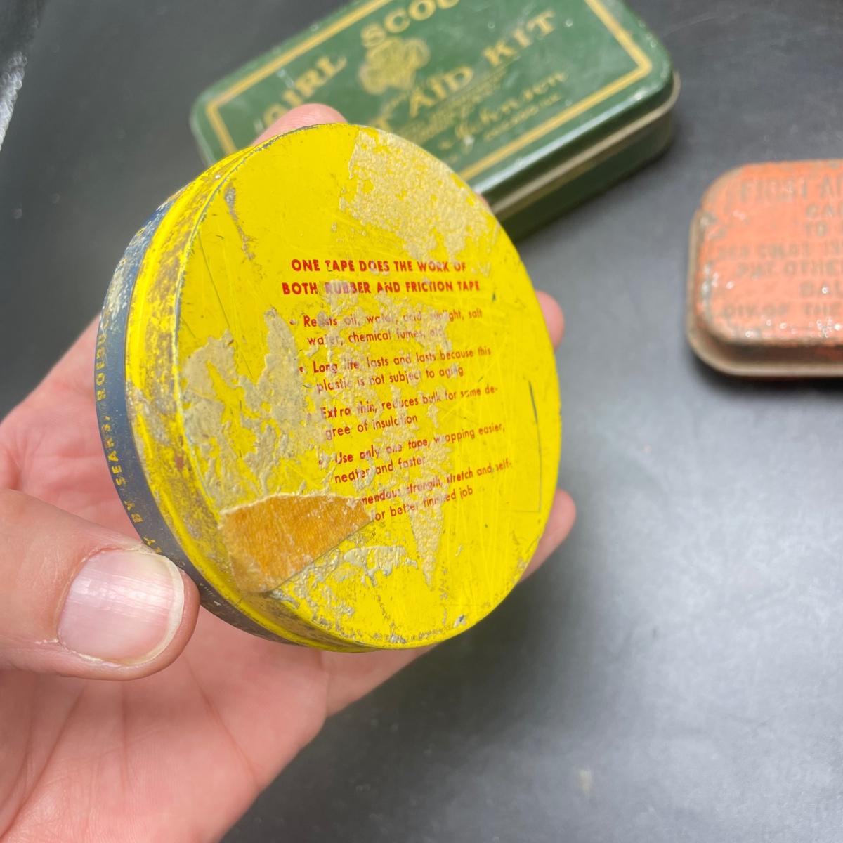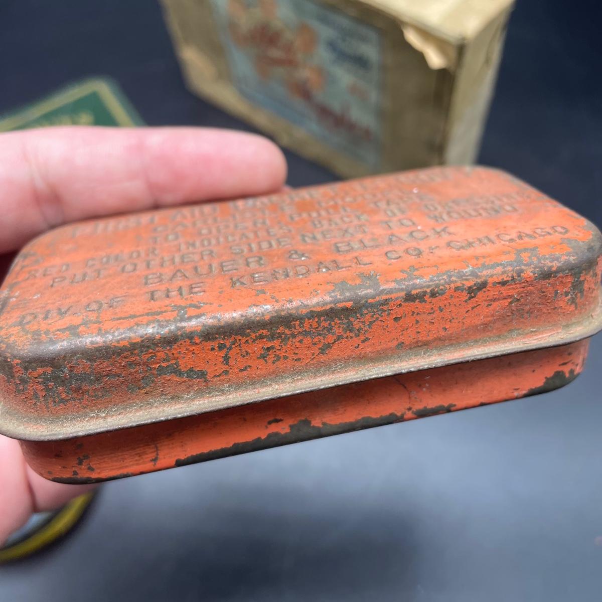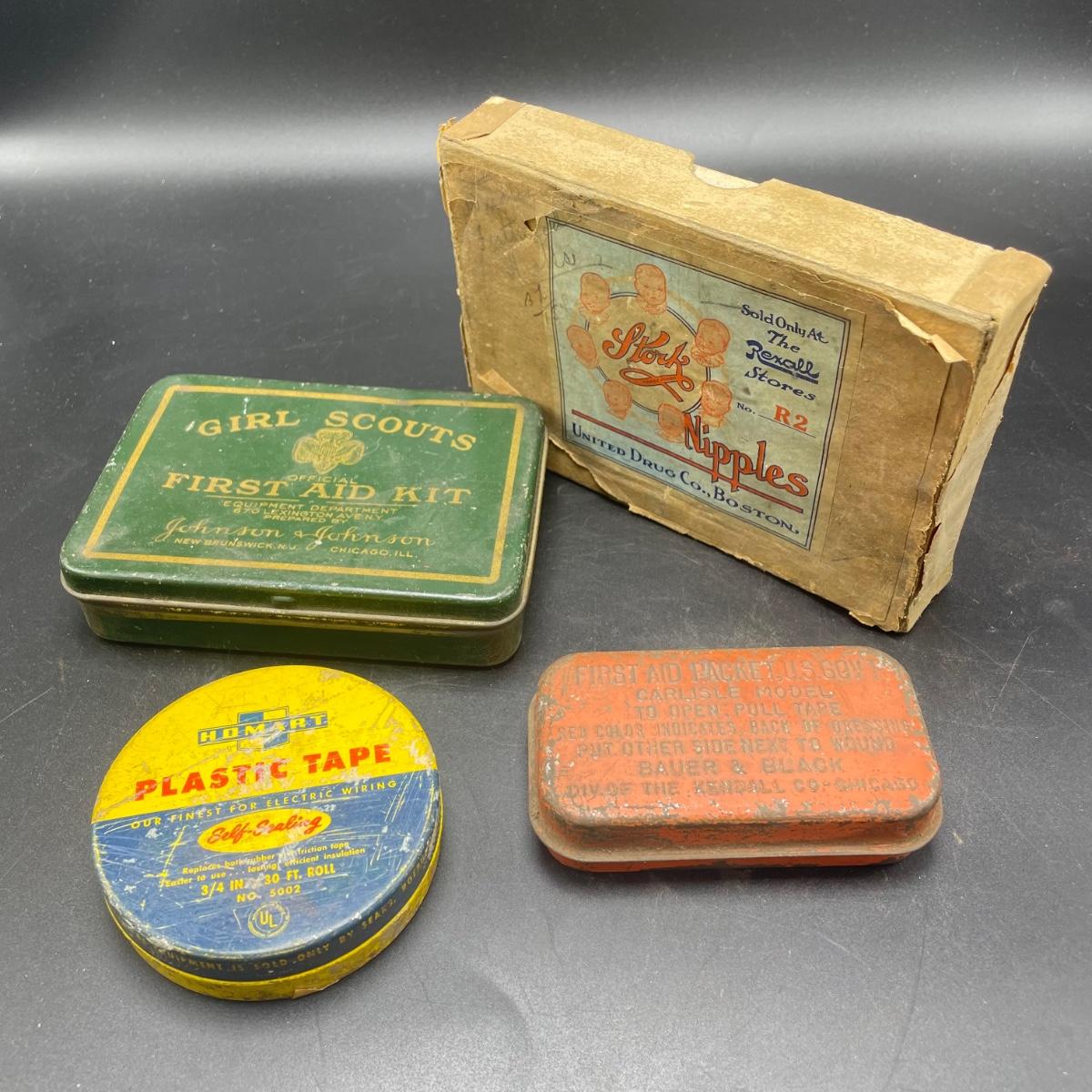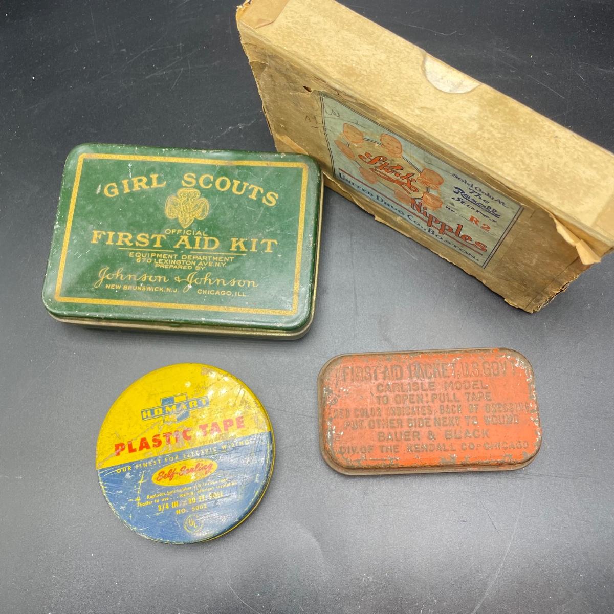 Three advertising tins. The embossed red/orange tin is a first aid packet, US Gov’t. The Girl Scouts First Aid Kit measures approximately 5.25” x 3.25” x 1.25”. Lot offers a Homart 3”d tin for tape of electric wiring and a paper box of Stork Nipples. See images. Shipping available.
