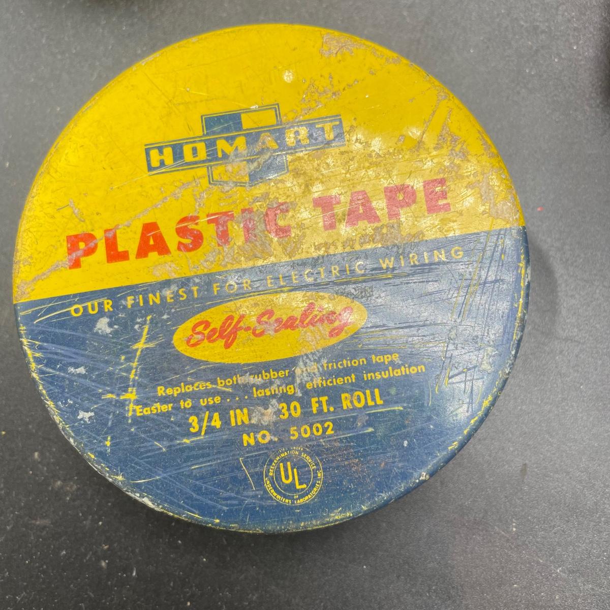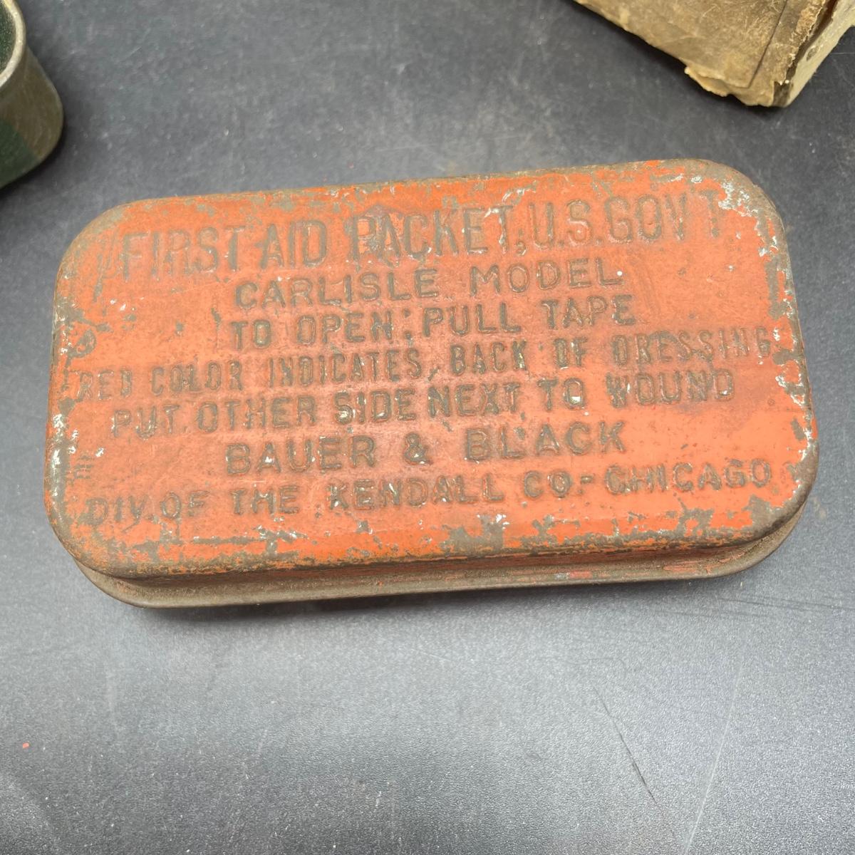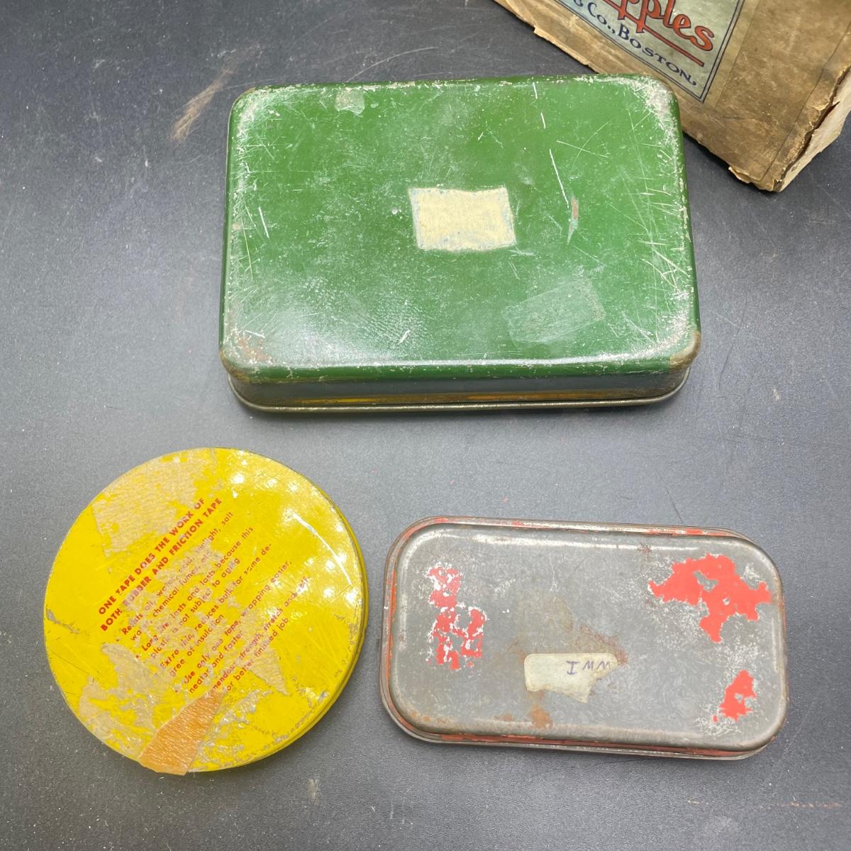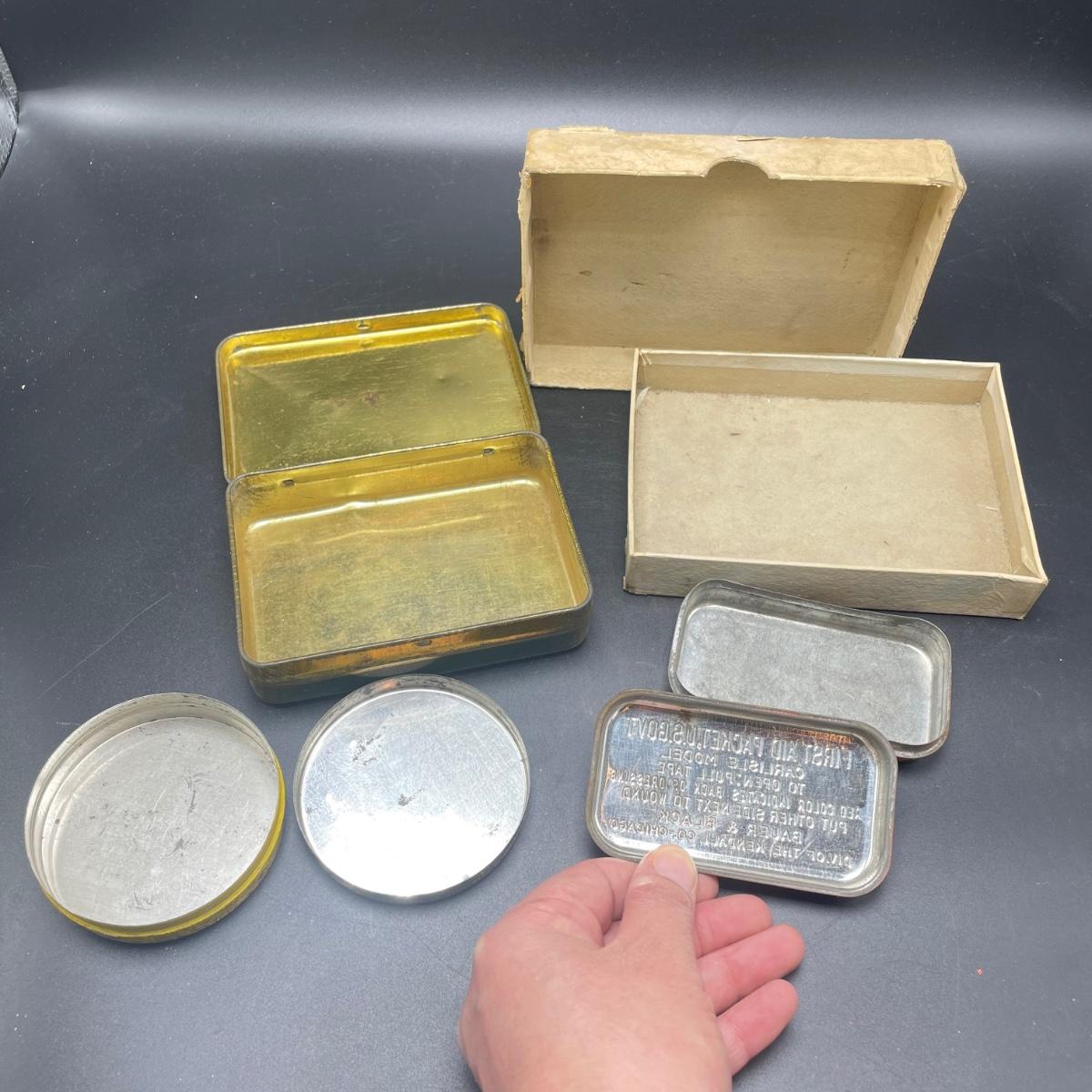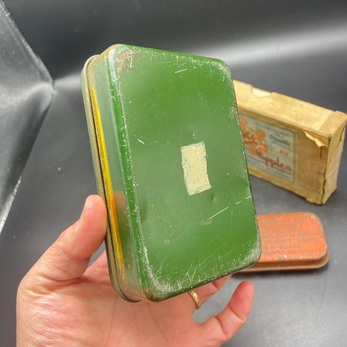 Three advertising tins. The embossed red/orange tin is a first aid packet, US Gov’t. The Girl Scouts First Aid Kit measures approximately 5.25” x 3.25” x 1.25”. Lot offers a Homart 3”d tin for tape of electric wiring and a paper box of Stork Nipples. See images. Shipping available.