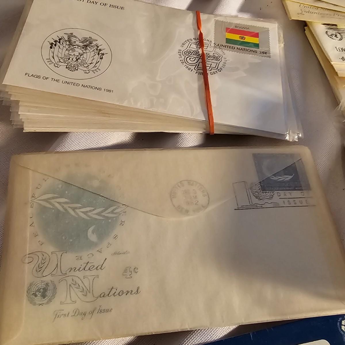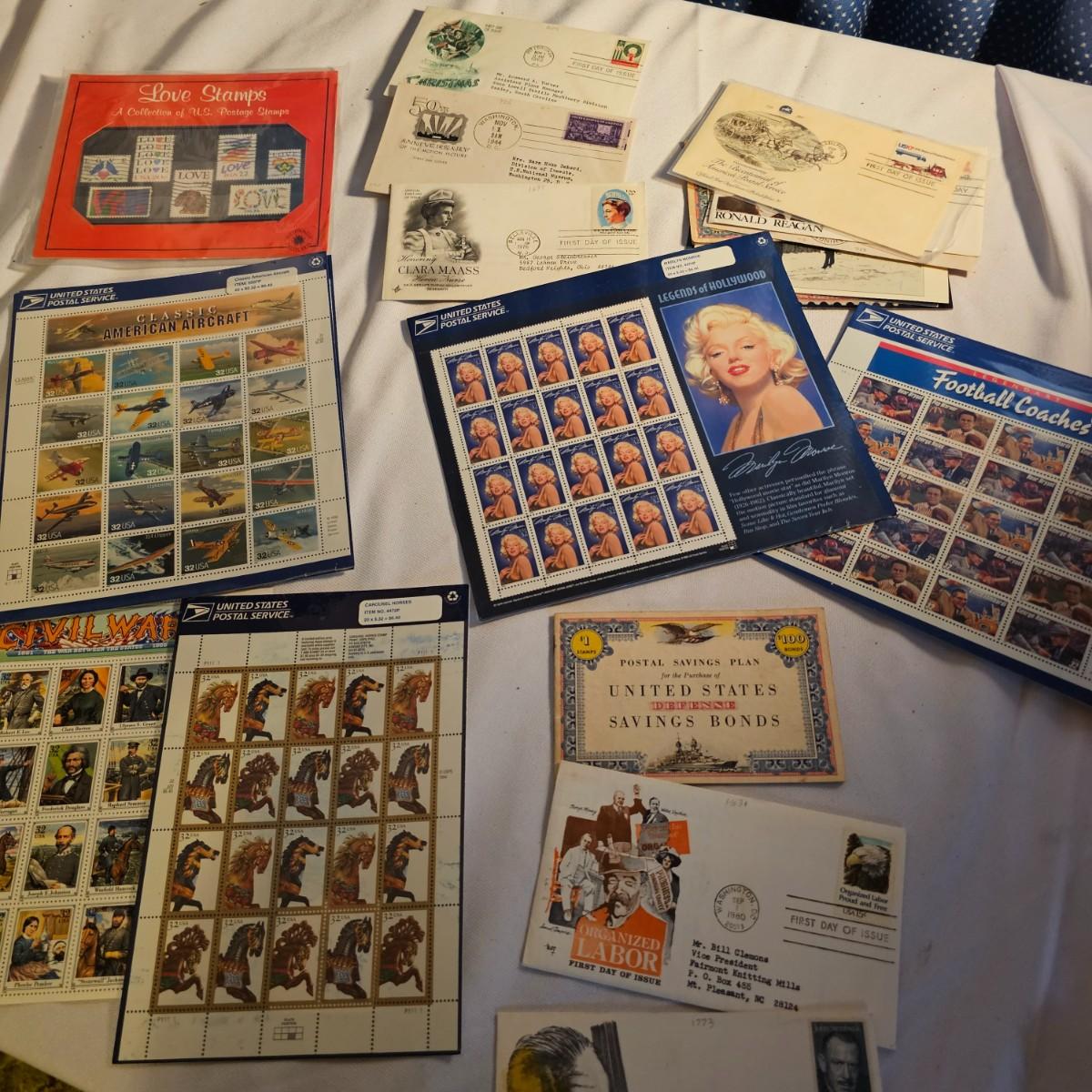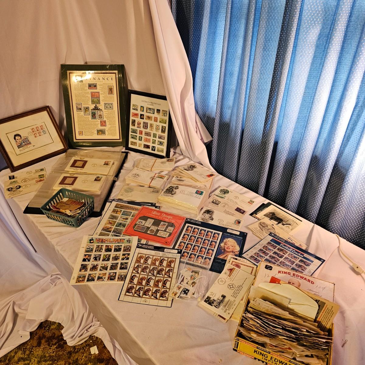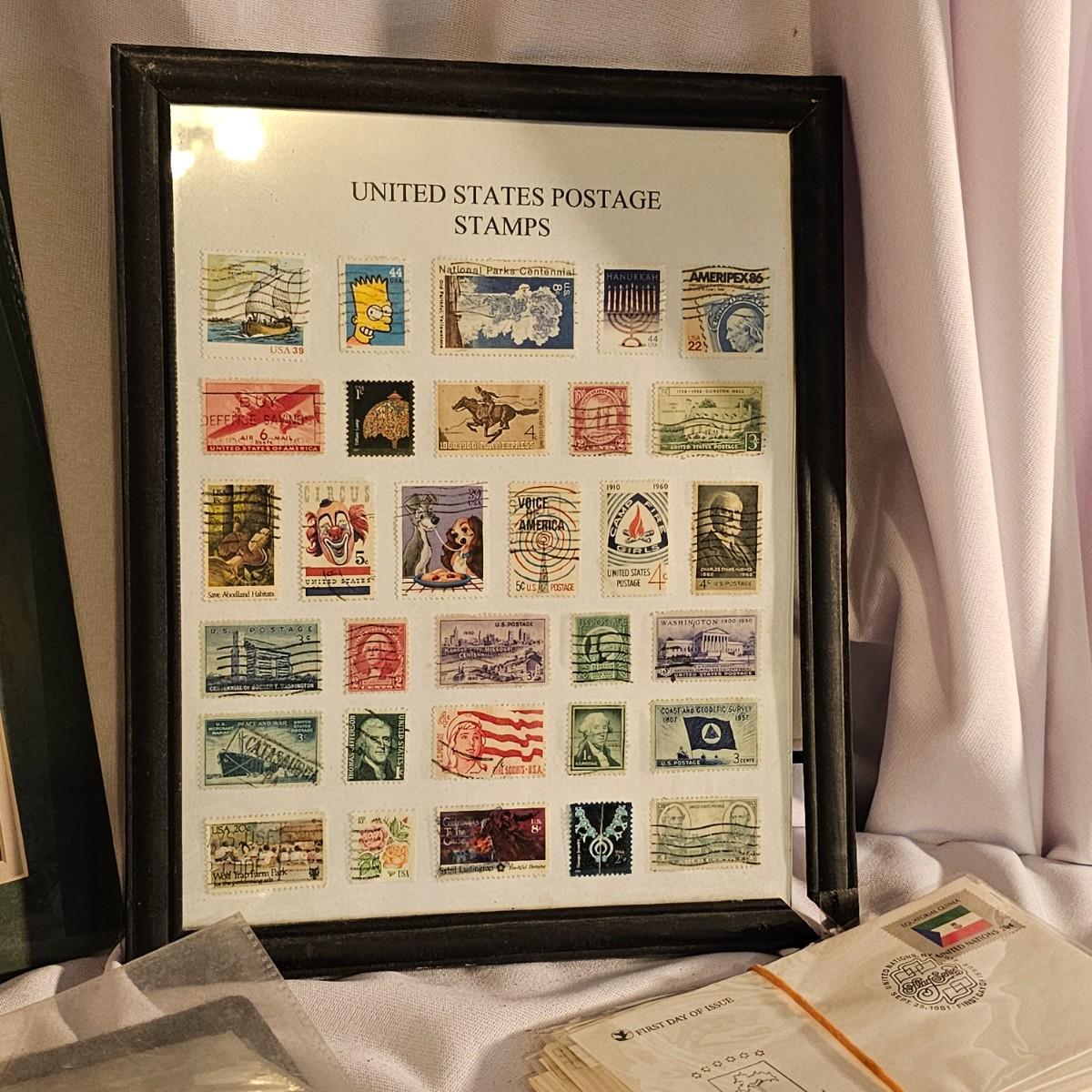 Old, new, in binders, others loose in boxes, there are hundreds of stamps and first day covers in this collection. United Nations series, World War II items, movies, icons ,genres from all over. Too many items to show all, see photos for details. Largest frame measures 9.5” x 12”. Shipping available.