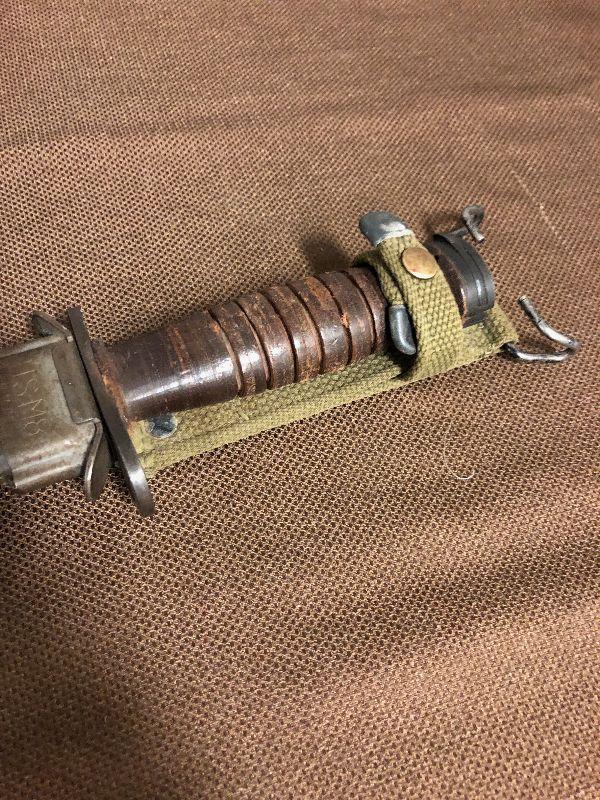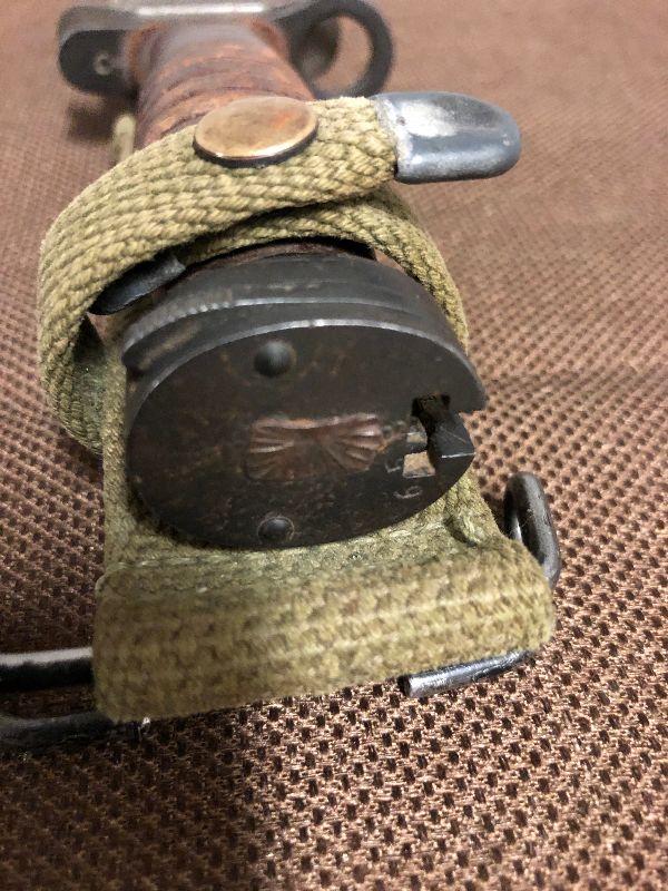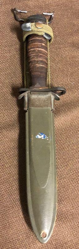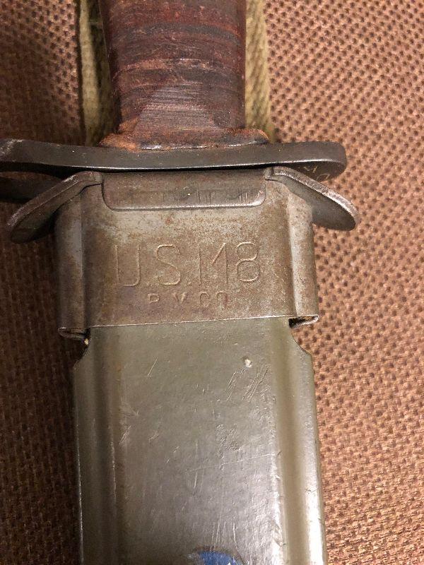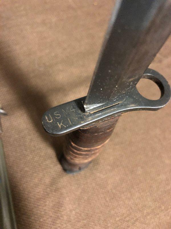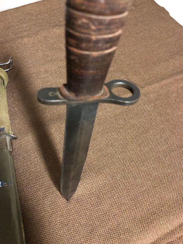 Here is an early production model U.S. M4 Bayonet by Kinfolks found with an US M8 scabbard with frog by B.M.Co.(Beckwith Manufacturing Co)...Designed to fit the M1 Carbine...produced for a short time toward the end of the war...between 1944 and 1945...The pommel is marked with the initials SP for the Standard Products Company and the Ordinance mark...six groove leather handle and Parkerized blade...Hits all the points...Some normal use and age...light oxidation on outer hardware with time...Great shape on the 6 3/4" blade...Tight...no play...A nice one for your collection of World War Two edged weapons...