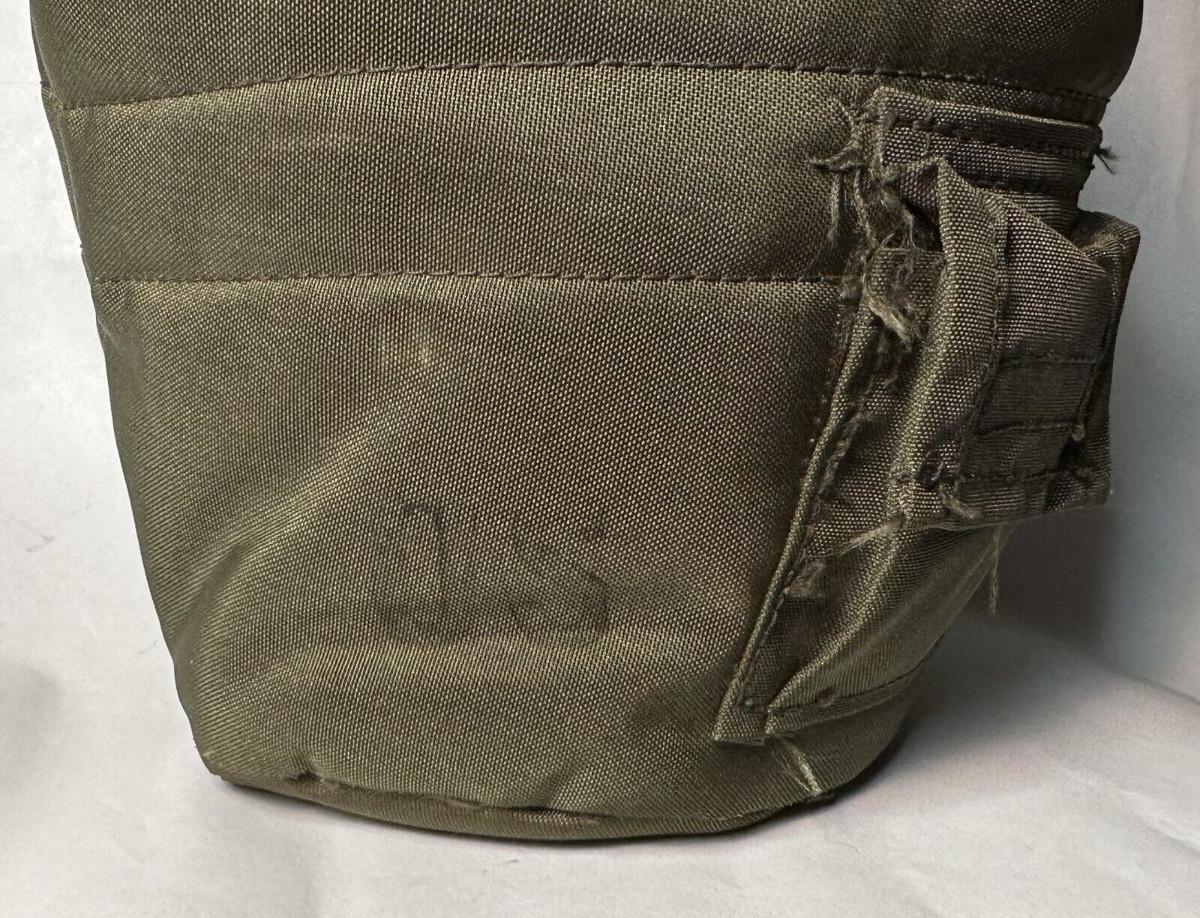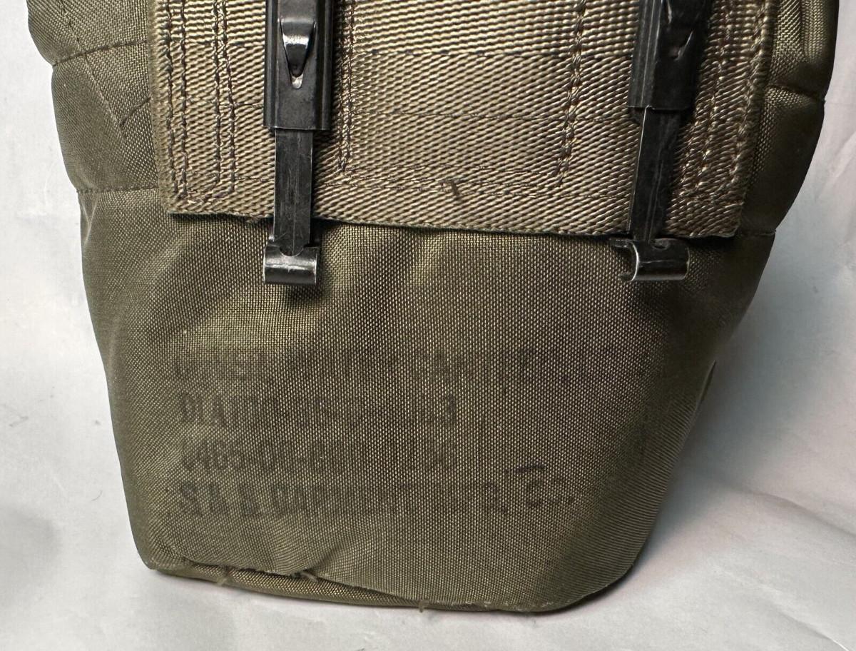 U.S. Military 1 quart canteen and cover issued in 1986...This is an M-1961 Canteen with a modified Type 2 cap designed to connect with the M-17A1 protective mask through a drinking tube..The plastic canteen made by Handcrest...The insulated snap on cover is by S & S Garment Mfg...pocket for water tabs..ALICE clips...Includes aluminum cup..As shown.