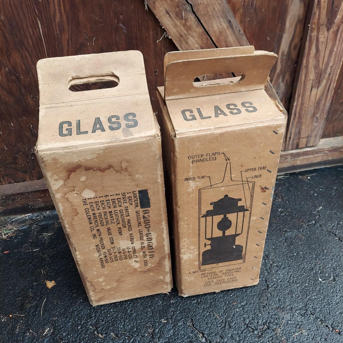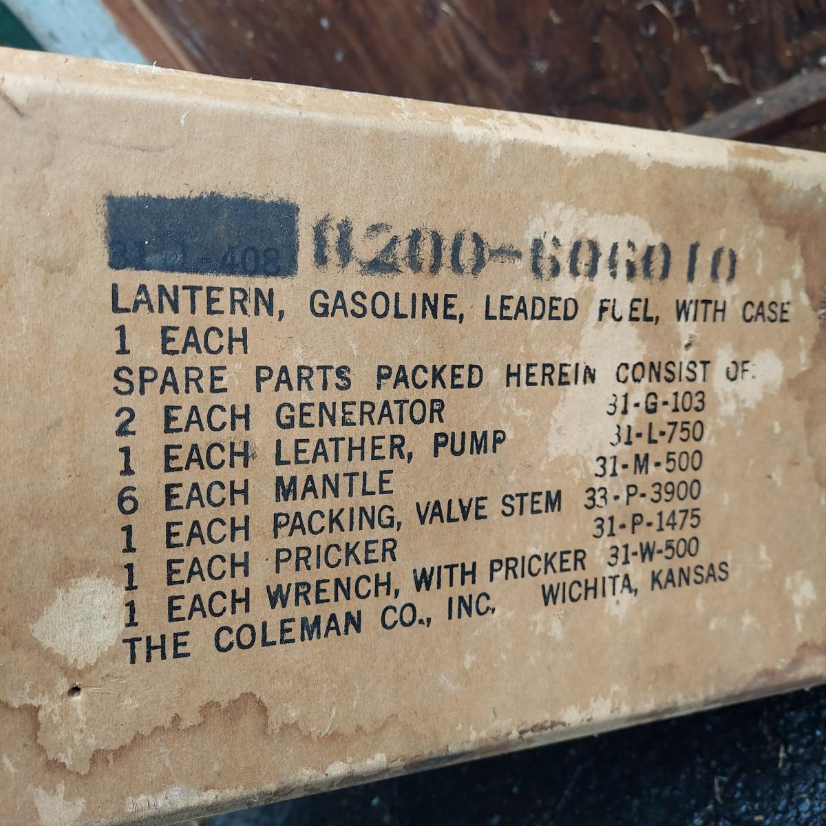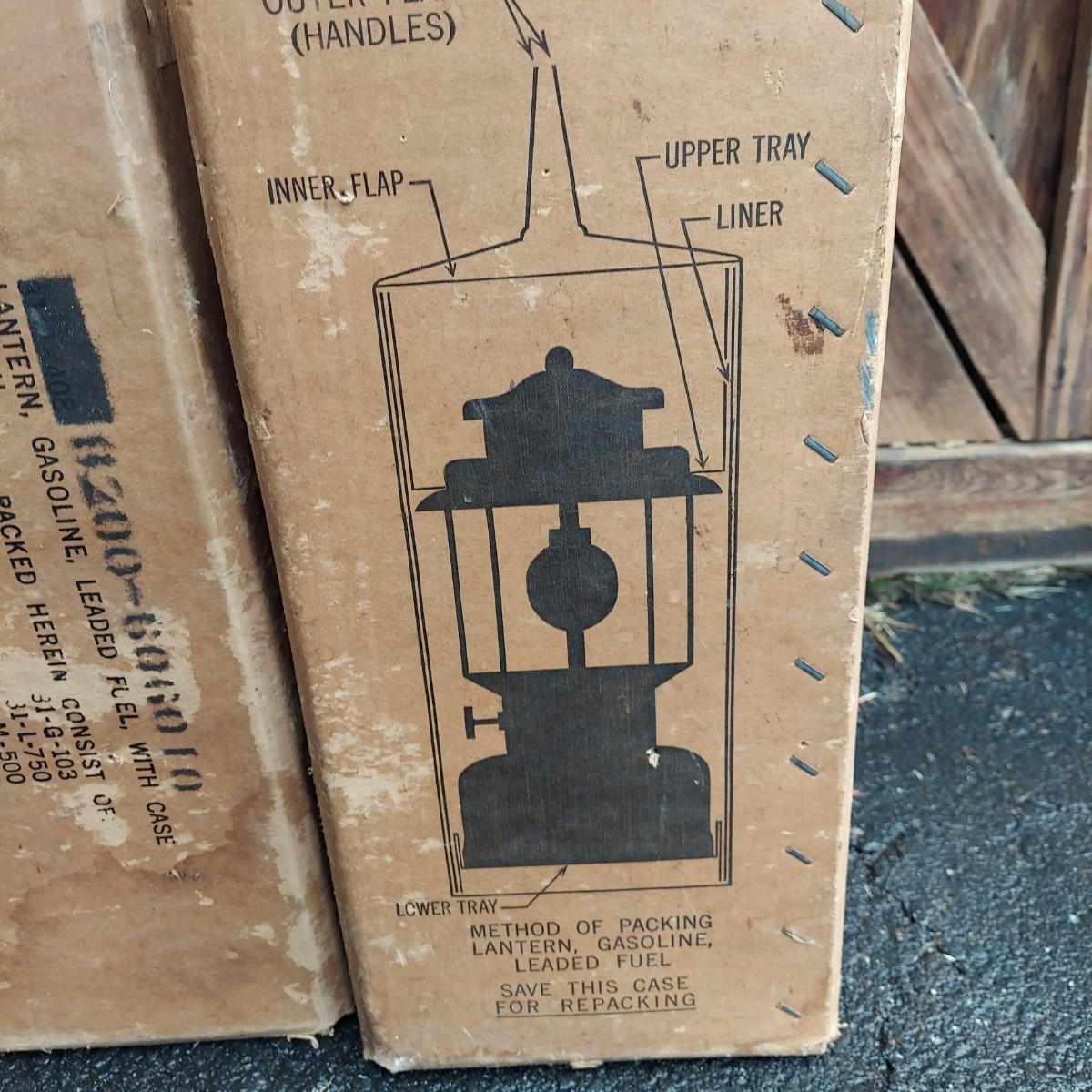 Two metal lanterns that appear to be US Military issued gasoline lanterns made by Coleman. Each lantern is 14"H and comes in its original box. Some overall condition issues due to age. One lantern is seemingly contains fuel but contents cannot be verified. Please see photos for details. Local Pickup Only
