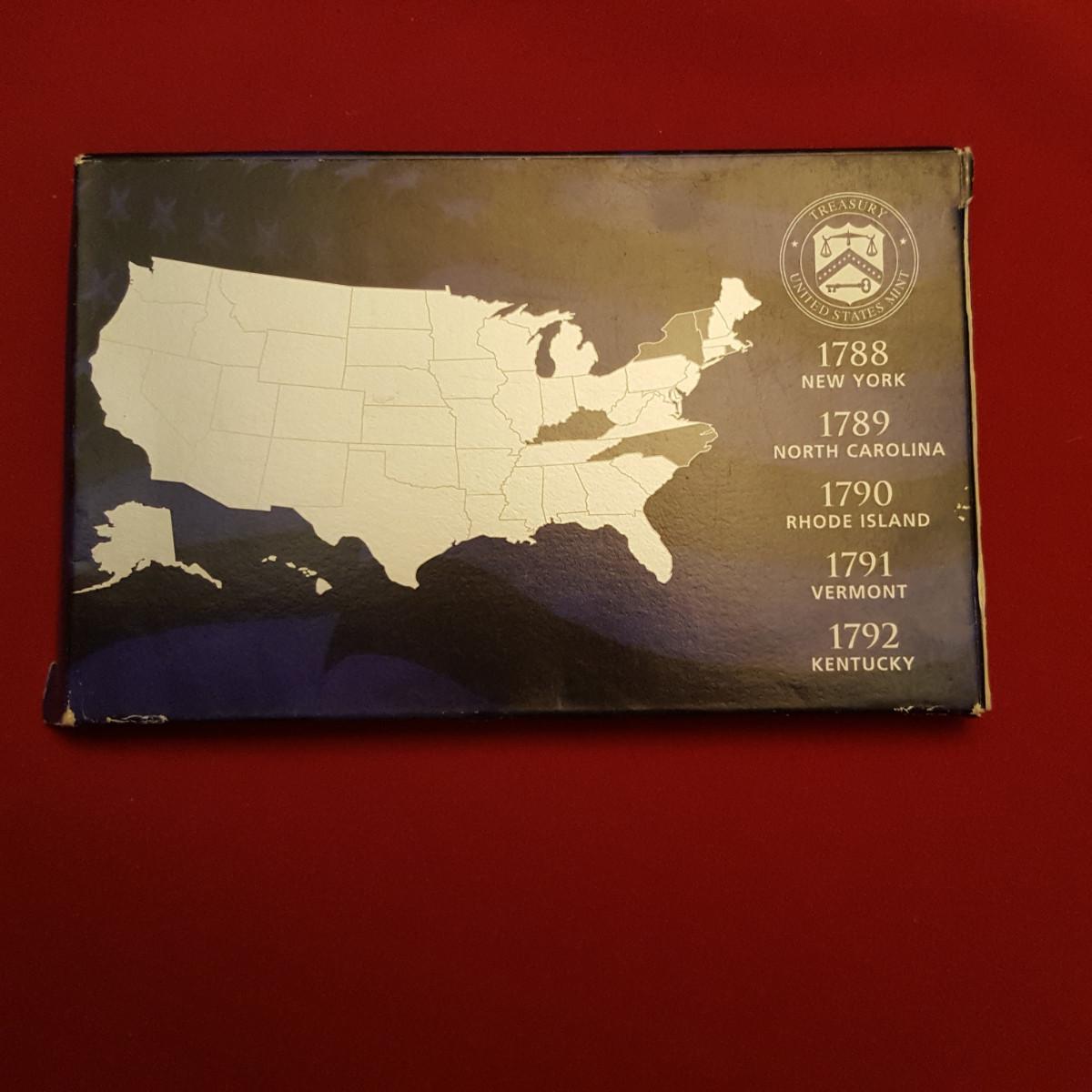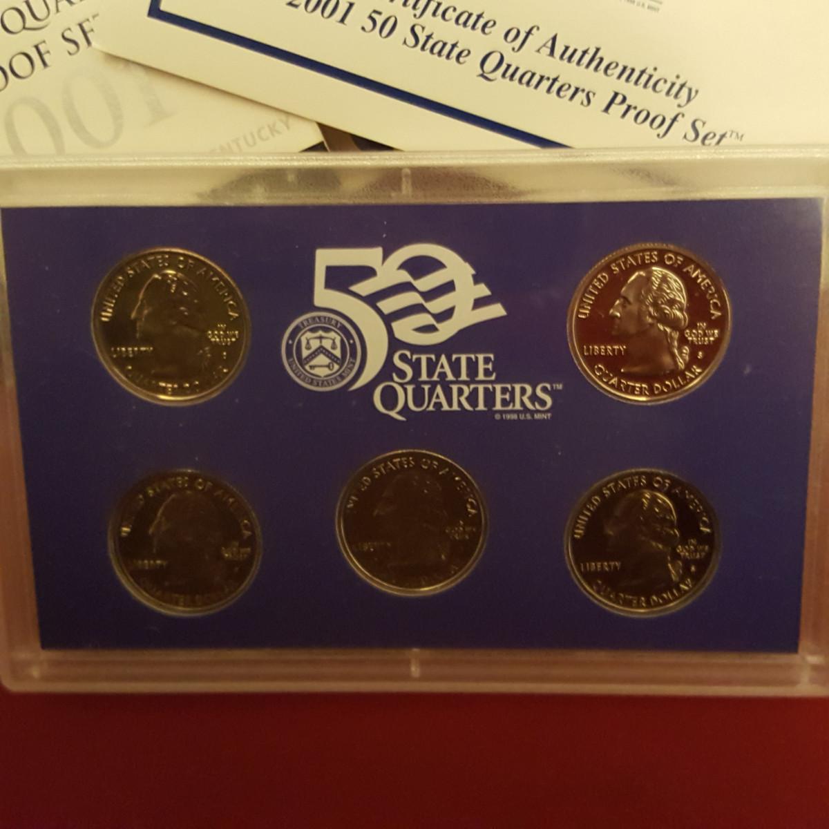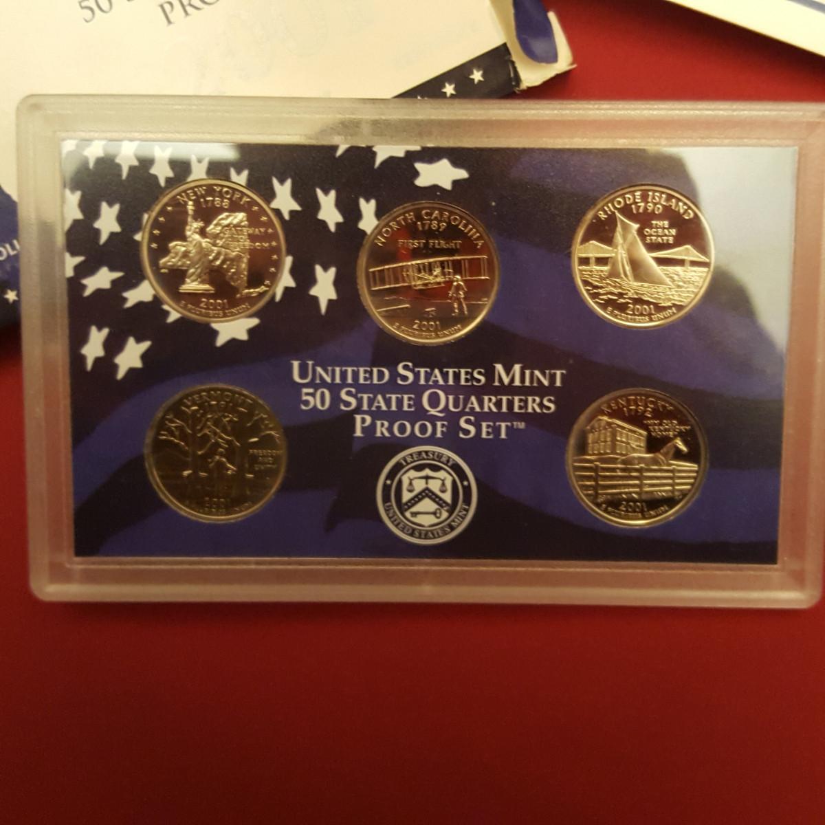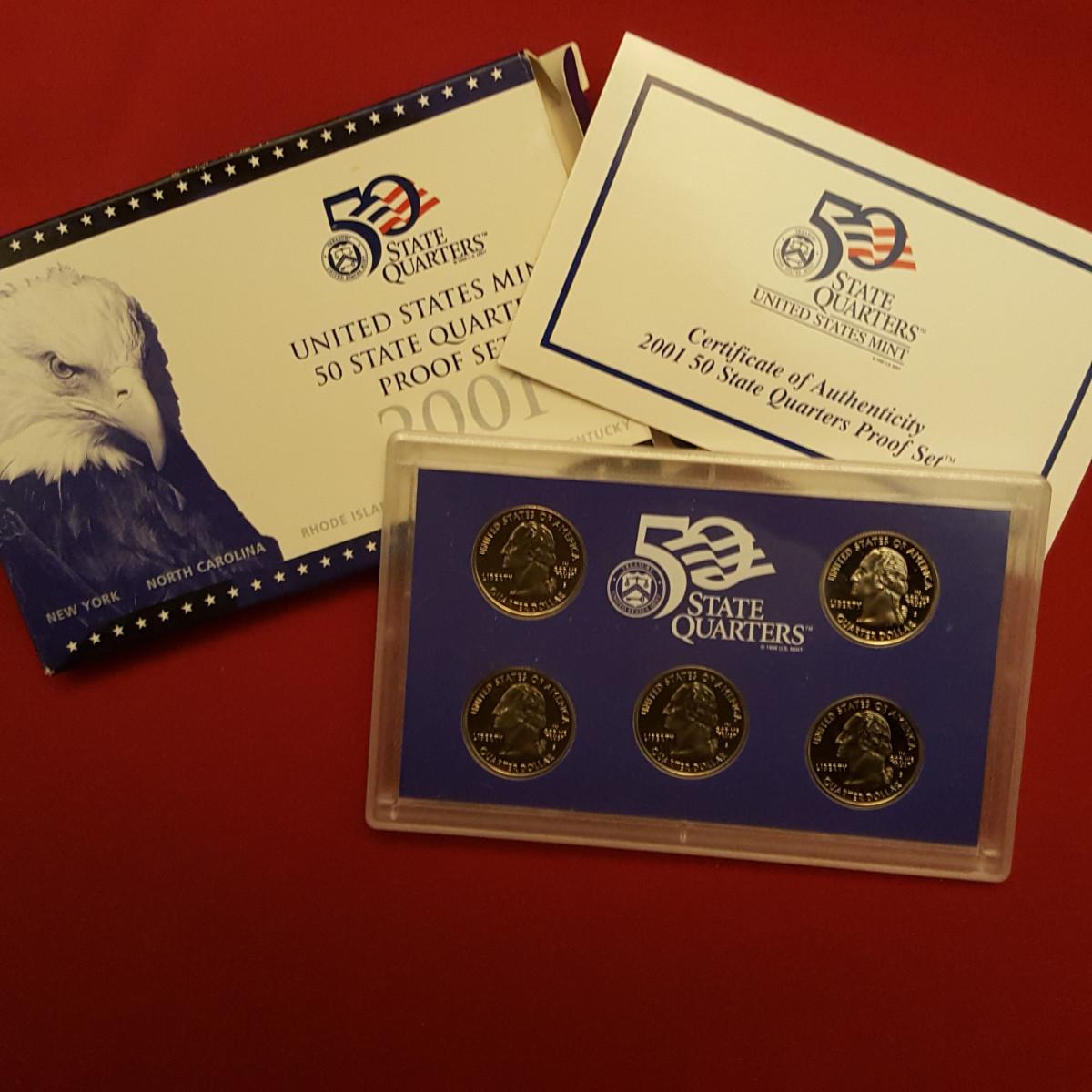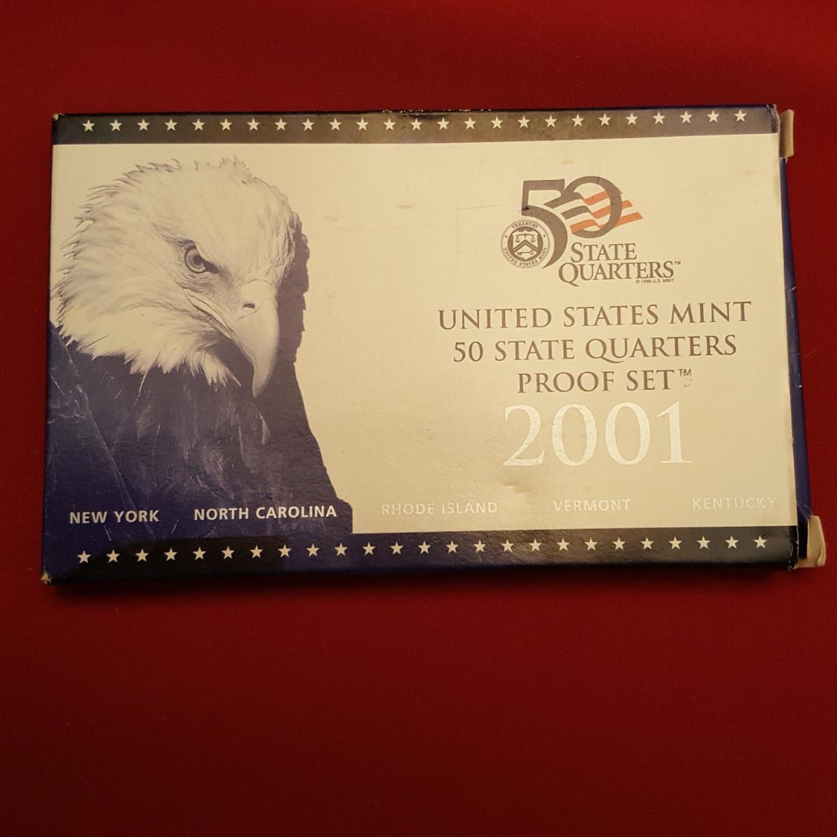 This auction lot is for a US Mint 2001 Quarters Proof Set. Issued in 2001 the set includes quarters from New York, North Carolina, Rhode Island, Vermont and Kentucky. In original box with authentication pamphlet included.