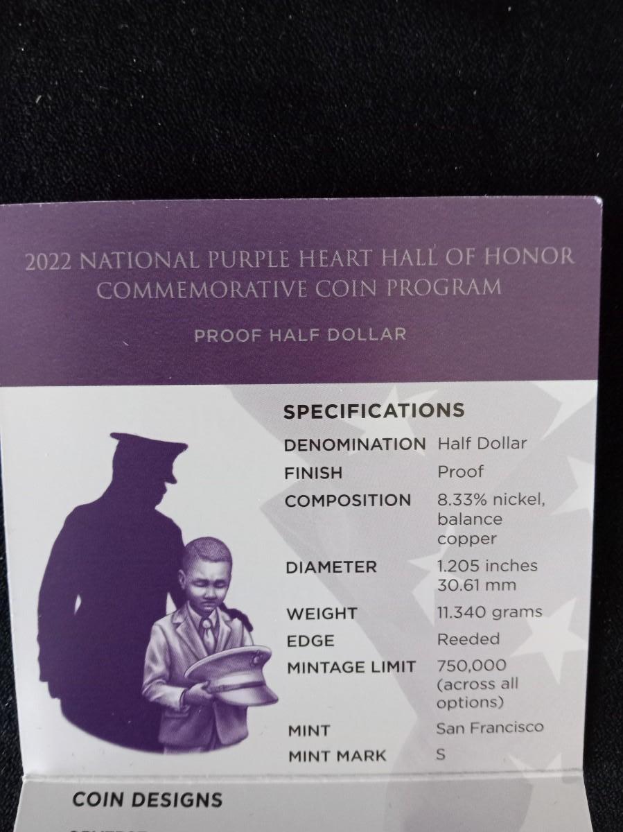 US MINT 2022 NATIONAL PURPLE HEART HALL OF HONOR COMMEMORATIVE PROOF CLAD HALF DOLLAR