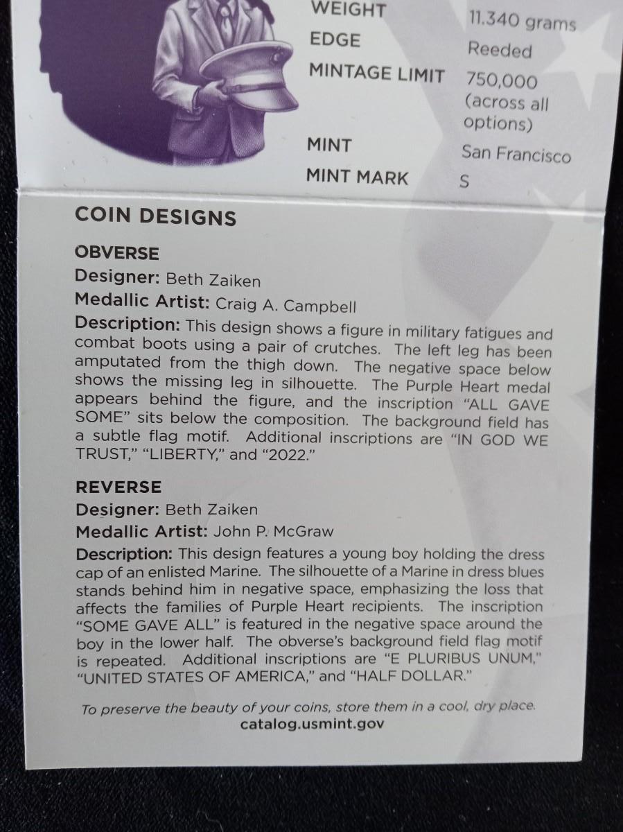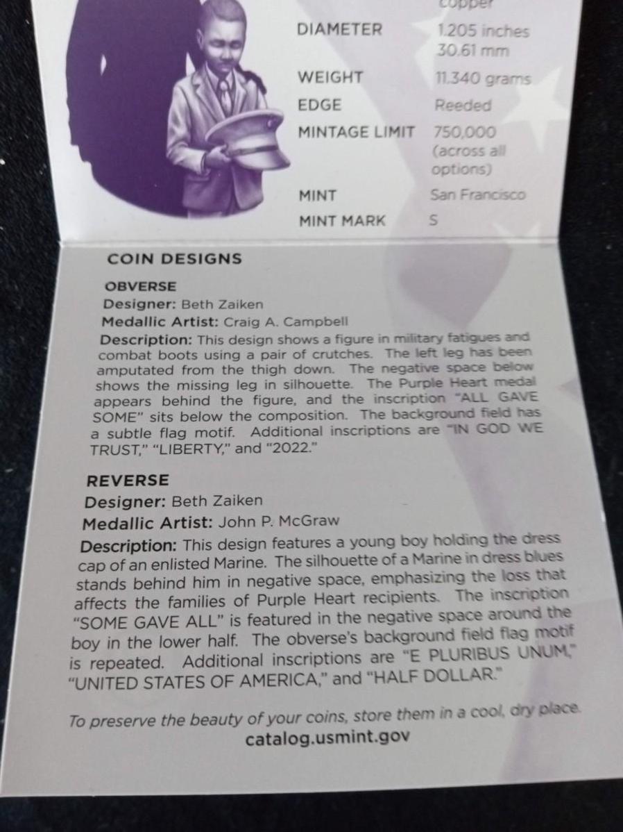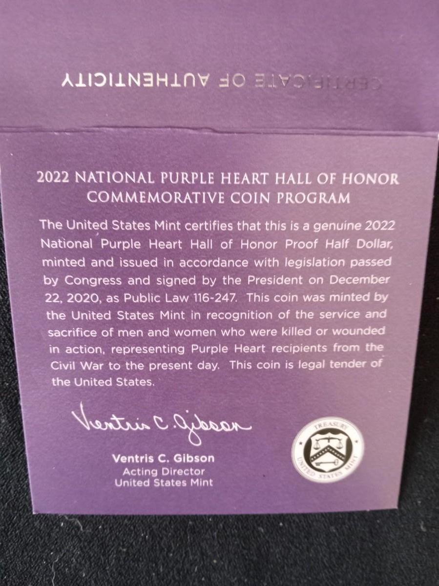 US MINT 2022 NATIONAL PURPLE HEART HALL OF HONOR COMMEMORATIVE PROOF CLAD HALF DOLLAR